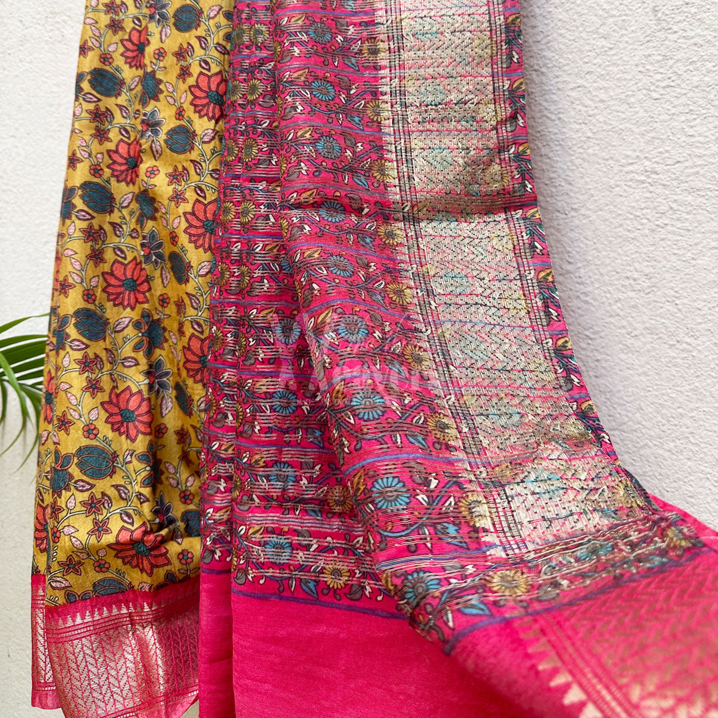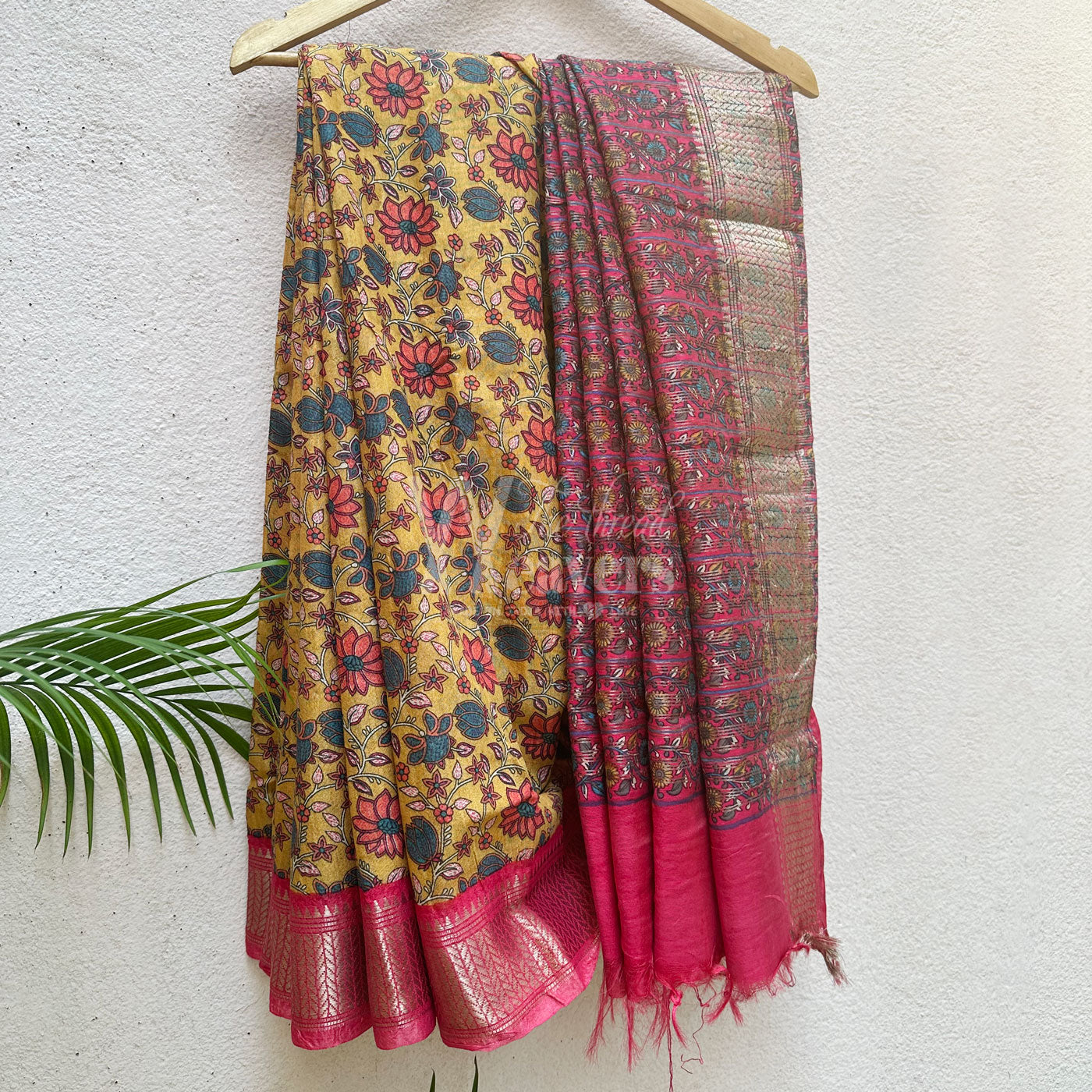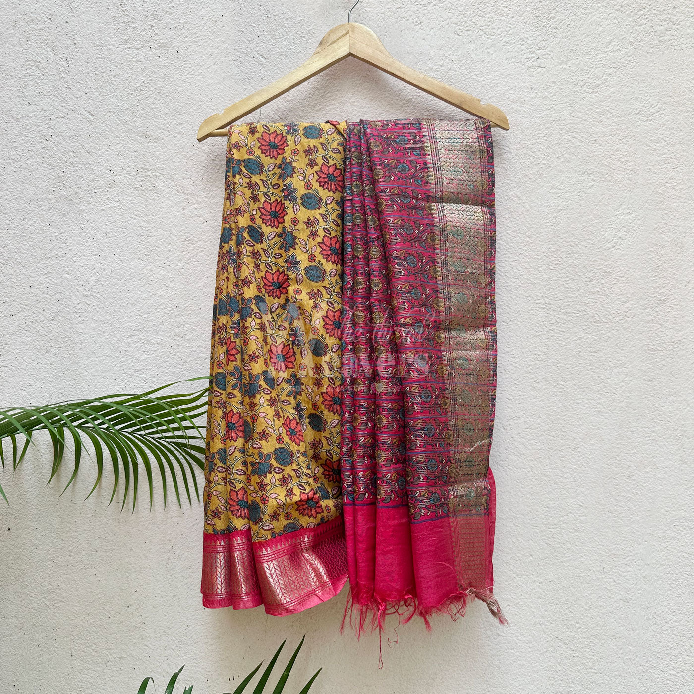 The saree boasts a delicate Chintz print on a beautiful creamish yellow base, perfect for those who appreciate subtle yet striking designs. The contrast pink pallu and border add a vibrant touch, making this saree a standout piece for any occasion, especially weddings. The combination of traditional craftsmanship and contemporary aesthetics ensures you'll look graceful and stylish.