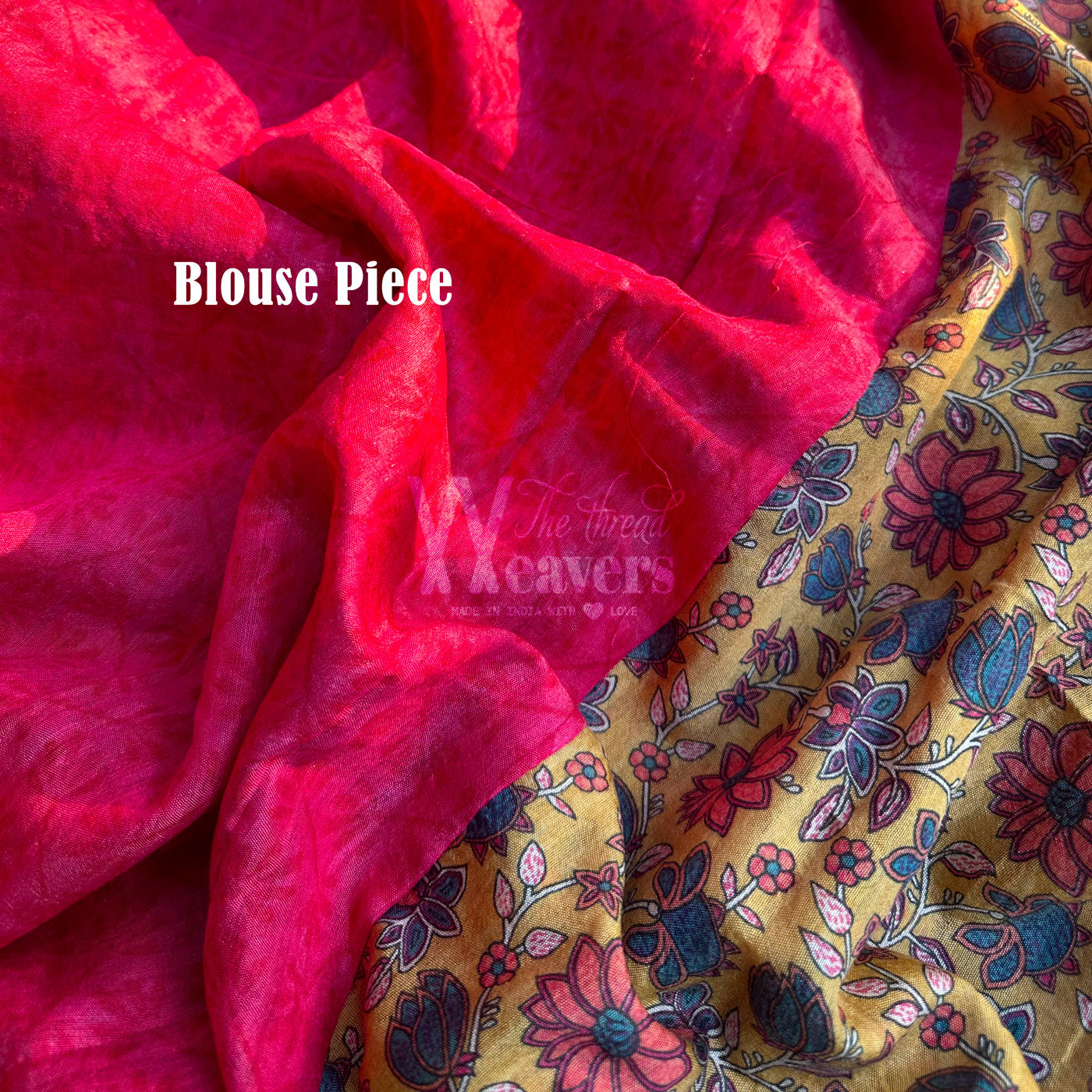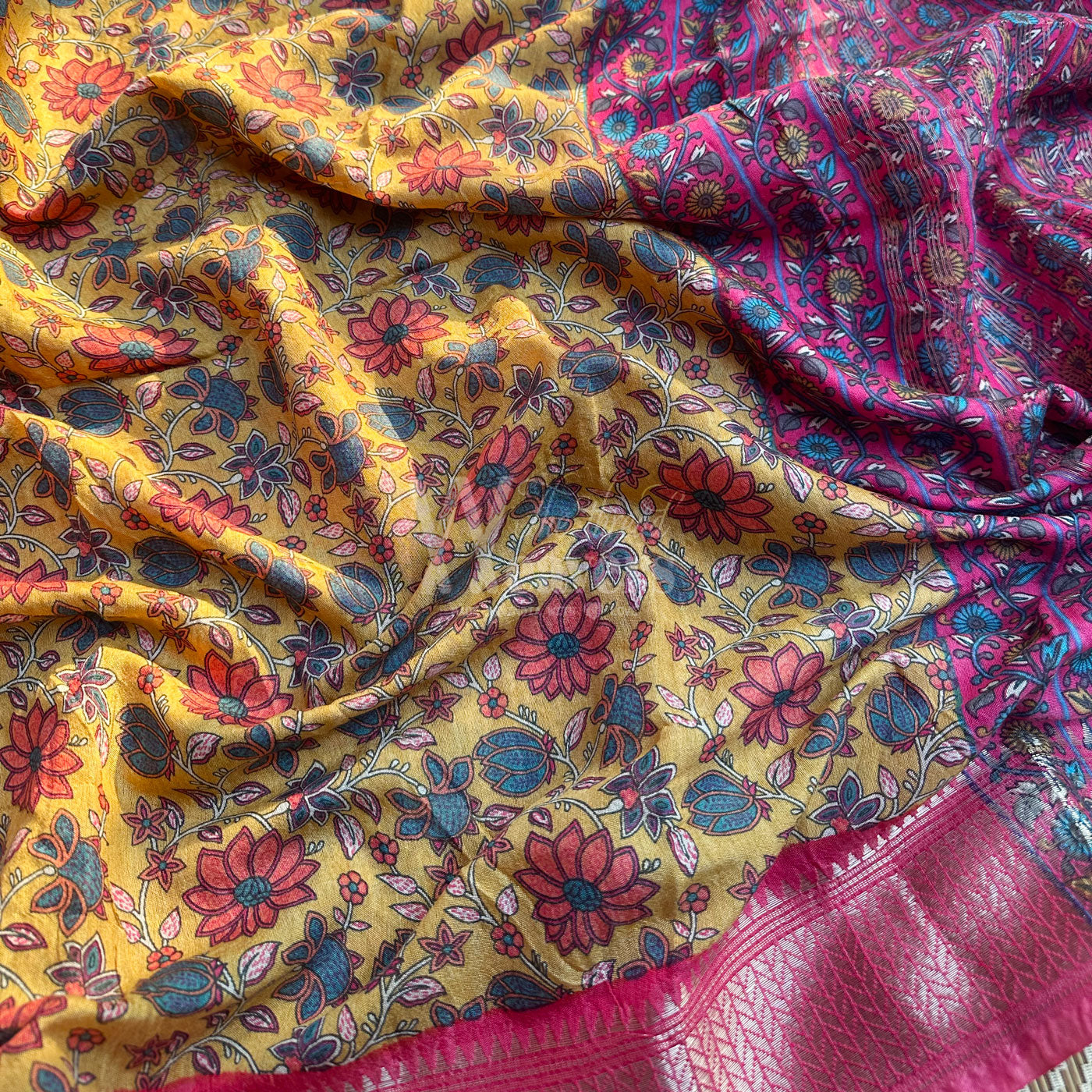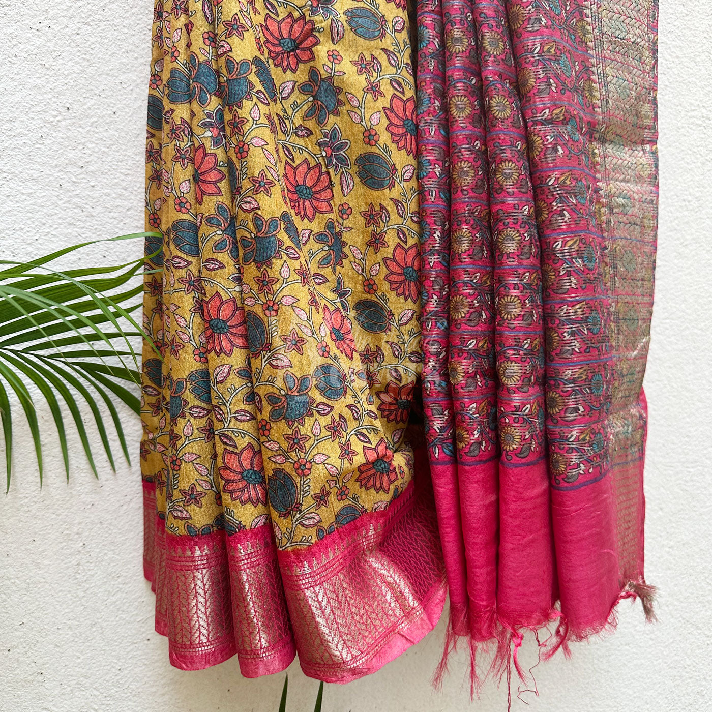 The saree boasts a delicate Chintz print on a beautiful creamish yellow base, perfect for those who appreciate subtle yet striking designs. The contrast pink pallu and border add a vibrant touch, making this saree a standout piece for any occasion, especially weddings. The combination of traditional craftsmanship and contemporary aesthetics ensures you'll look graceful and stylish.