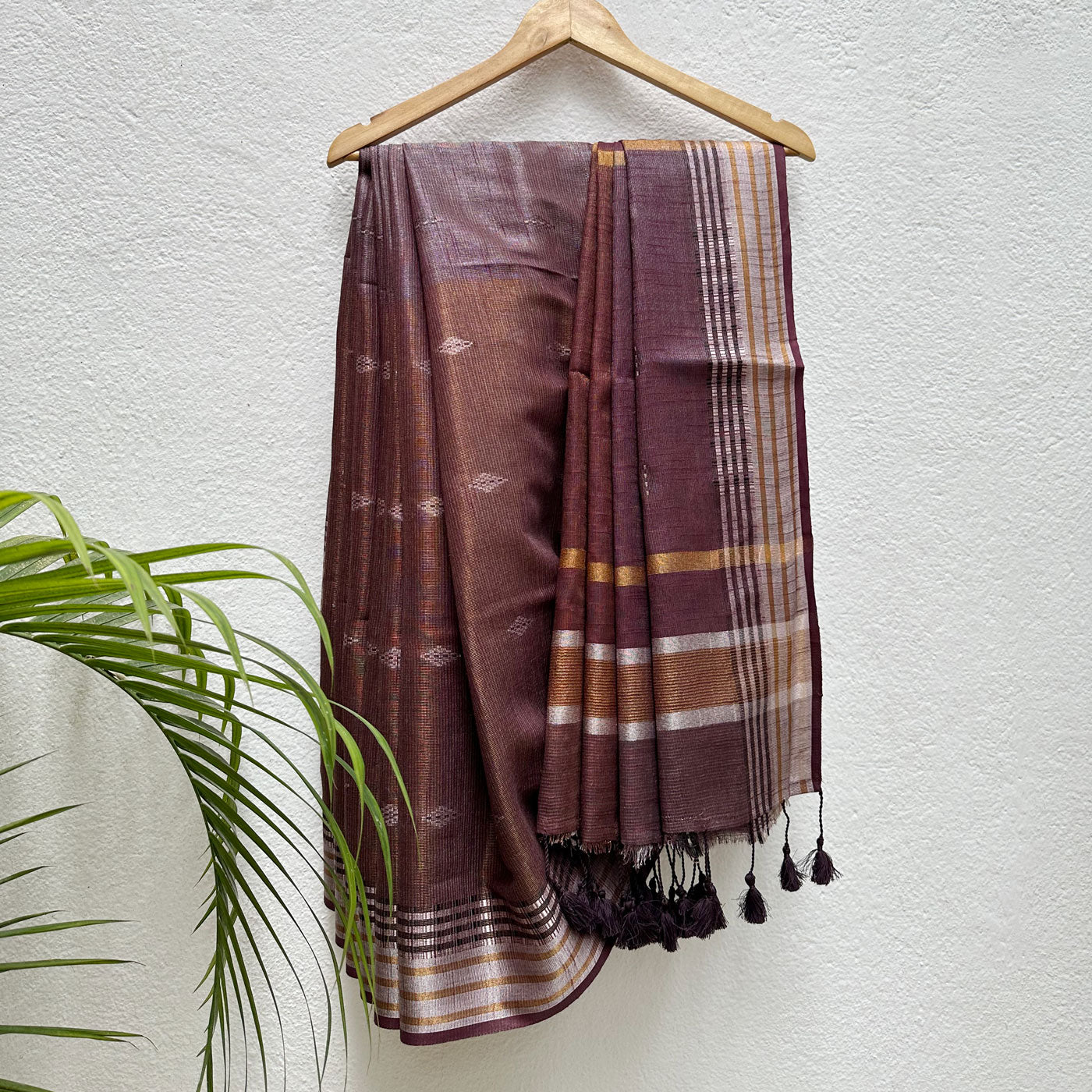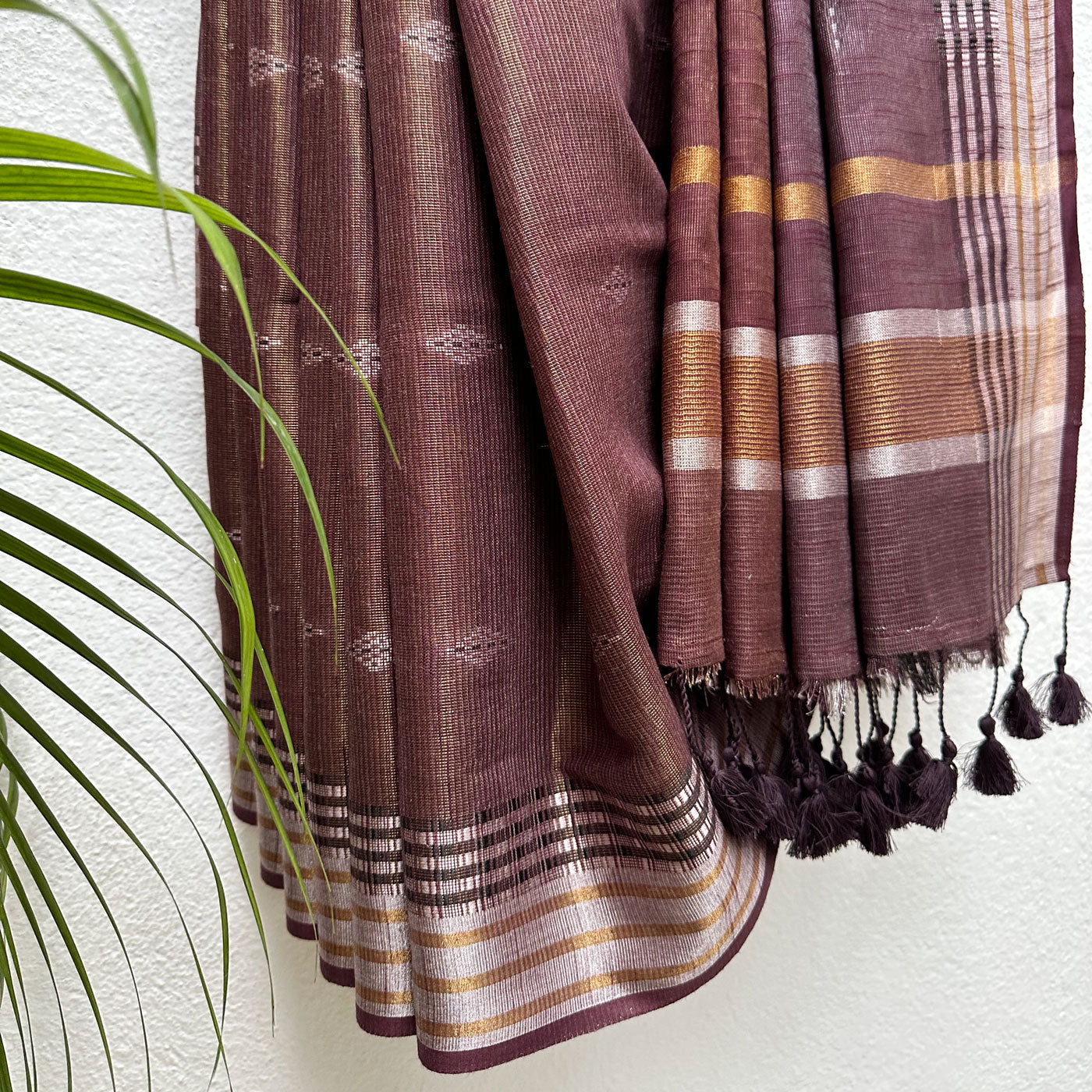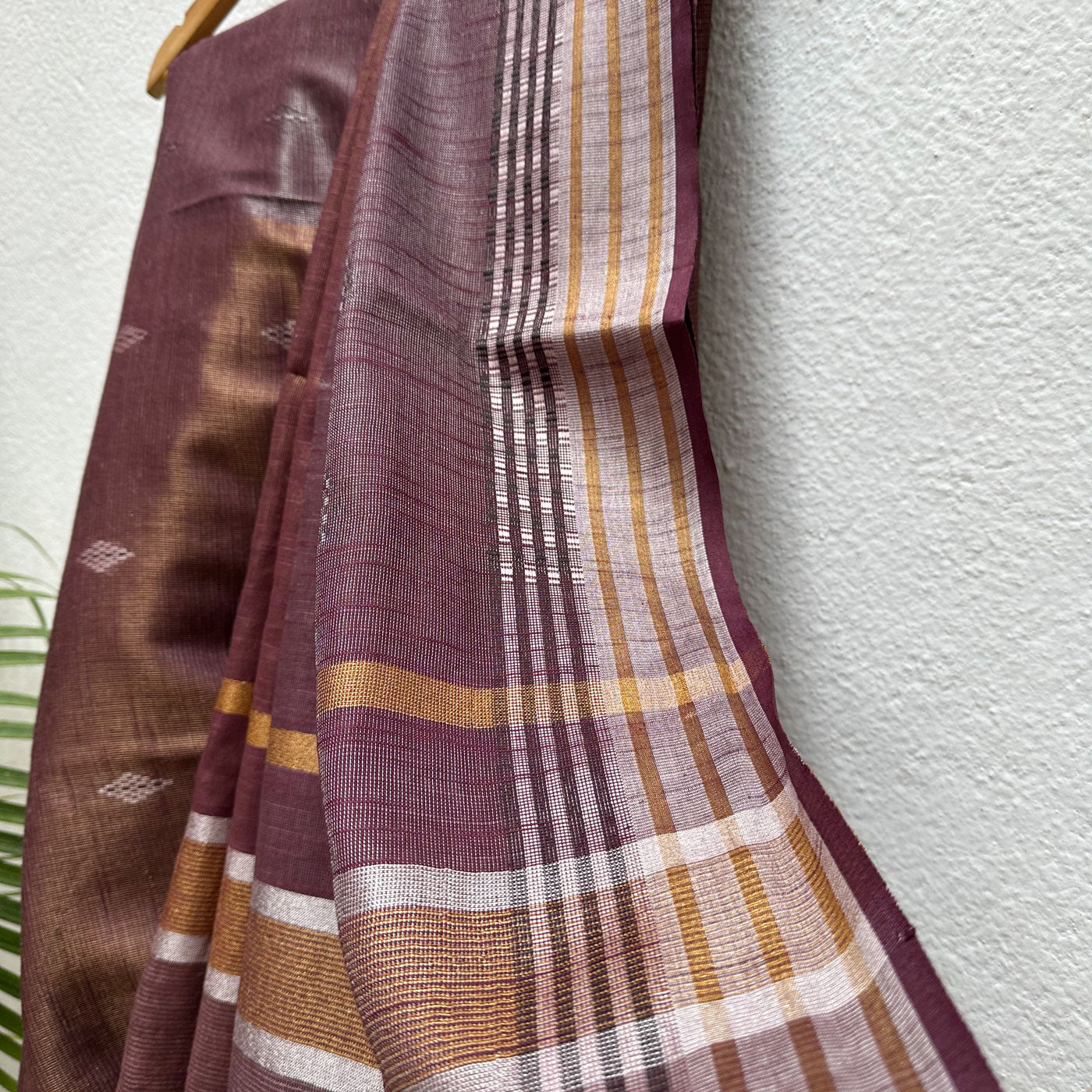 Our Amaranth Cotton Metallic Saree radiates timeless sophistication, featuring a rich, zari border, captivating striped pallu in silver and gold, and a stylish butas on the body to provide a luxurious feel. Perfect for corporate office wear, the matching tassel serves as an elegant finishing touch, adding an extra layer of refinement and charm to your wardrobe.