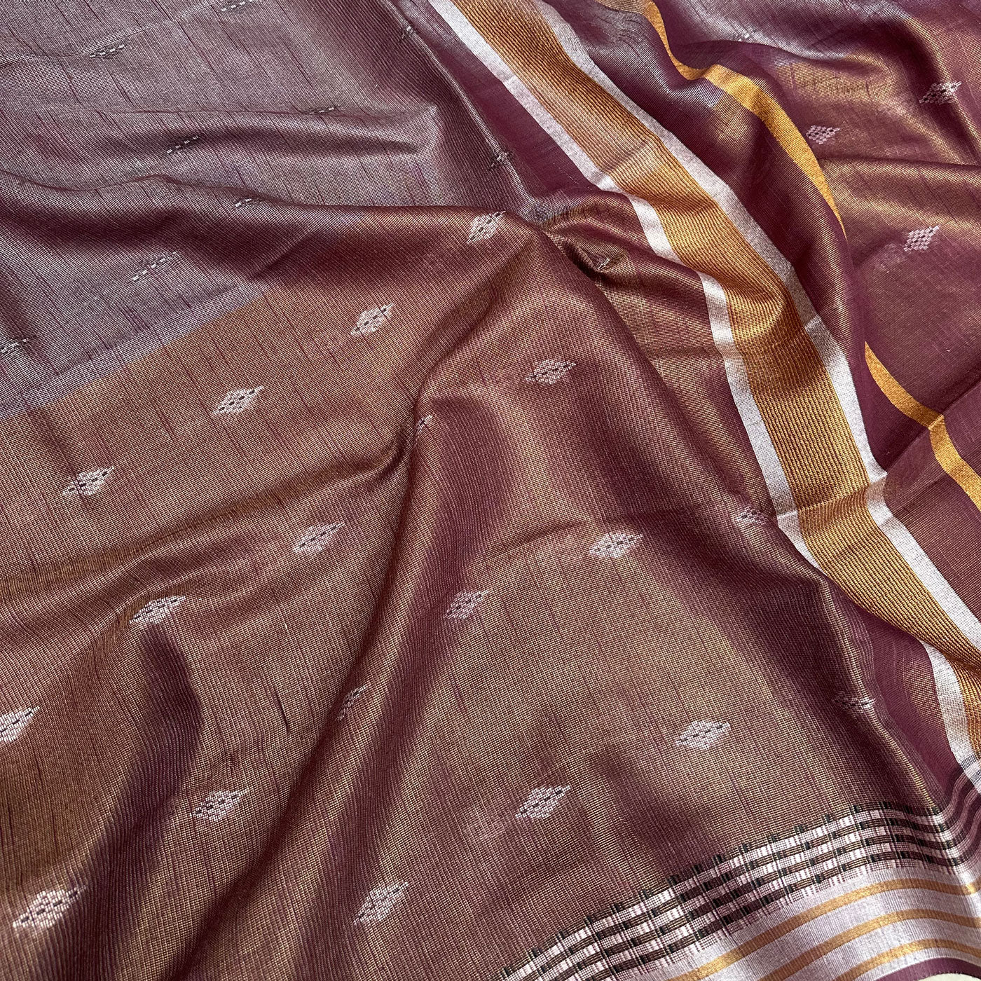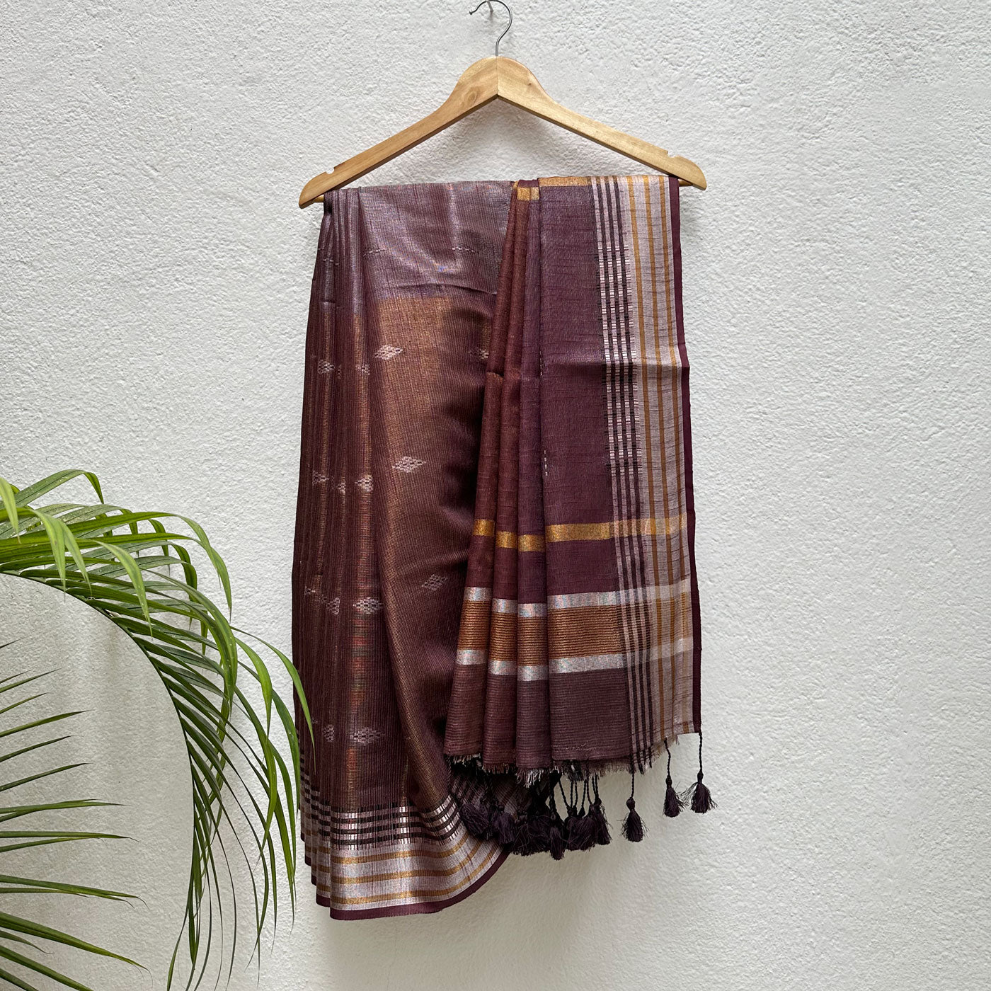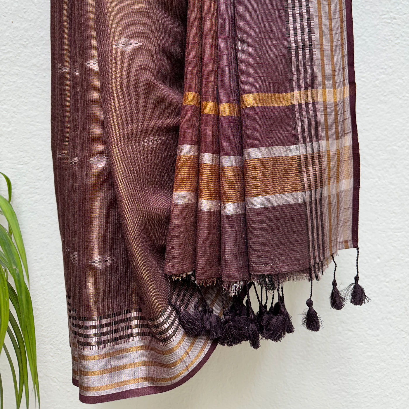 Our Amaranth Cotton Metallic Saree radiates timeless sophistication, featuring a rich, zari border, captivating striped pallu in silver and gold, and a stylish butas on the body to provide a luxurious feel. Perfect for corporate office wear, the matching tassel serves as an elegant finishing touch, adding an extra layer of refinement and charm to your wardrobe.
