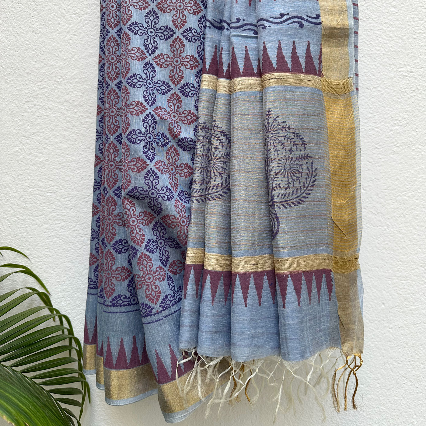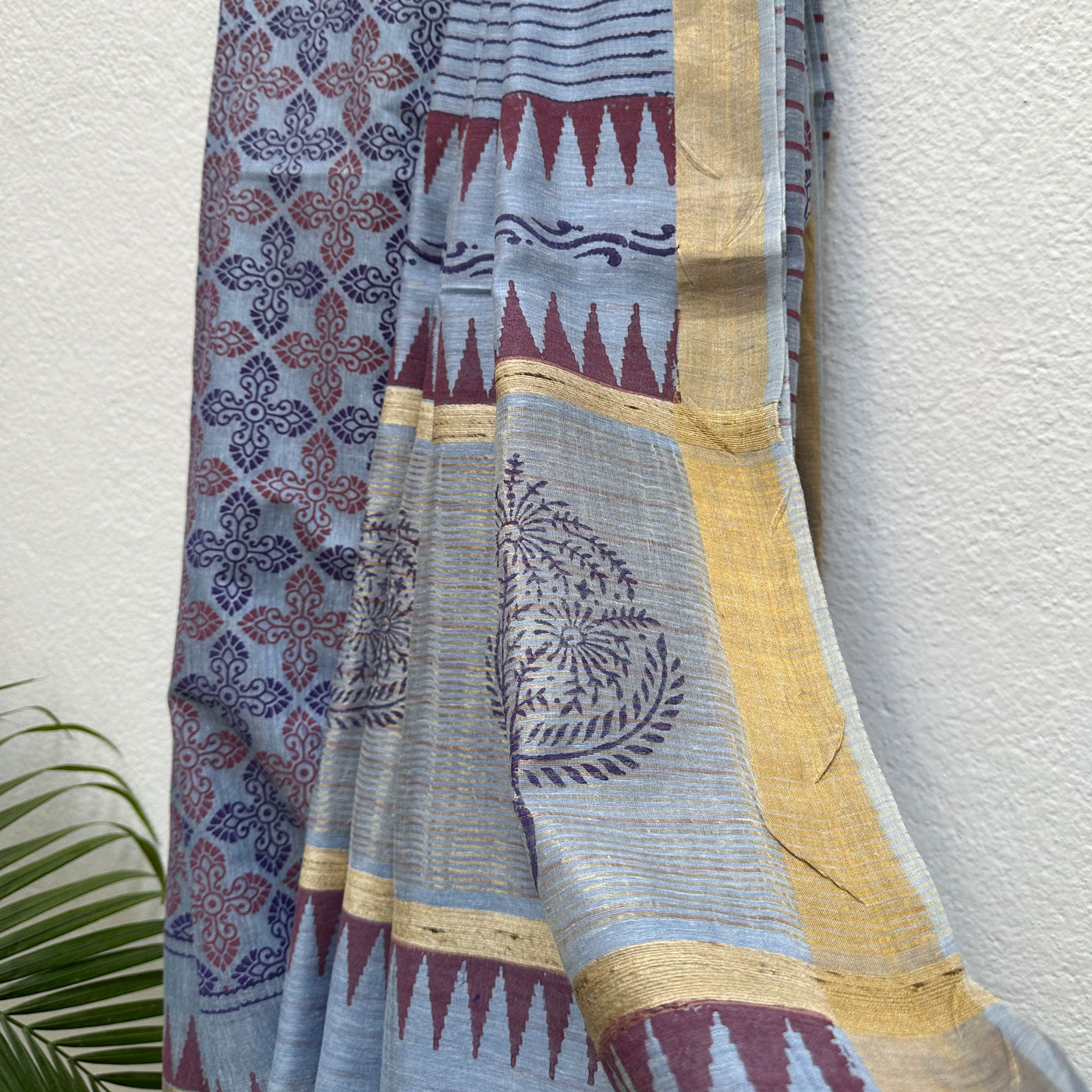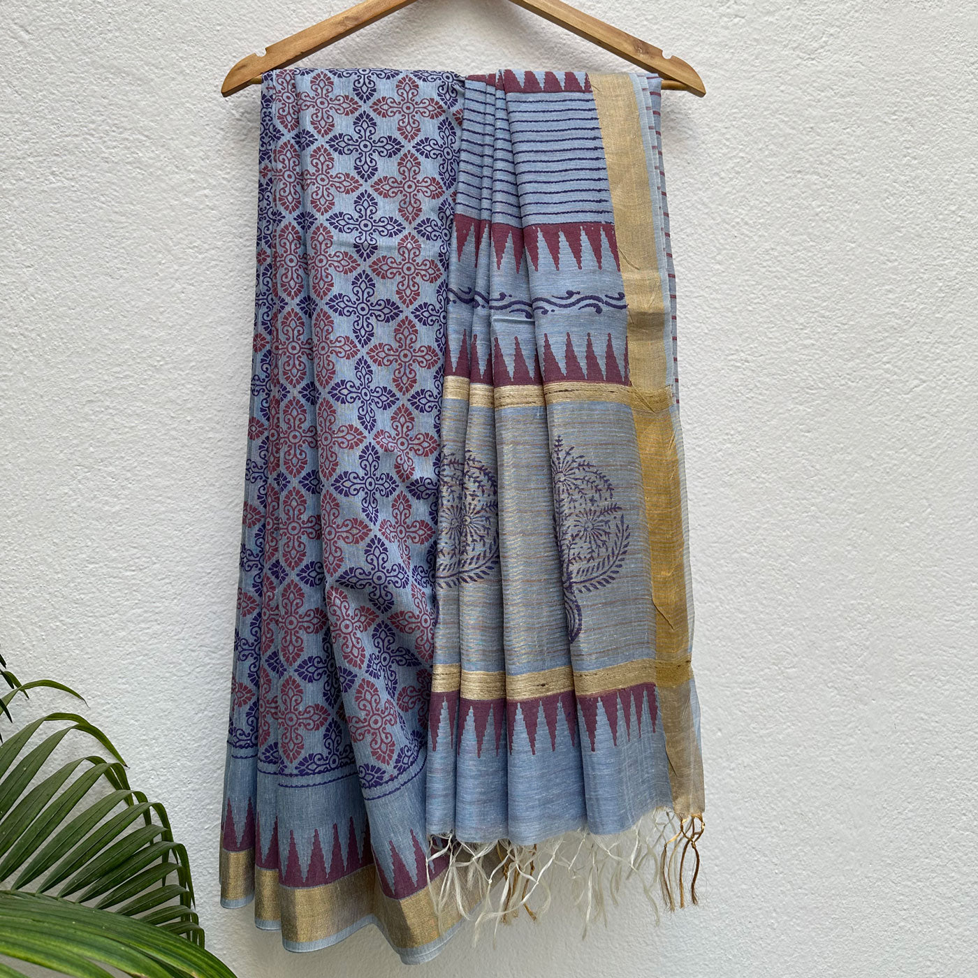 Bringing you the Ananta Silk Linen Saree from our Hathkargha range, a collection of Handblock Printed Silk sarees.