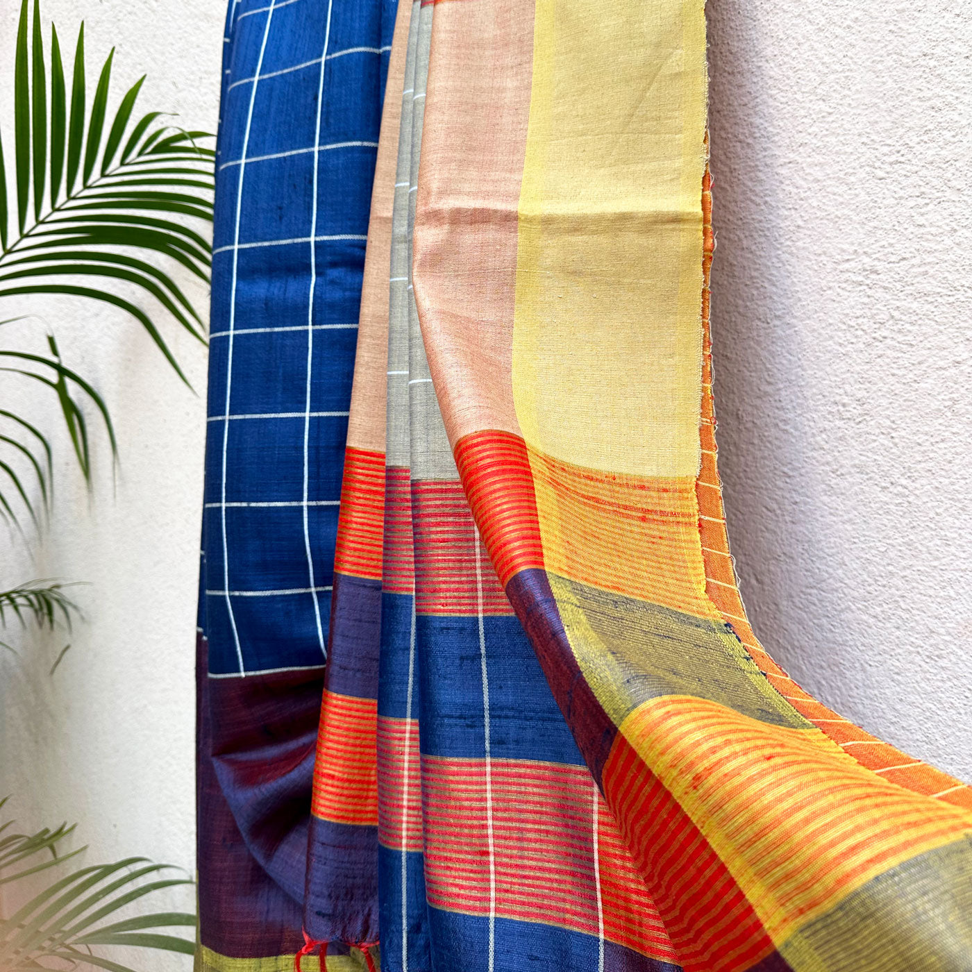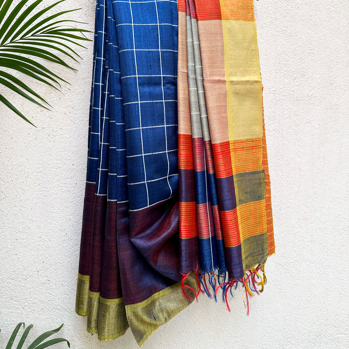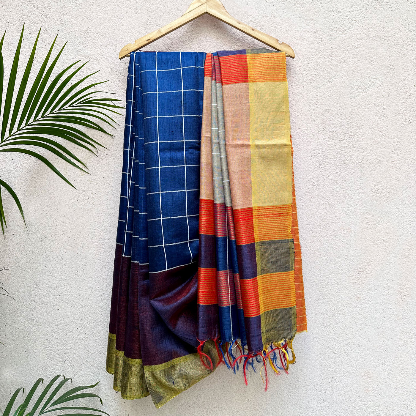 Inject some warmth into your winter wardrobe with this Anantya Handwoven Tussar Dupion Silk Saree. Featuring a regal blue check pattern on the body and playful multi-colored stripes on the pallu, this saree is perfect for adding a modern touch to traditional style. Made with love, it's the perfect addition to any fashion-forward wardrobe. Embrace love and sophistication with this beautiful, yet understated saree.