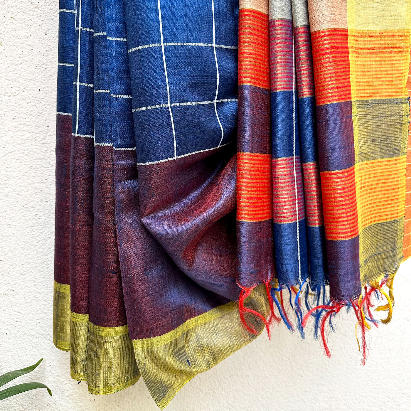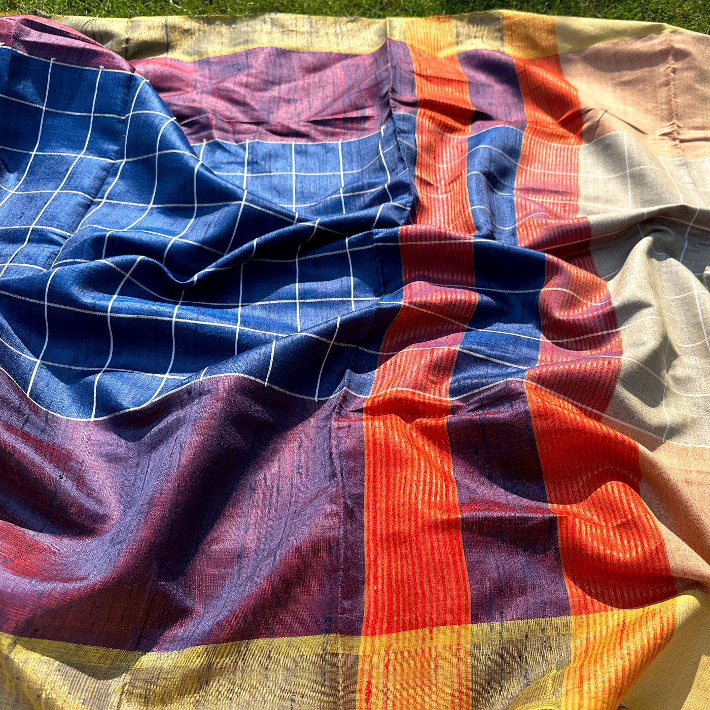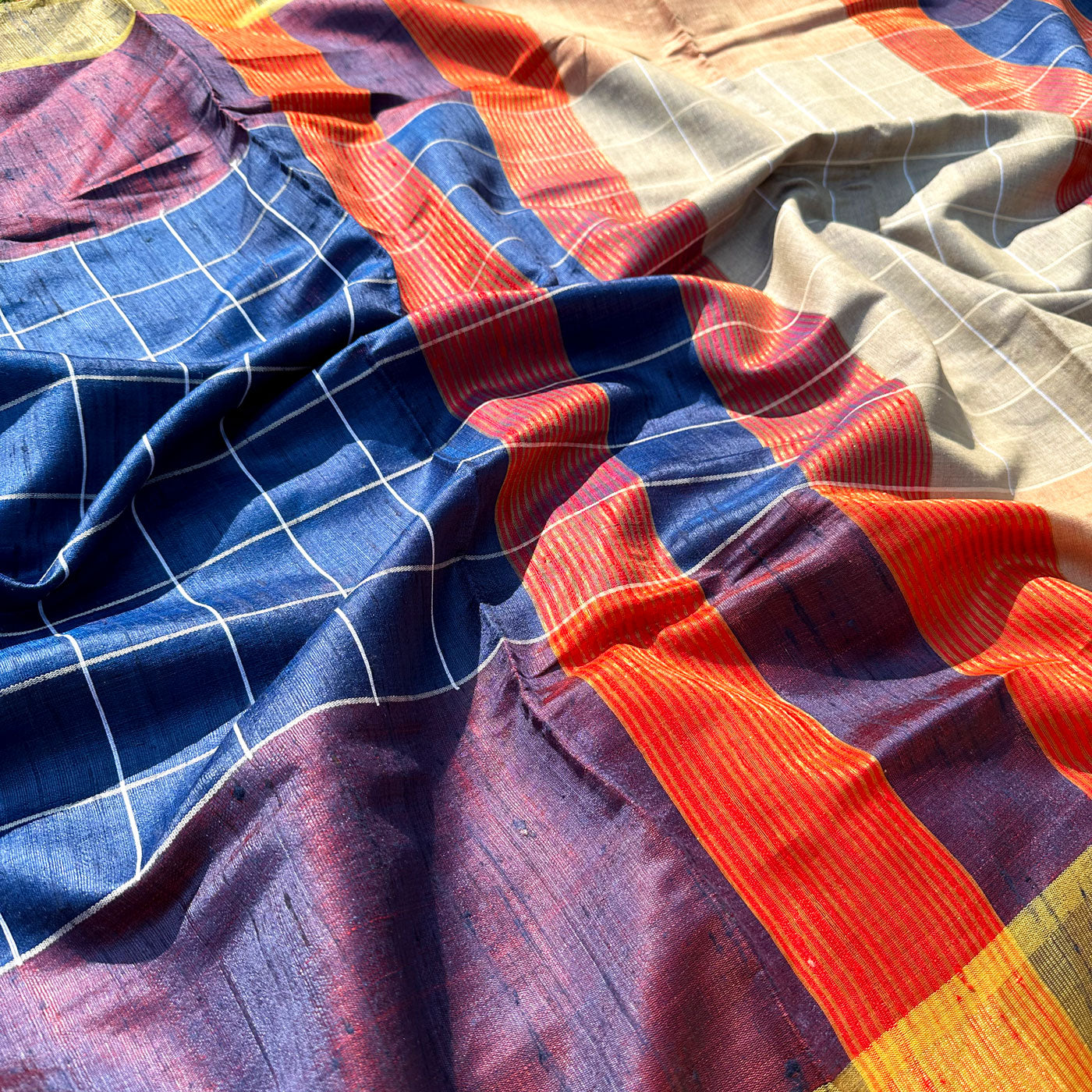 Inject some warmth into your winter wardrobe with this Anantya Handwoven Tussar Dupion Silk Saree. Featuring a regal blue check pattern on the body and playful multi-colored stripes on the pallu, this saree is perfect for adding a modern touch to traditional style. Made with love, it's the perfect addition to any fashion-forward wardrobe. Embrace love and sophistication with this beautiful, yet understated saree.