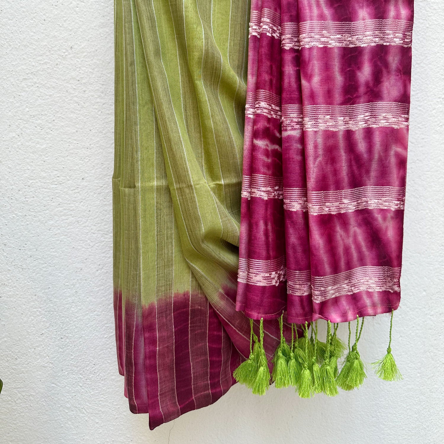 Unleash your playful side with our Shibori Saree! The cotton silk fabric ensures comfort while the fancy yarn striped pallu adds a touch of glamour. The plain striped body and shibori border and pallu in pink bring a quirky and unique touch to this saree. Perfect for any occasion!