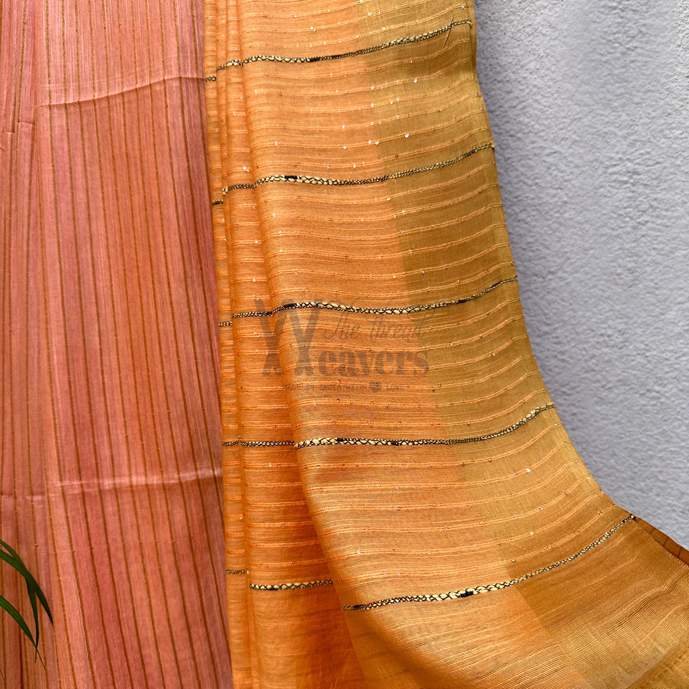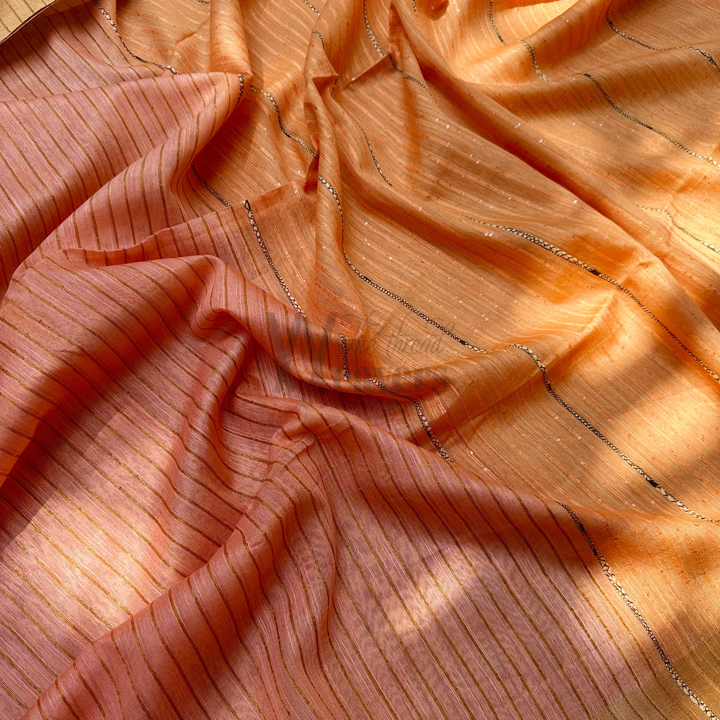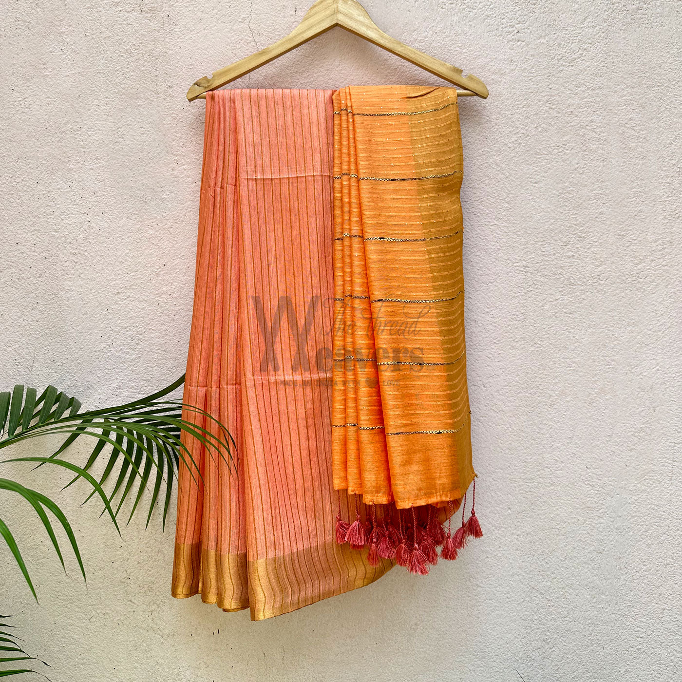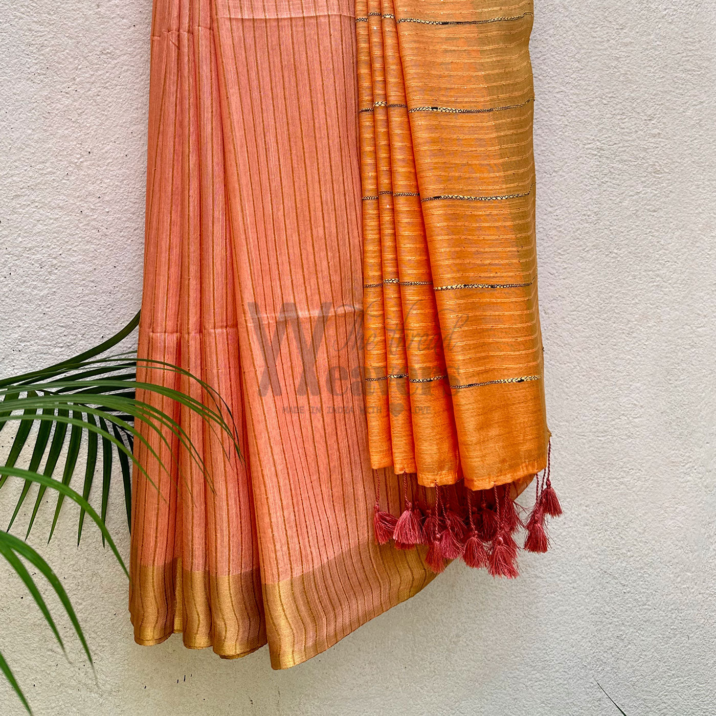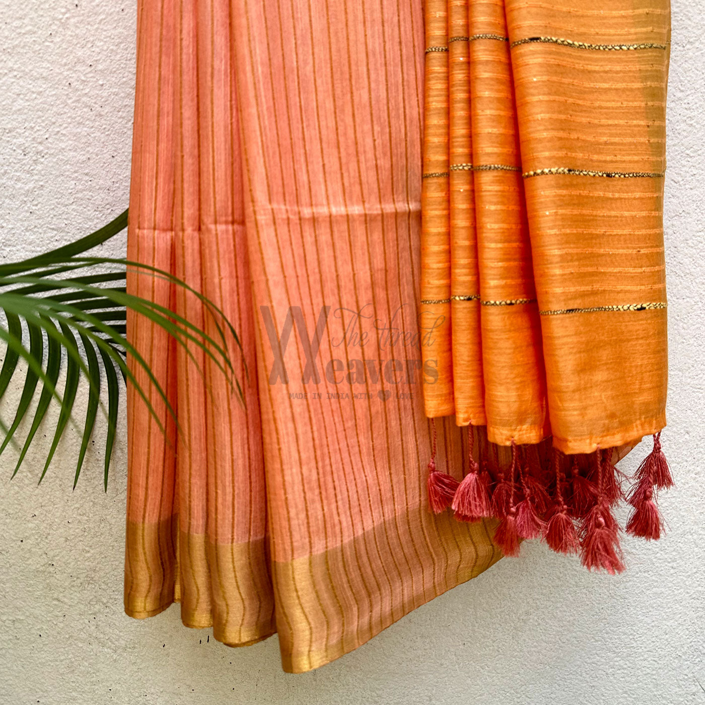 Our Apricot Blush Cotton Viscose Saree radiates timeless sophistication, featuring a rich, gold zari border, captivating sequined pallu along with ghicha stripes , and a stylish striped body to provide a luxurious feel. Perfect for corporate office wear, the dual-colored saree with contrast tassels serves as an elegant finishing touch, adding an extra layer of refinement and charm to your wardrobe.