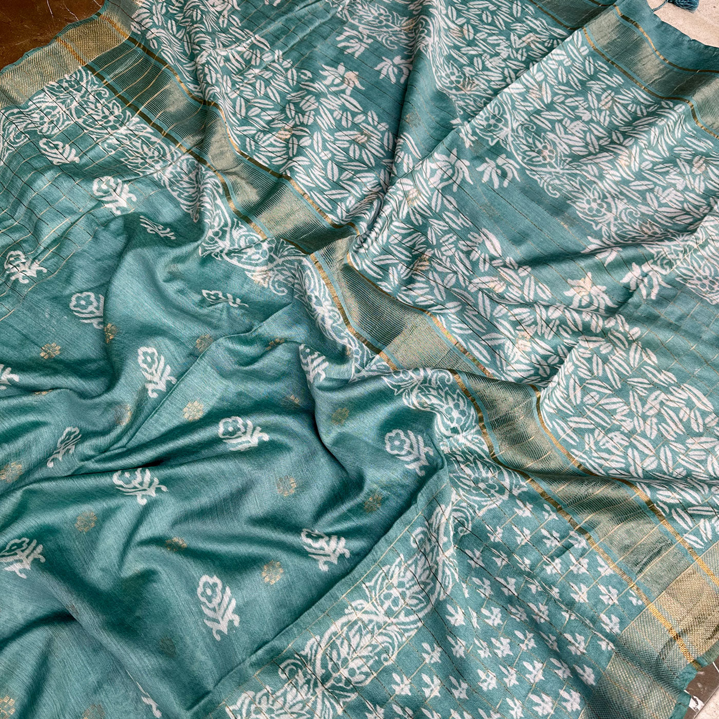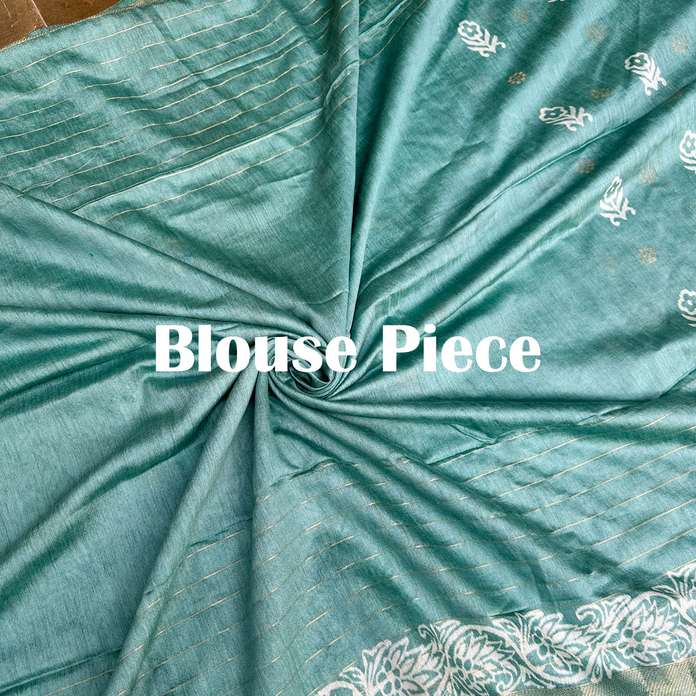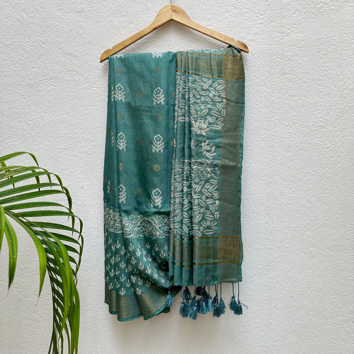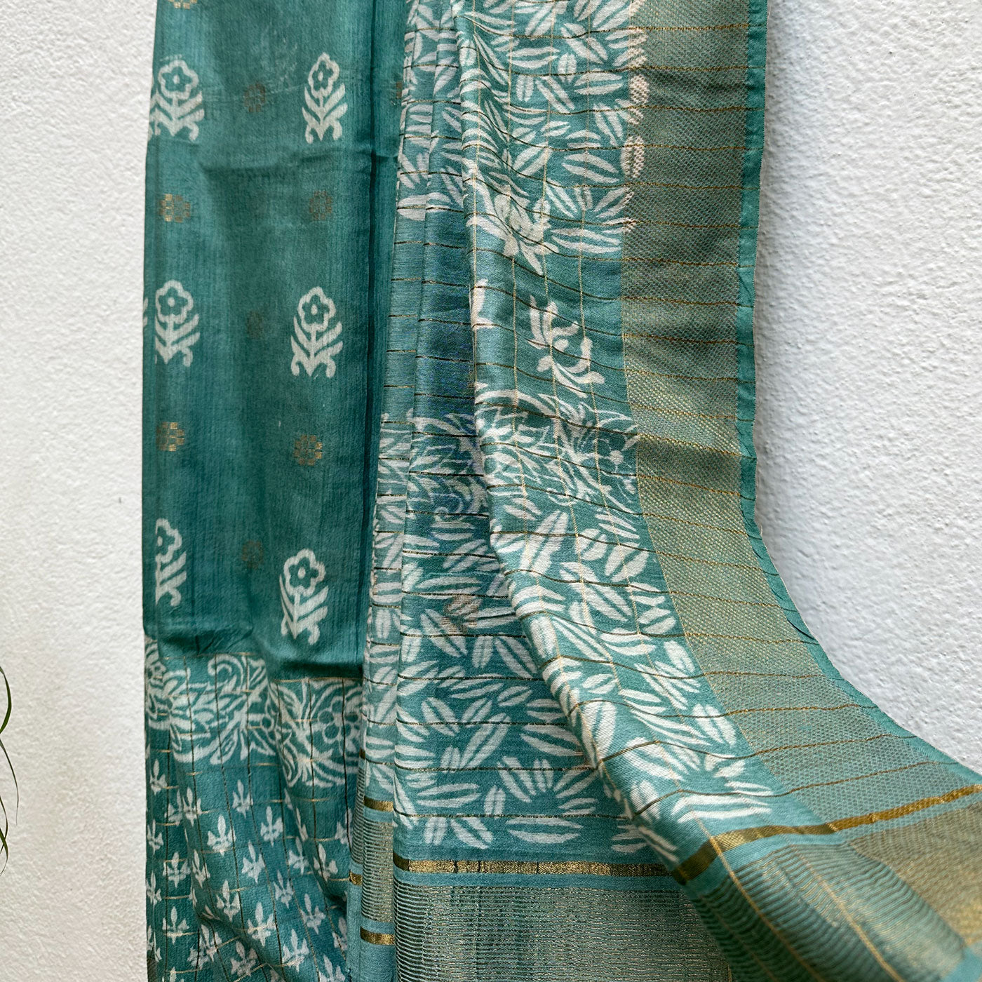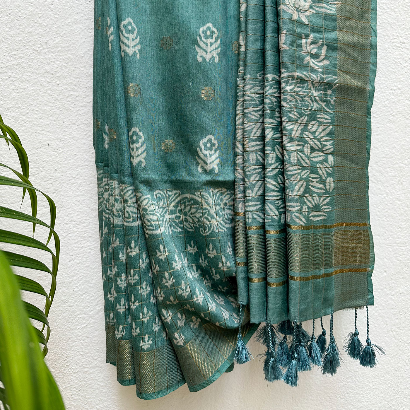 Brighten your collection with this exquisite cotton-silk saree, adorned with a bold gold stripe border and graceful handblock floral buta and bel designs. The classic tassels on the pallu enhance its elegance, while the detailed handblock motifs, radiant gold butas, and lively checks pattern throughout create a perfect harmony of heritage and vibrancy. Crafted to boost your confidence and draw admiring looks, this saree is your ultimate choice for making a strong, lasting impression at every event.