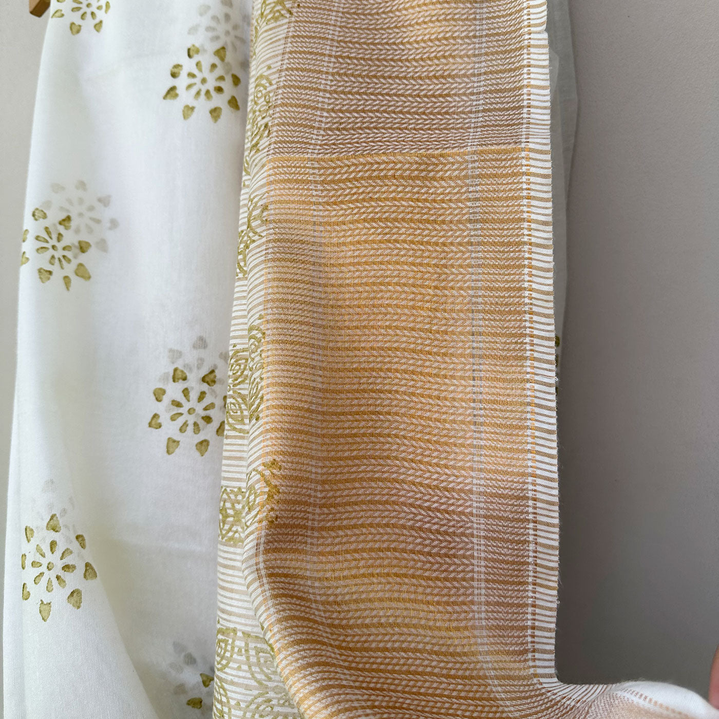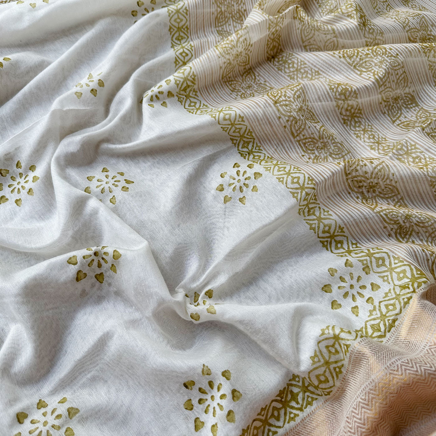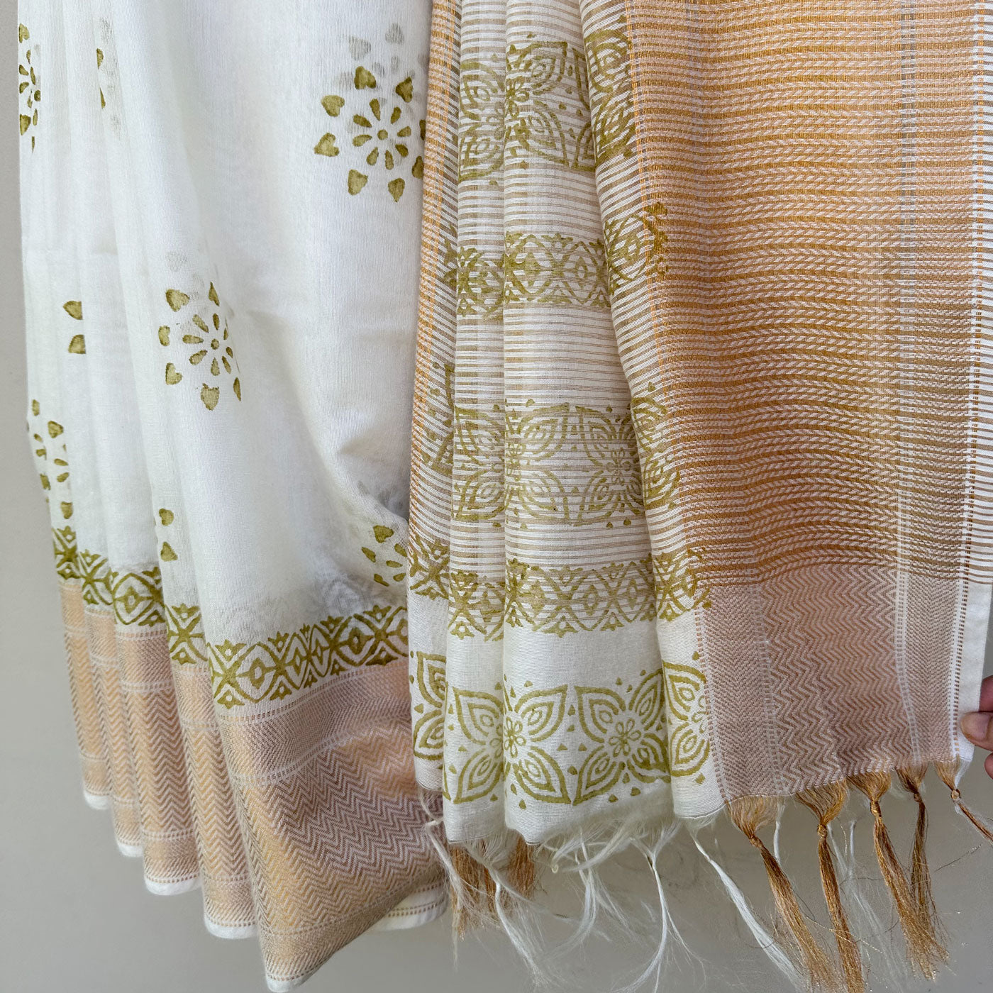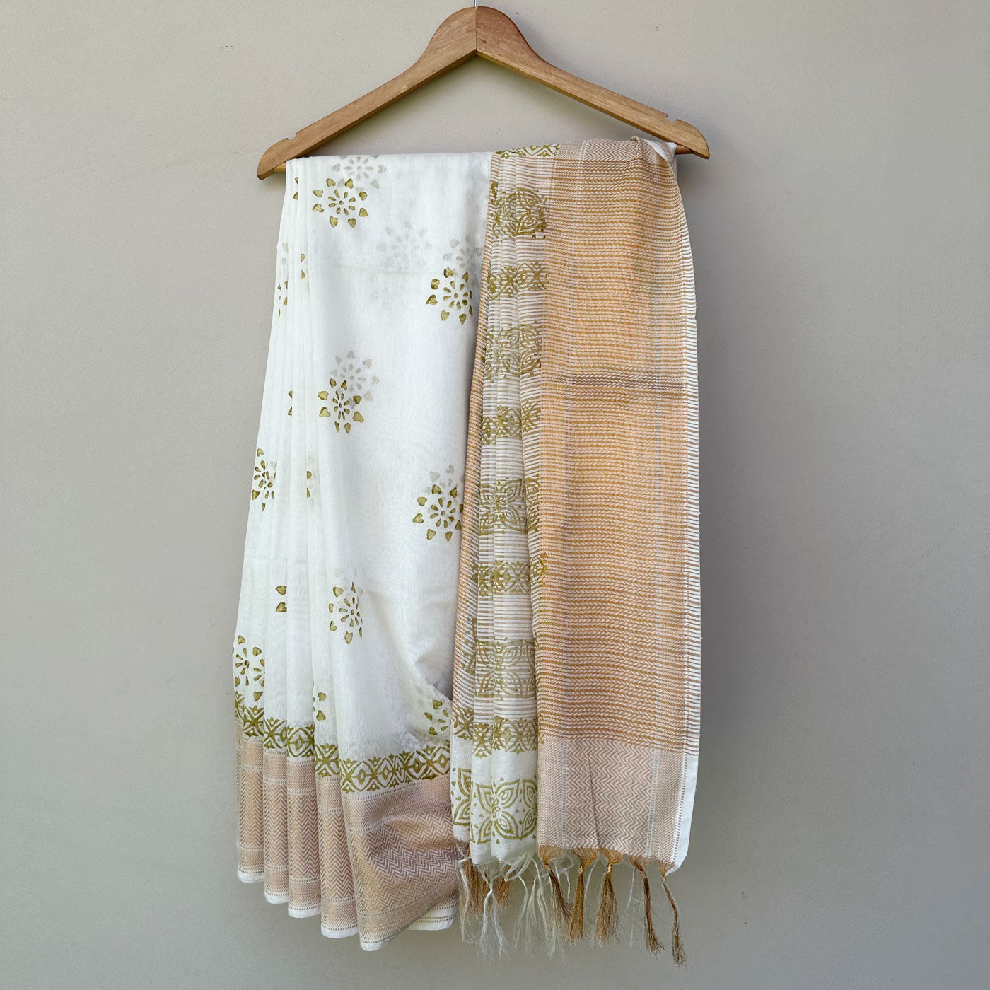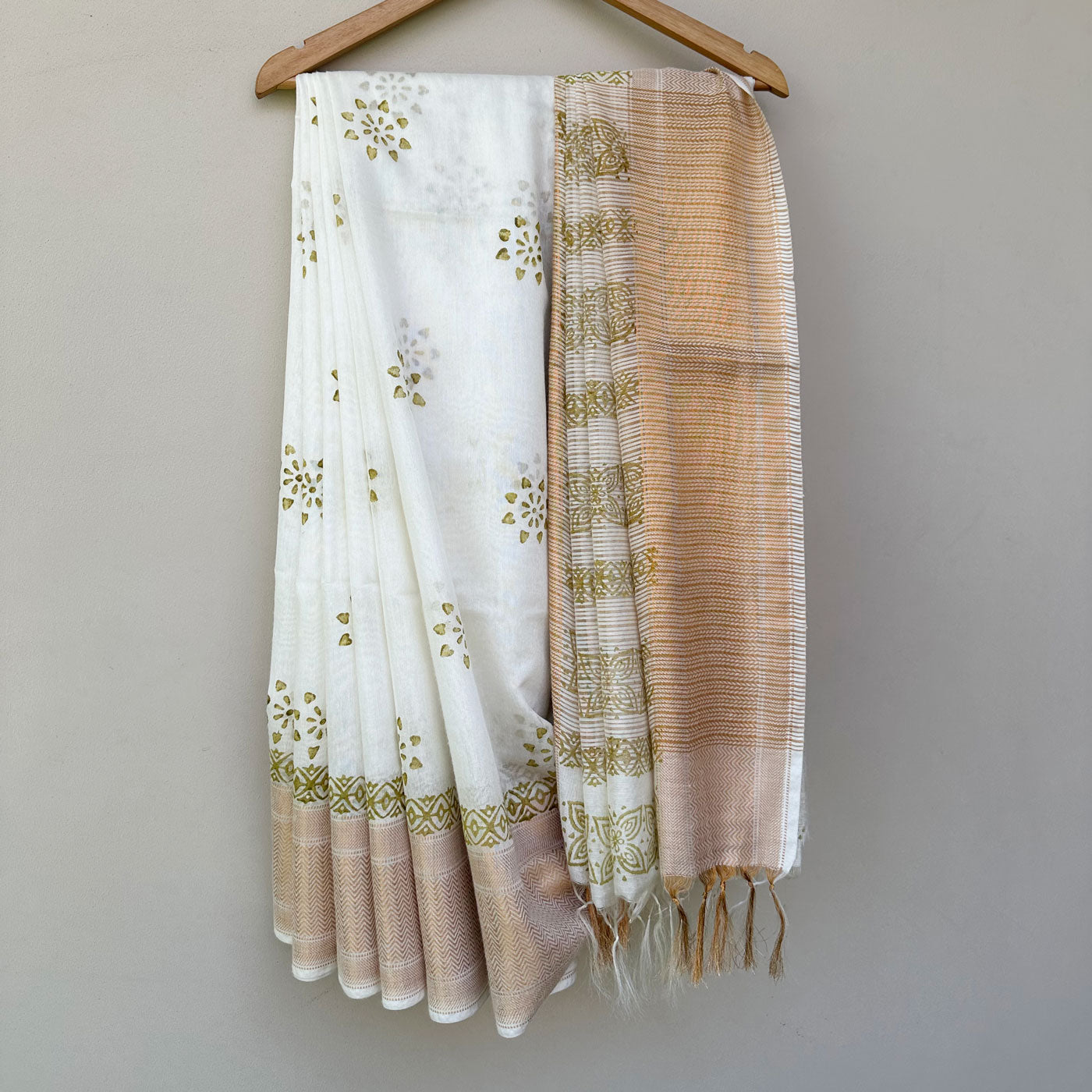Bringing you our Onam special, Ashwini Handblock Printed, our signature cotton silk saree.