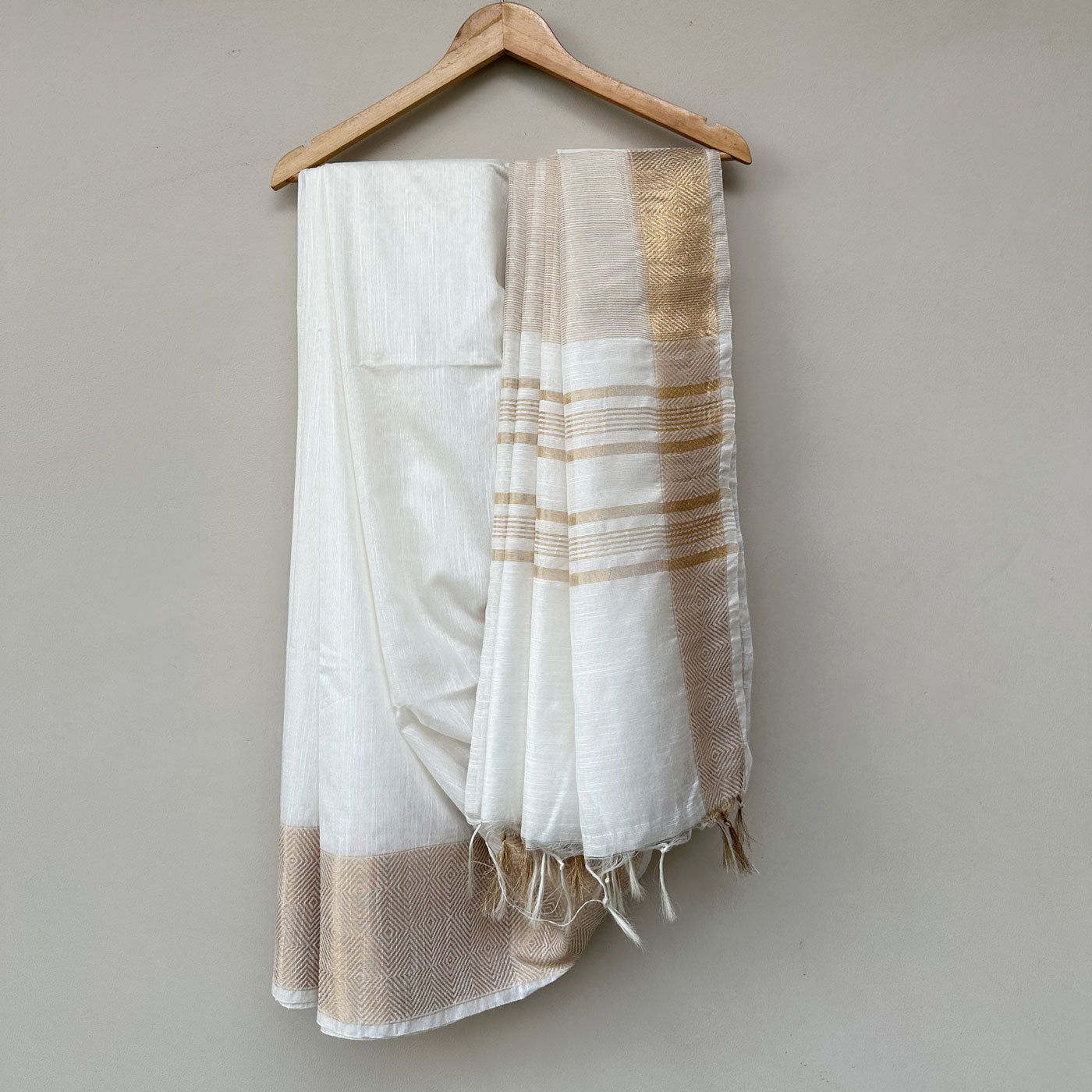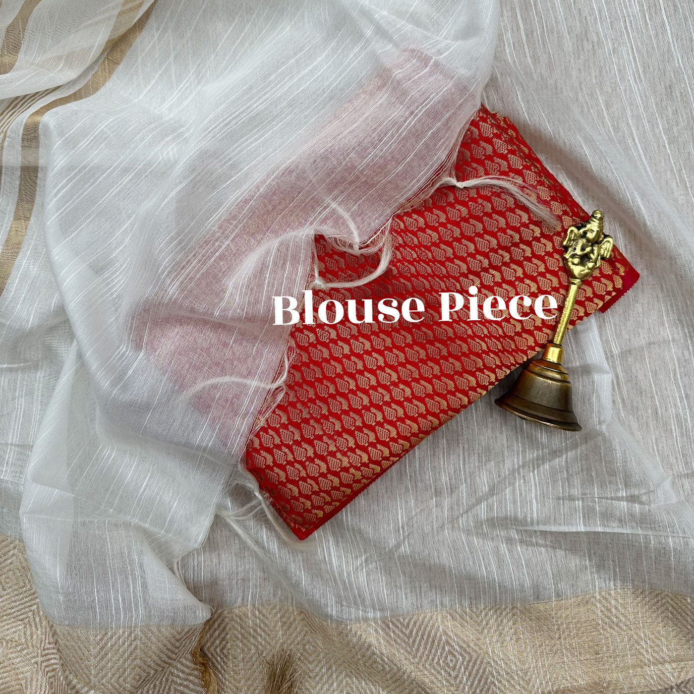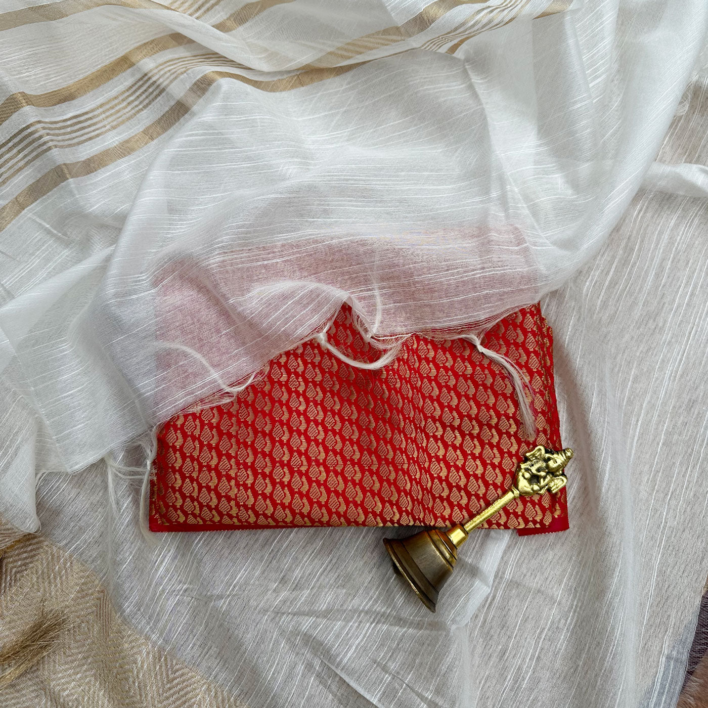 Set on a refined pearl white base, the Avikrat Cotton Silk Saree exudes understated elegance through its delicate gold zari border. The saree’s border is adorned with meticulously woven gold zari diamond patterns, adding a subtle yet sophisticated texture that catches the light gracefully. Enhancing its charm, the pallu showcases horizontal thick and thin stripes, creating a harmonious blend of traditional craftsmanship and contemporary style. To complete this exquisite ensemble, a contrasting red brocade blouse piece is included, offering a striking balance that elevates the overall aesthetic. Perfect for your onam celebrations, this saree combines comfort with timeless beauty.