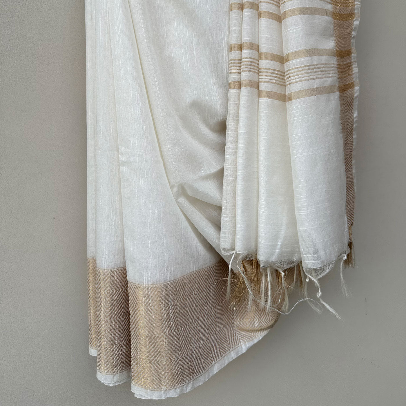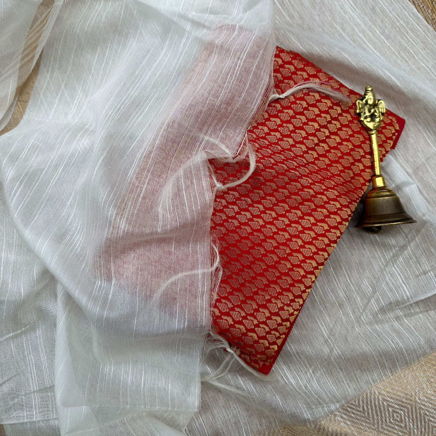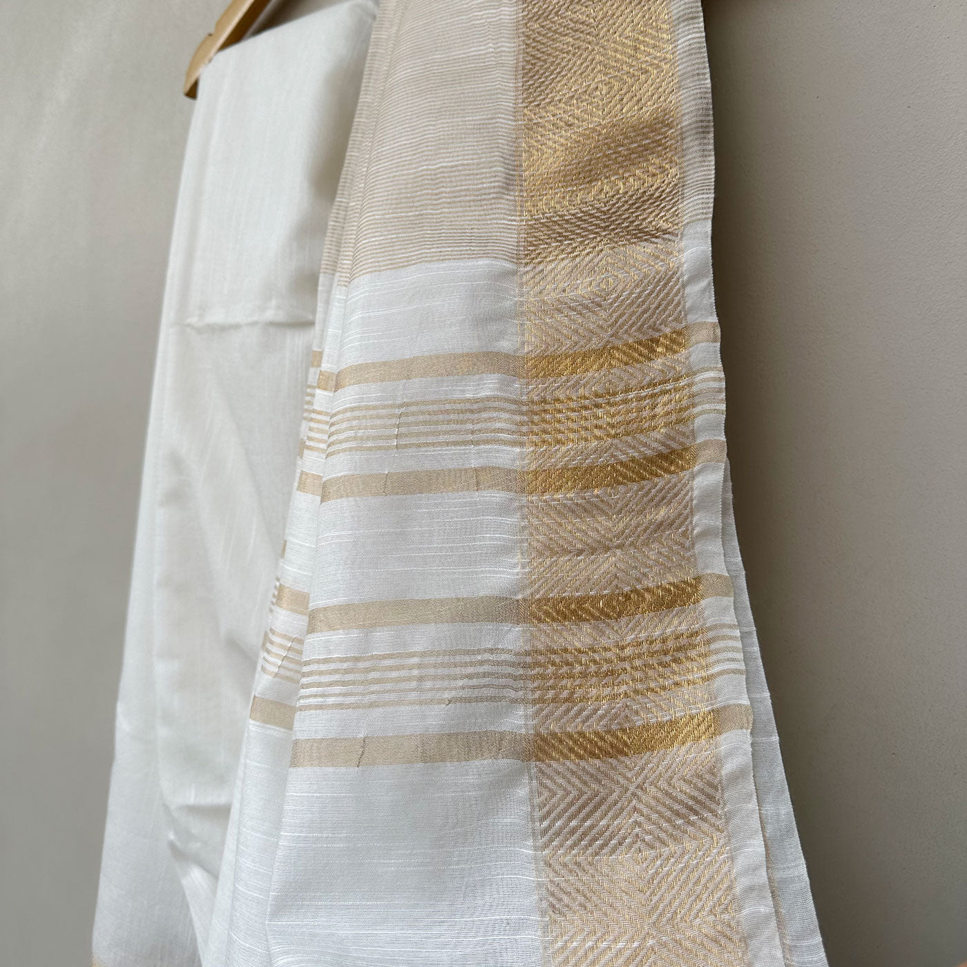 Set on a refined pearl white base, the Avikrat Cotton Silk Saree exudes understated elegance through its delicate gold zari border. The saree’s border is adorned with meticulously woven gold zari diamond patterns, adding a subtle yet sophisticated texture that catches the light gracefully. Enhancing its charm, the pallu showcases horizontal thick and thin stripes, creating a harmonious blend of traditional craftsmanship and contemporary style. To complete this exquisite ensemble, a contrasting red brocade blouse piece is included, offering a striking balance that elevates the overall aesthetic. Perfect for your onam celebrations, this saree combines comfort with timeless beauty.