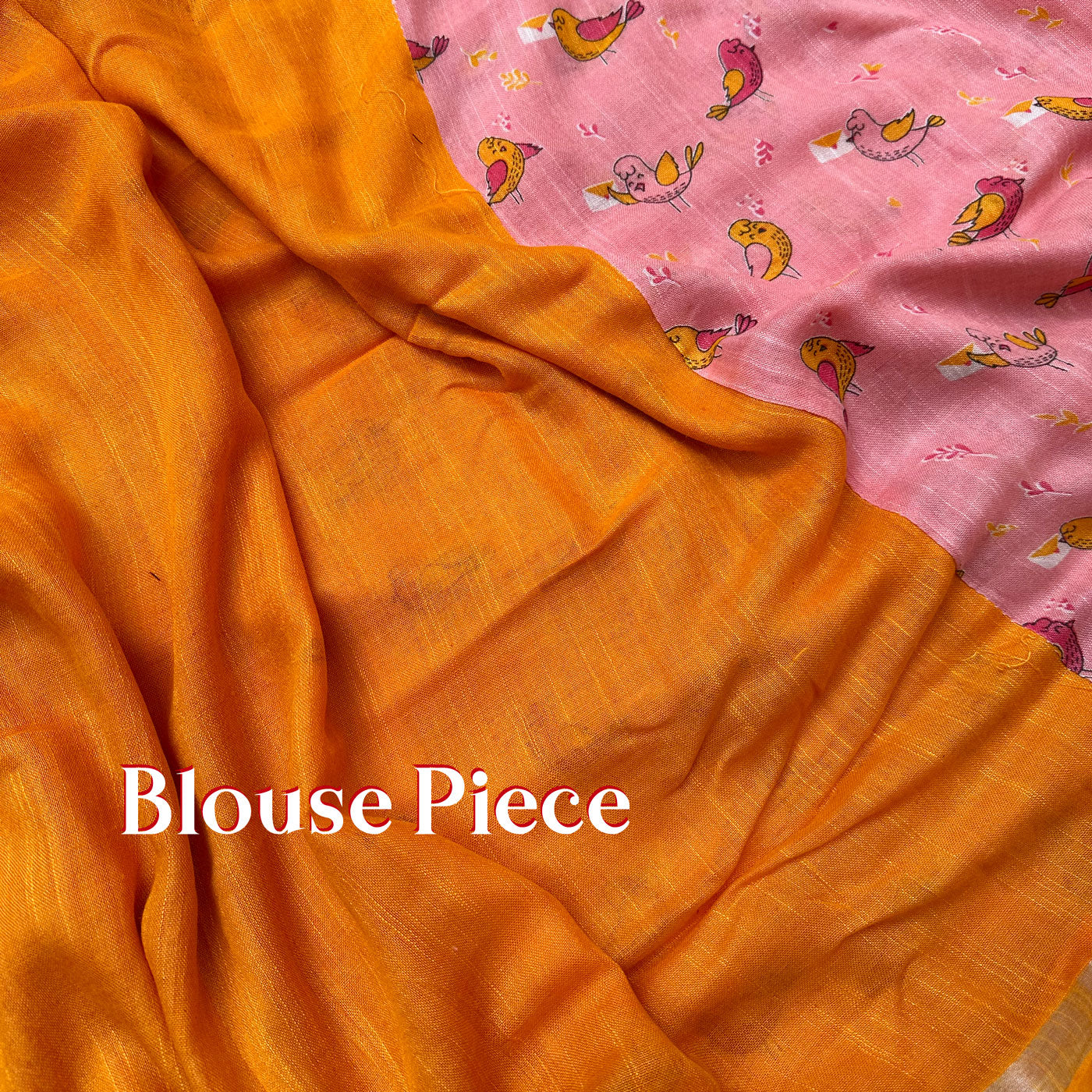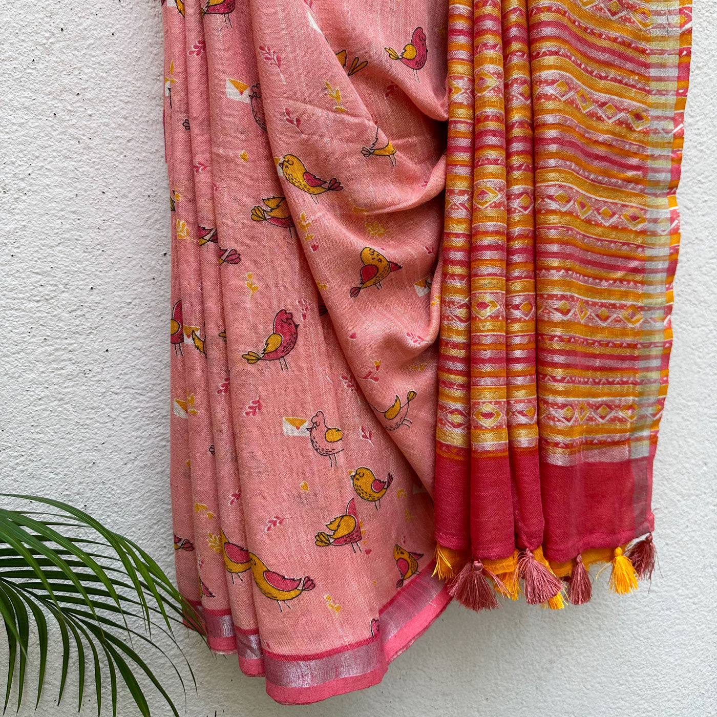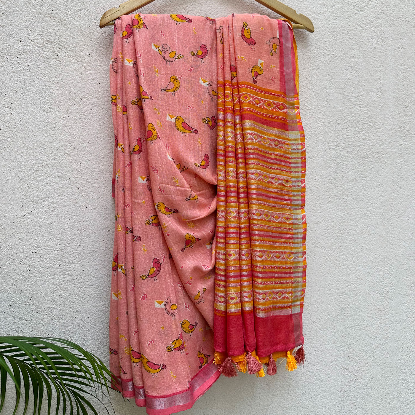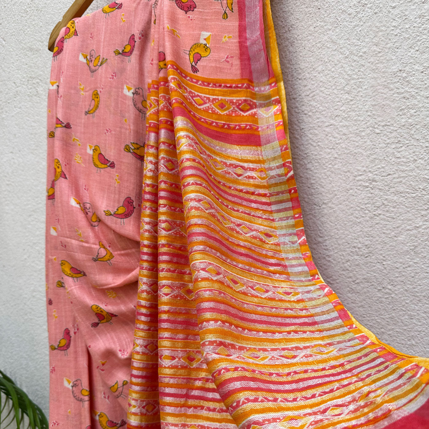 Chirp Up Your Style! πΆπ¦ Wrap yourself in whimsy with our Tweet-Heart Cotton Saree in a delightful coral pink! Adorned with playful little birdies carrying letters in their beaks and singing their hearts out, this drape is a melody in fabric. Light, breezy, and as comfy as a morning song, itβs the perfect pick for free spirits who love a touch of quirk. Beautiful bird print on a coral pink base along with contrasting stripes and zari work on the border and pallu makes this one so chic. Whether you're a birdwatcher, a letter-lover, or just here for the fun vibes, this saree will have you chirping with joy all day long! πβ¨