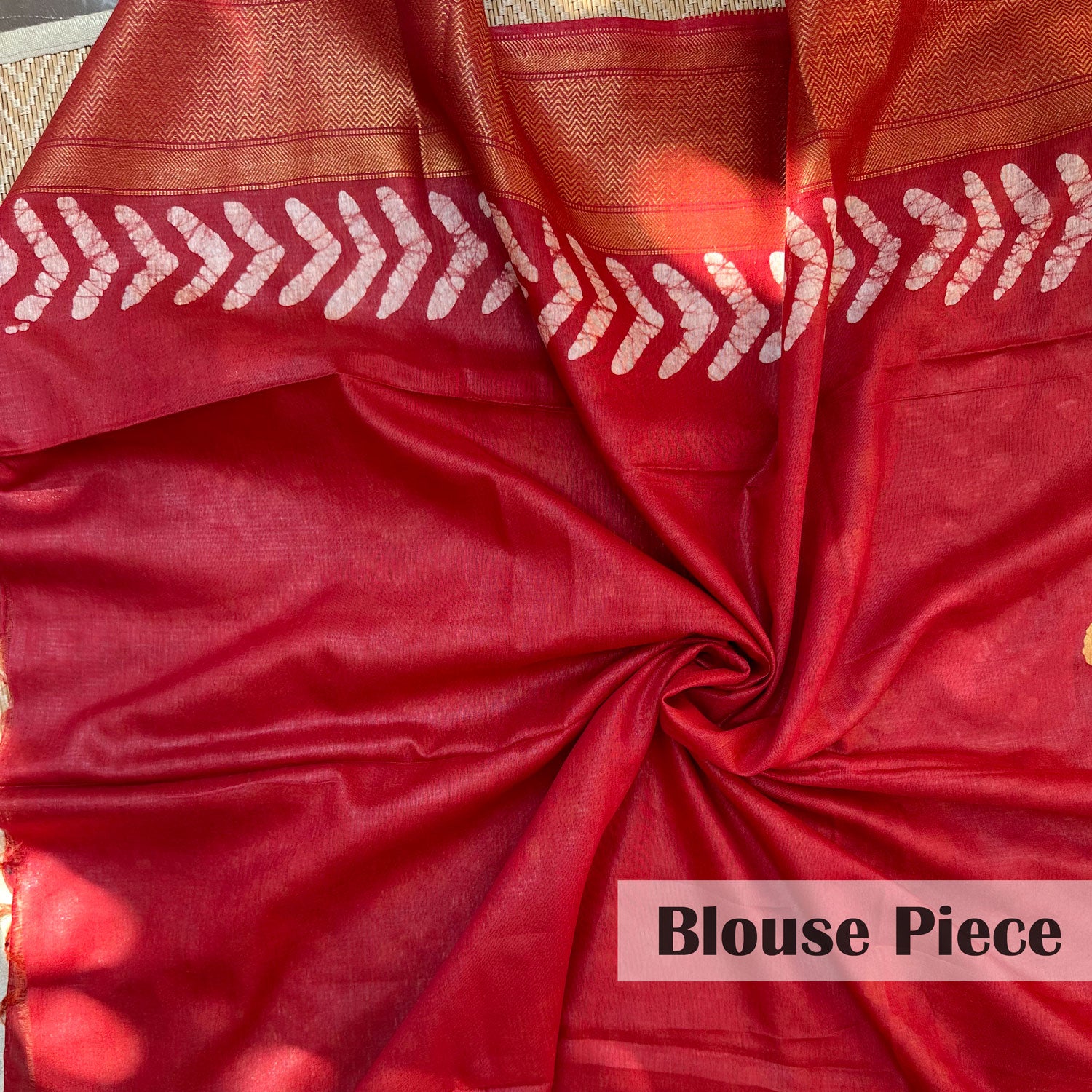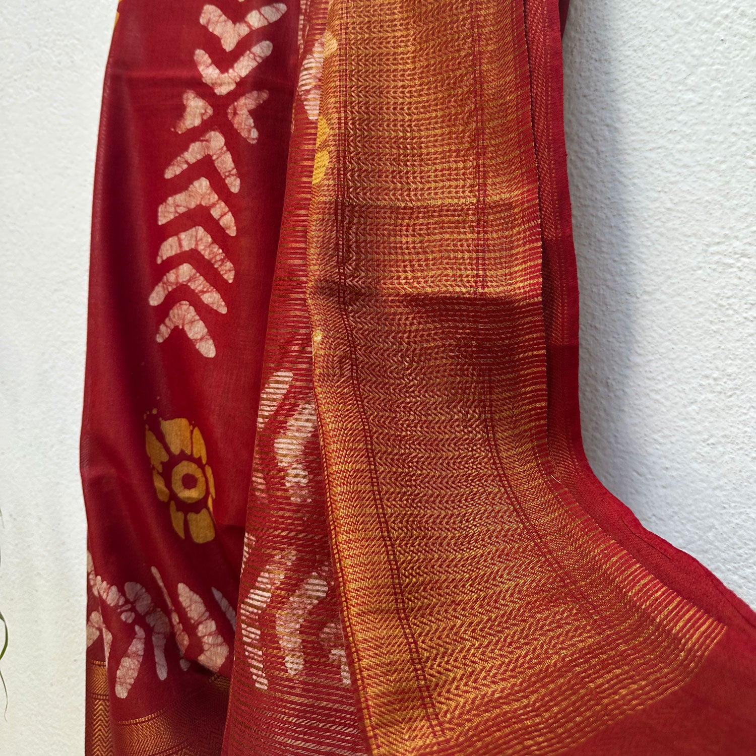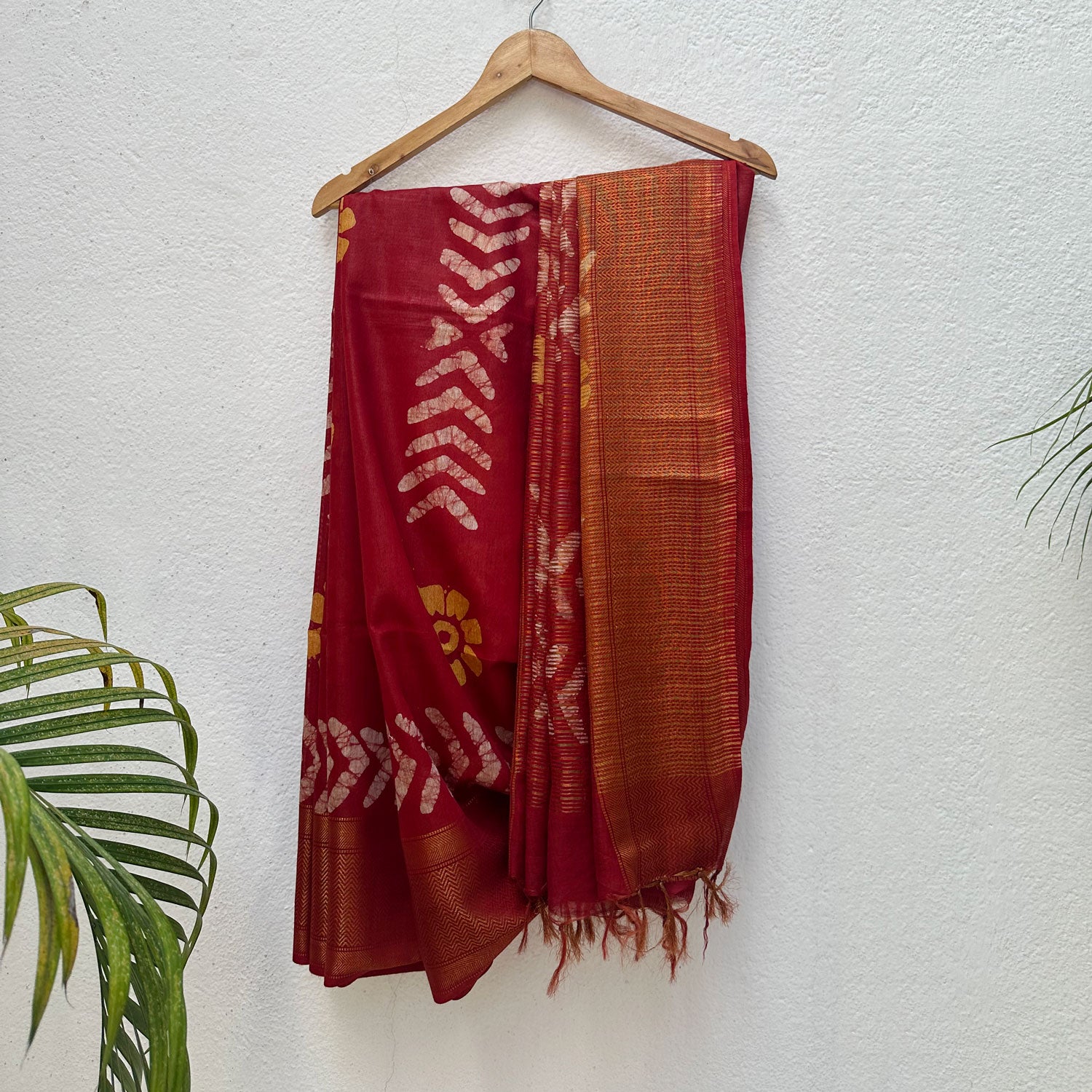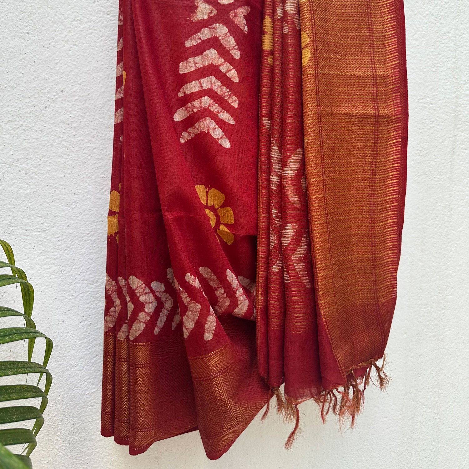 The Champa saree presents a refined maroon palette accented with an ornate gold zari border and chevron batik motif. Crafted from a cotton-silk blend, it marries comfort with understated luxury, offering breathability and graceful drape. Each hand-woven piece showcases distinctive artisanal detailing, making it an exceptional choice for discerning occasions.