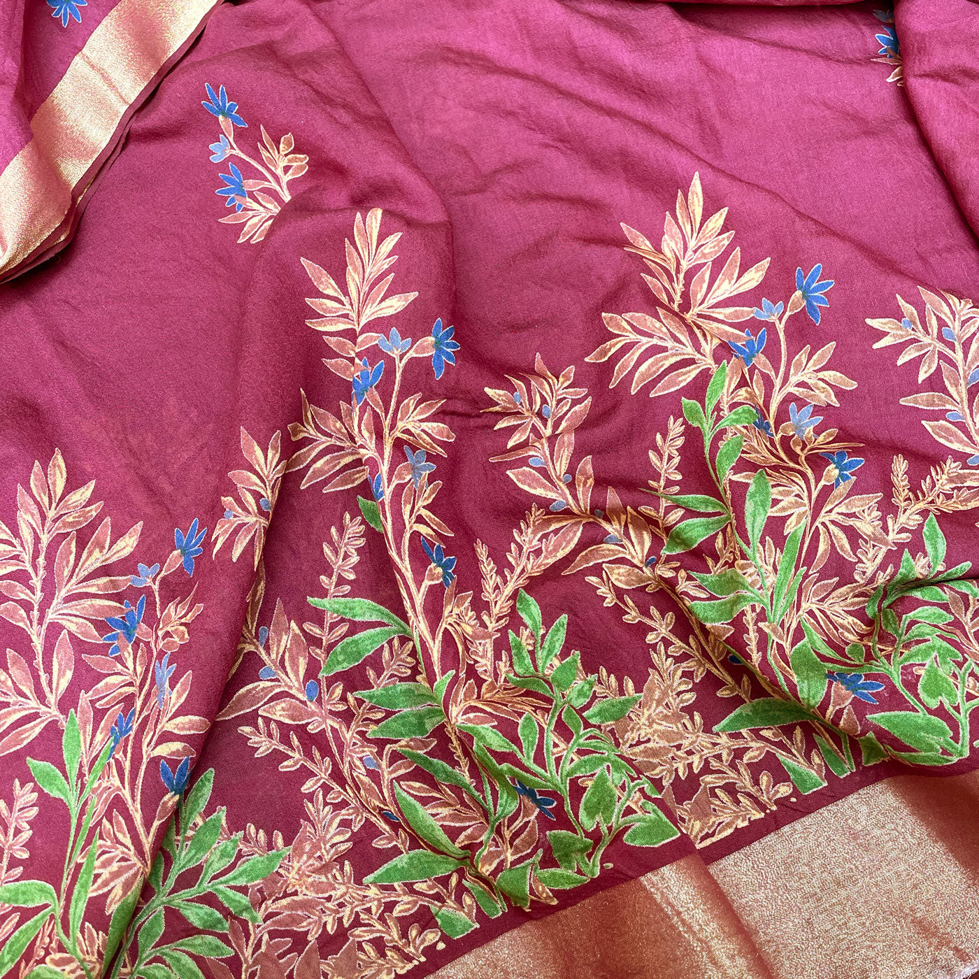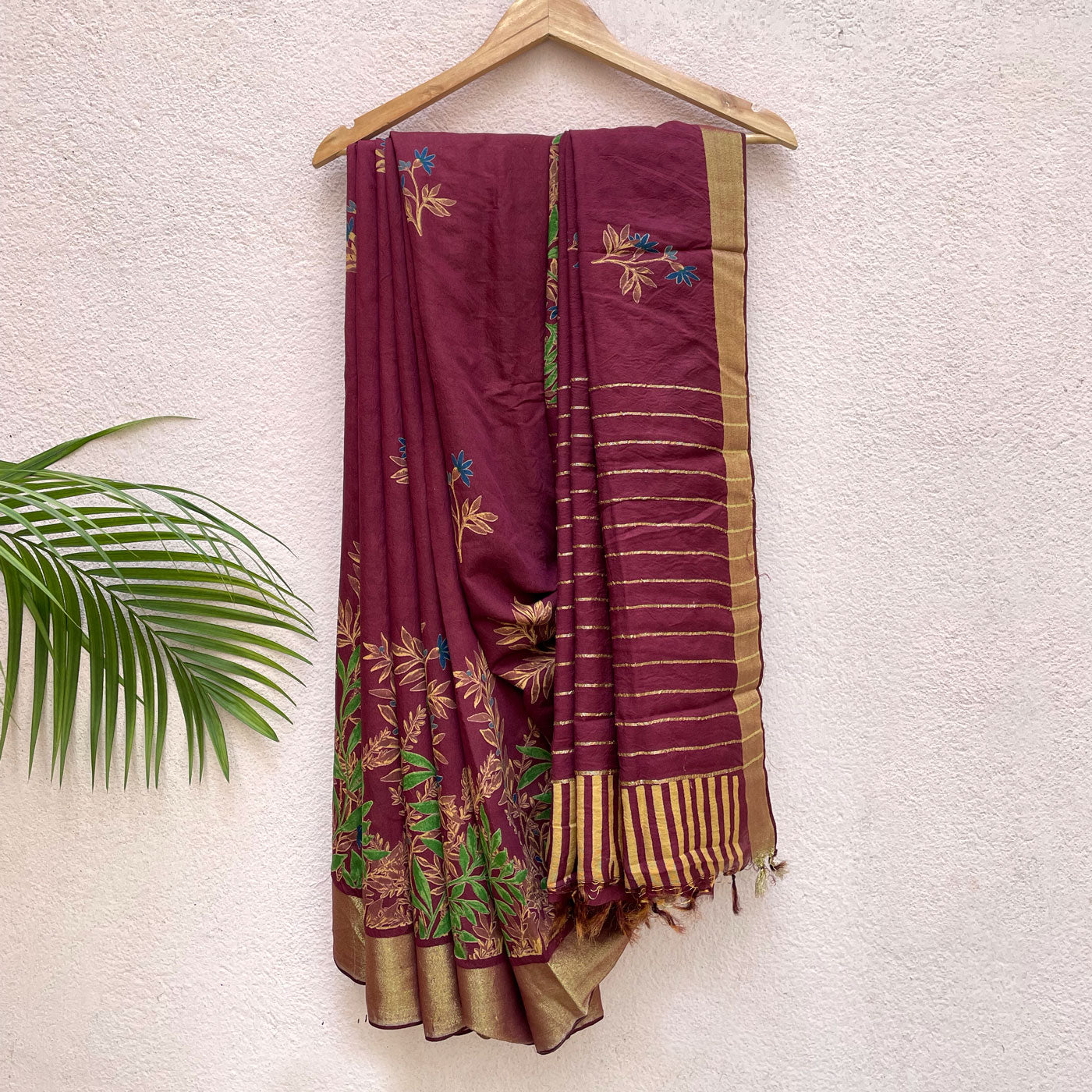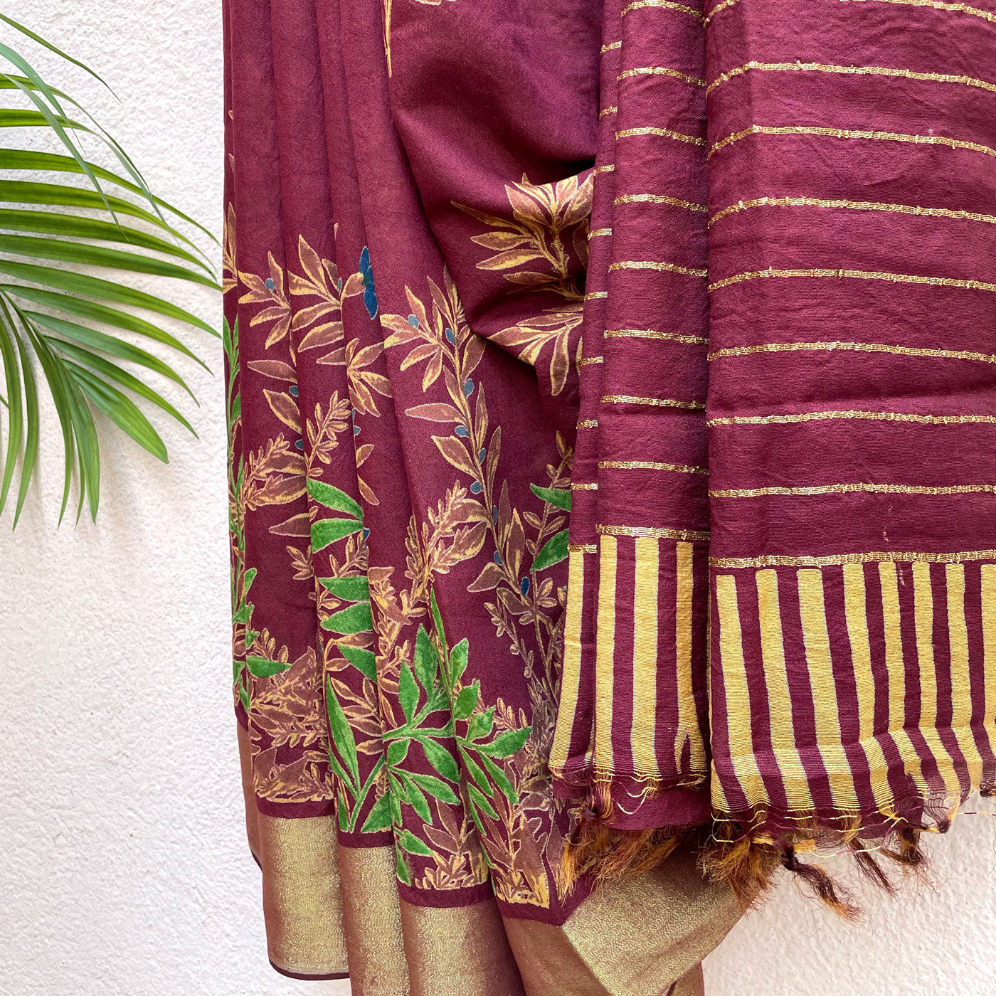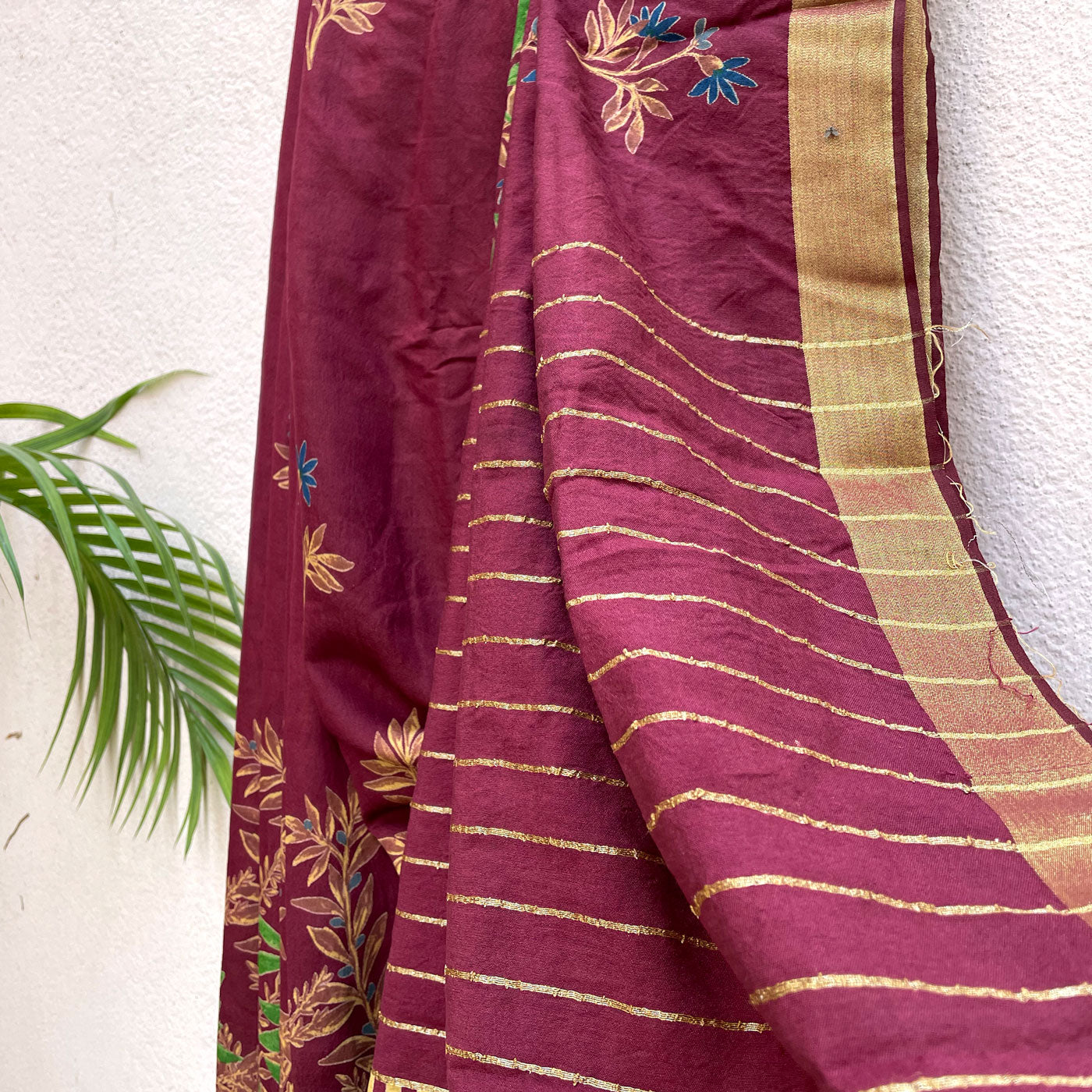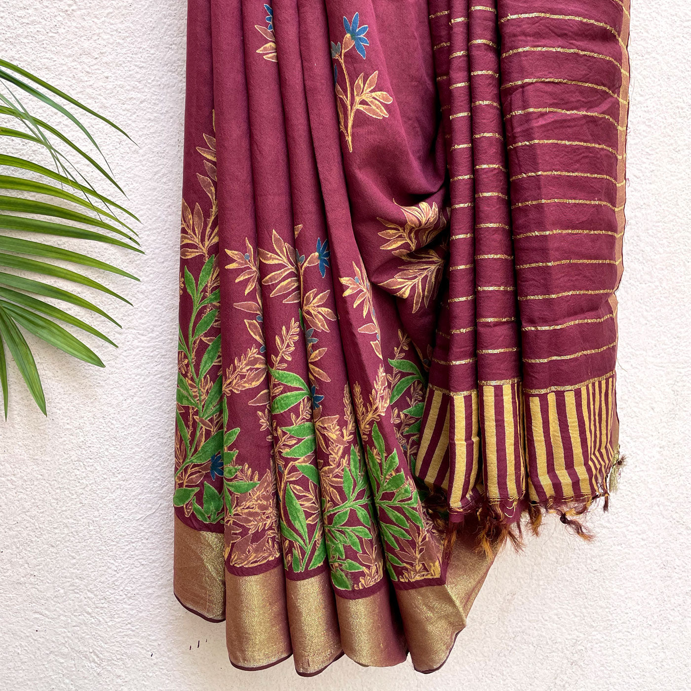 Floral prints on a maroon base with gold zari border will look slick this spring season. The theme is carried across to the pallu which dons zari stripes.