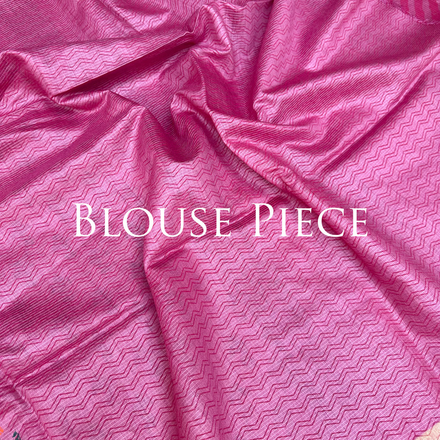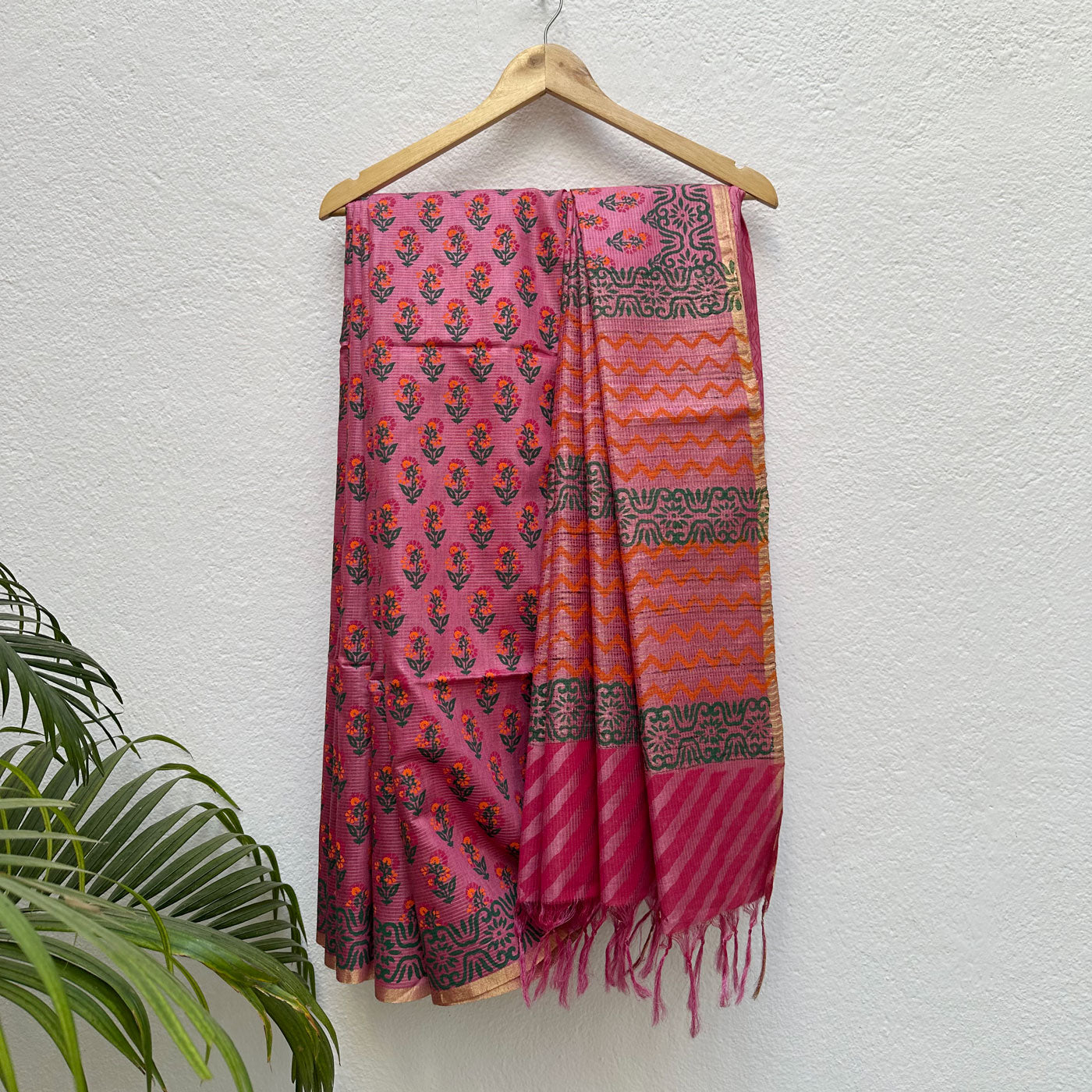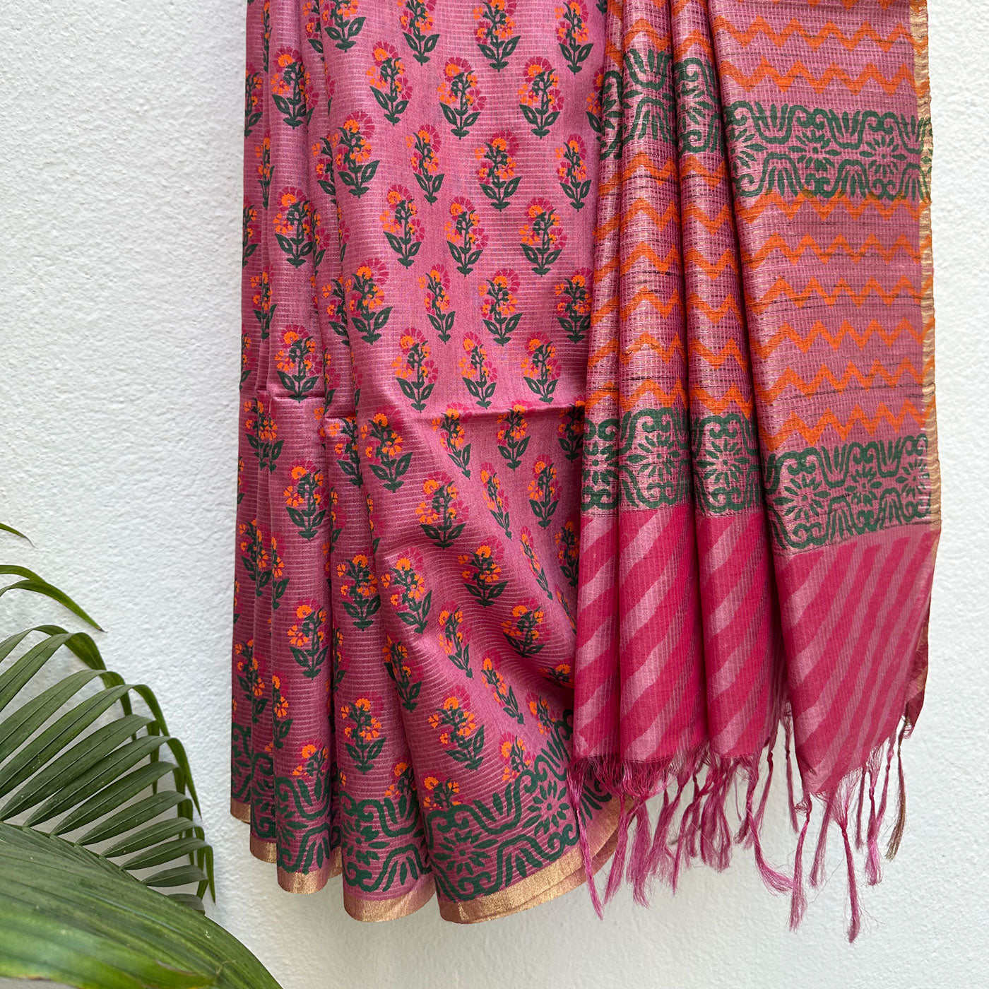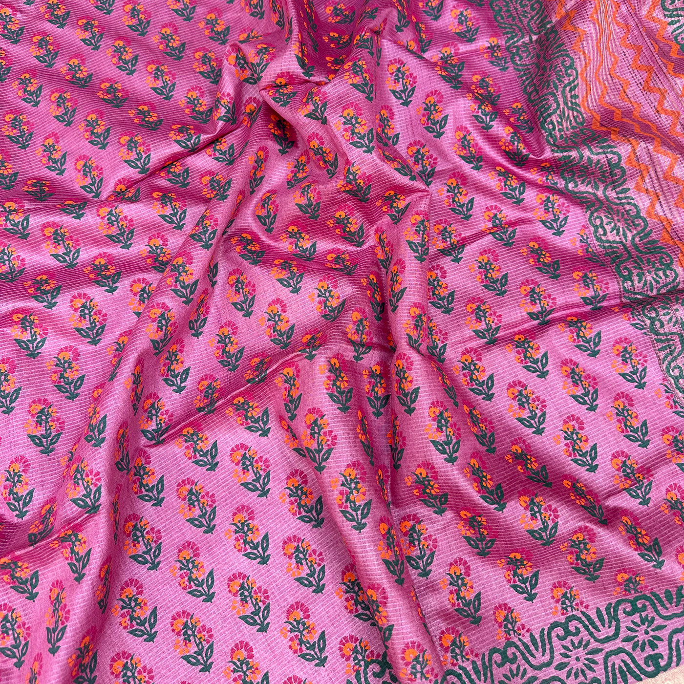 Elevate your style game and express yourself with the exquisite Printed Silk Saree. Adorned with a delicate gold border and intricate hand block motifs, highlighted by a chevron and border pattern on the pallu, and adorned with elegant floral designs, this saree exudes sophistication and boldness with its self design woven body. Ideal for unexpected family gatherings or making a statement at weddings and celebrations.