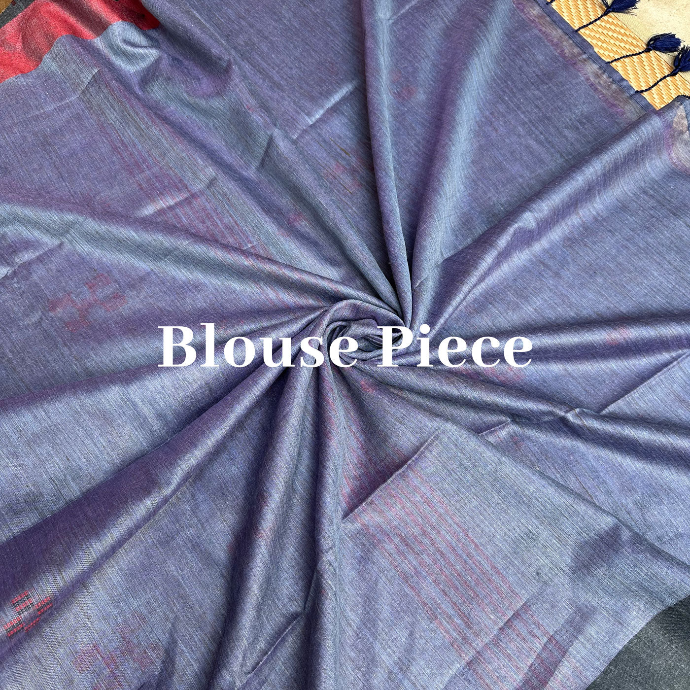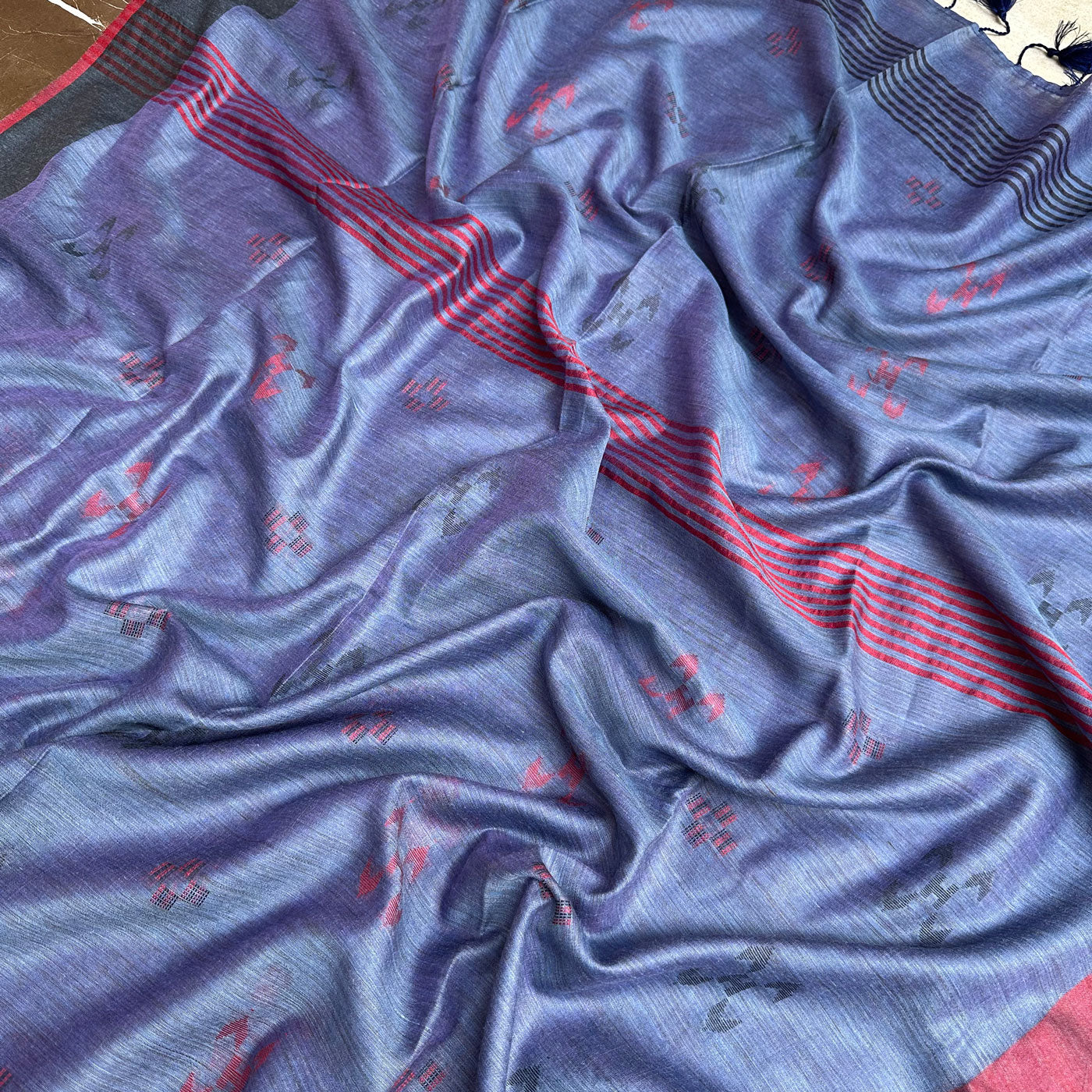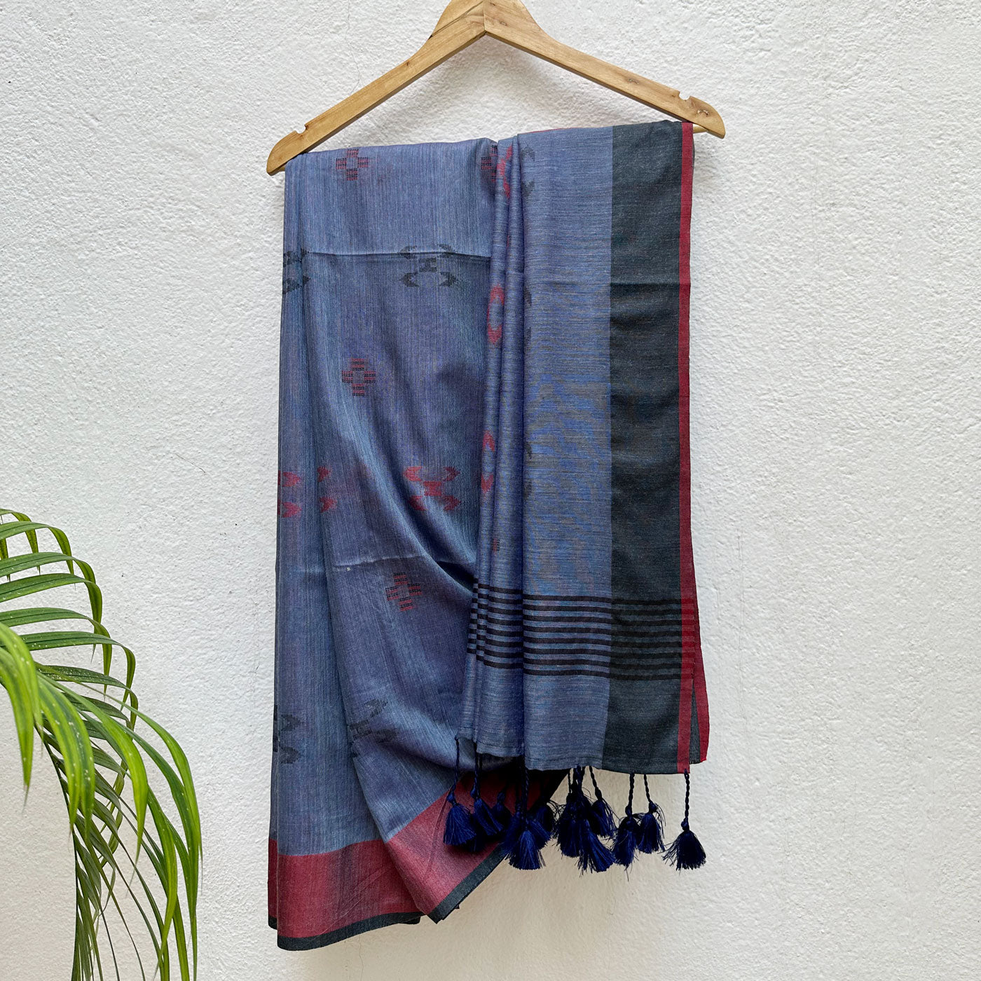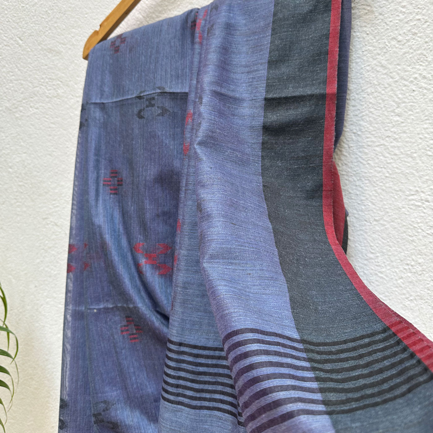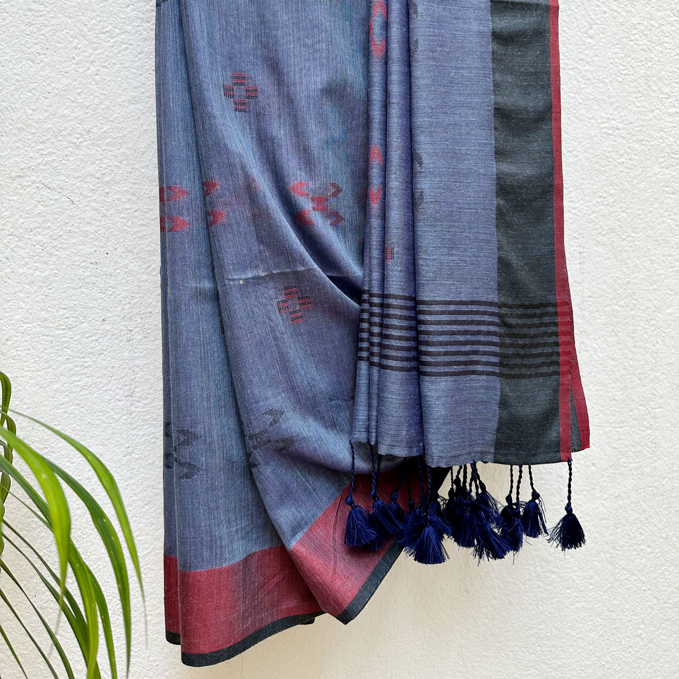 Shine bright like a diamond this festive season with this greyish blue saree with intricate triangular buti motifs in black and red will surely get your second looks. The way the colors blend with each other is truly magical. The stripe work on the pallu is a cherry on the cake.
