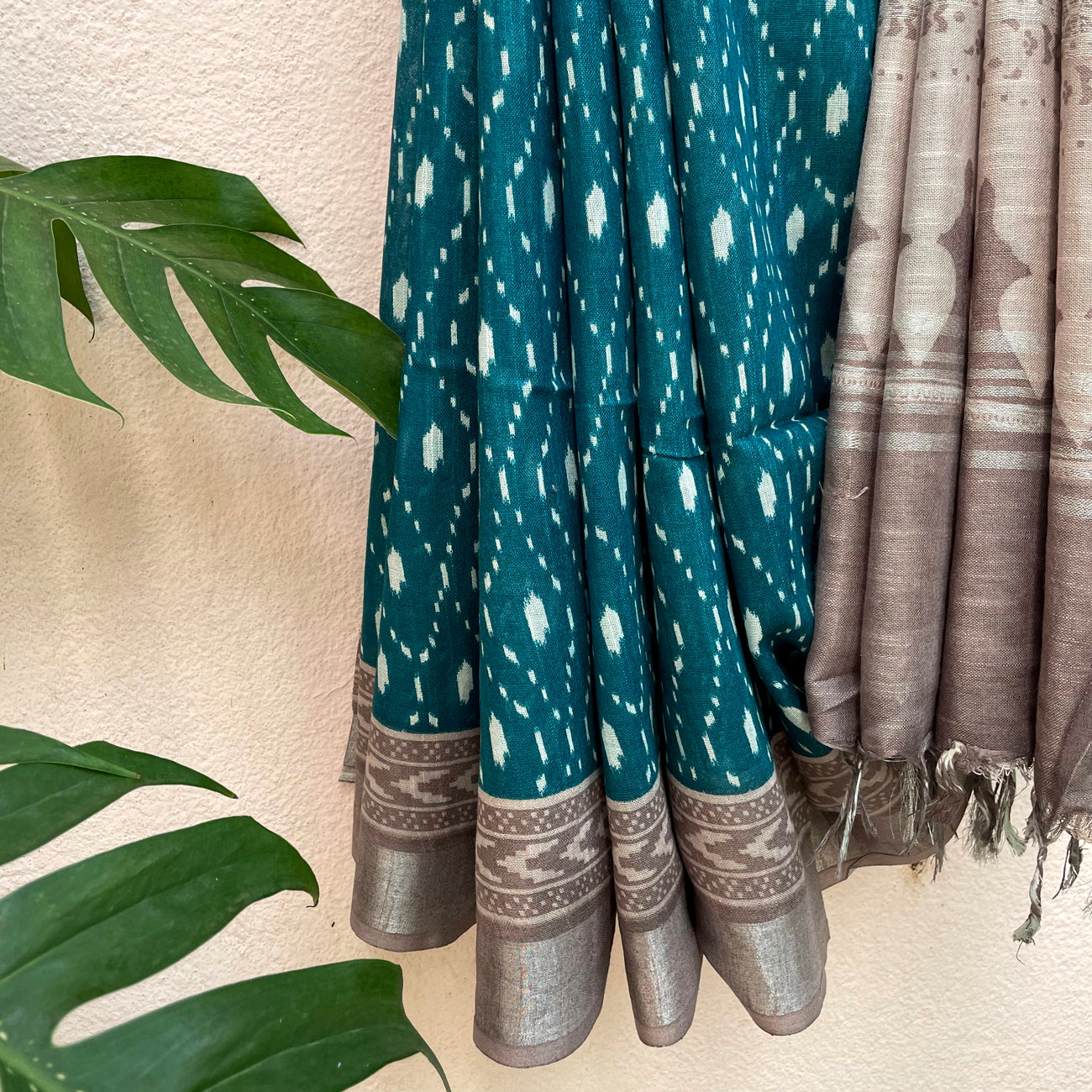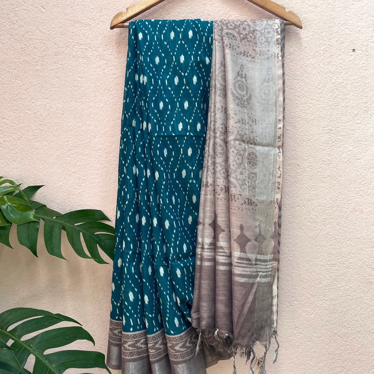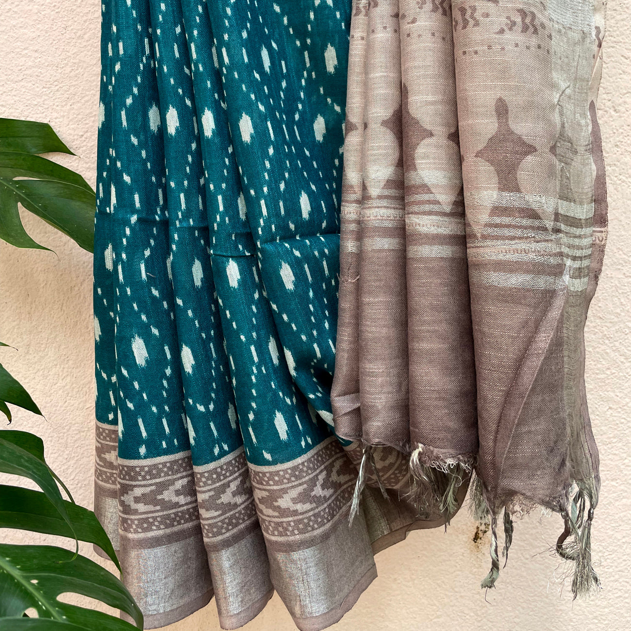 An amazing combination of sexy and classy is this teal blue organic linen saree. The geometric white motifs stand out perfectly on a teal base. Adding the oomph factor to this saree is the grey pallu with self designs and stripes. The dual tone border just blows anything else out of the water.