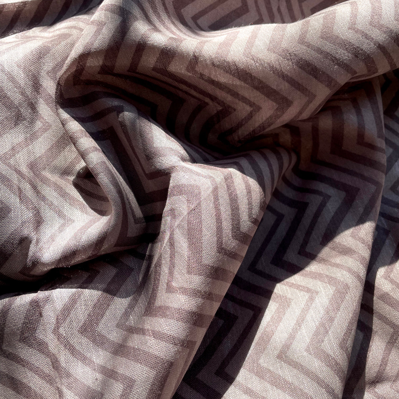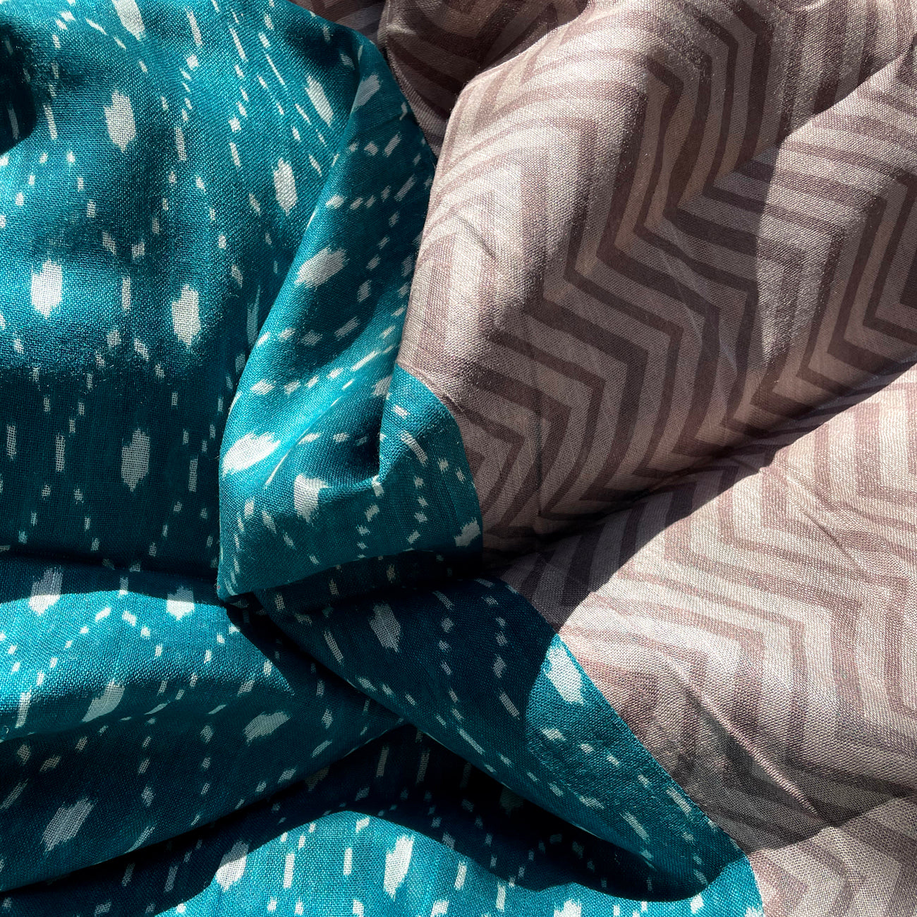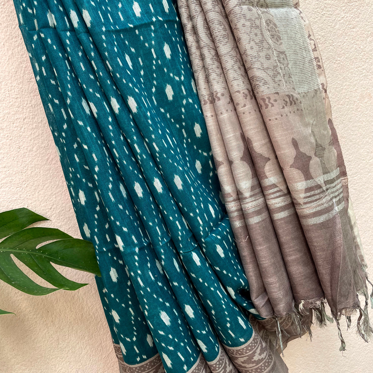 An amazing combination of sexy and classy is this teal blue organic linen saree. The geometric white motifs stand out perfectly on a teal base. Adding the oomph factor to this saree is the grey pallu with self designs and stripes. The dual tone border just blows anything else out of the water.
