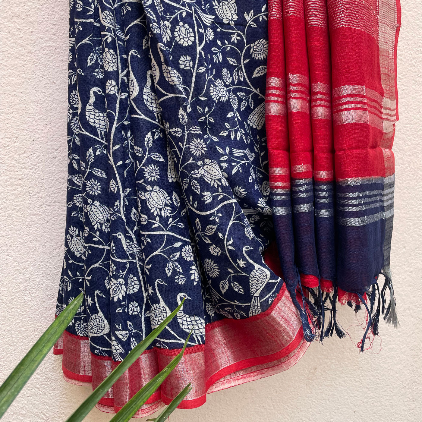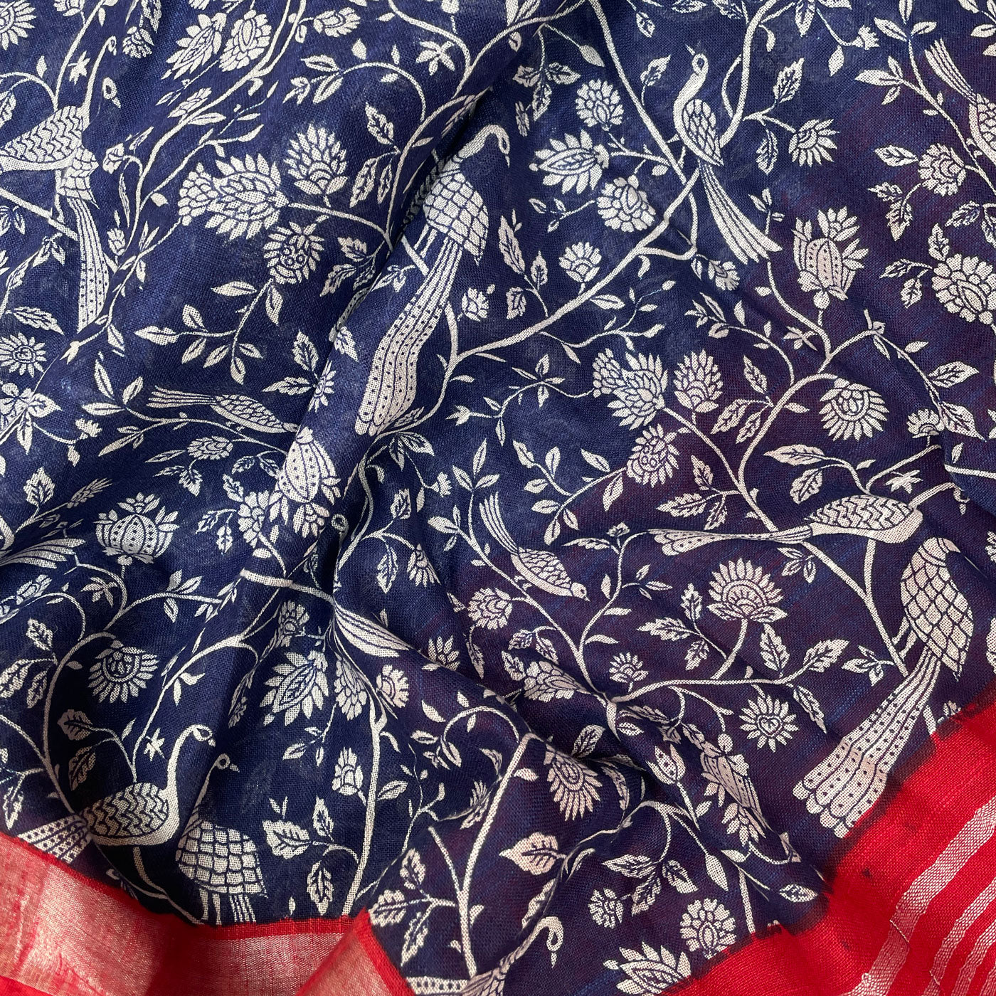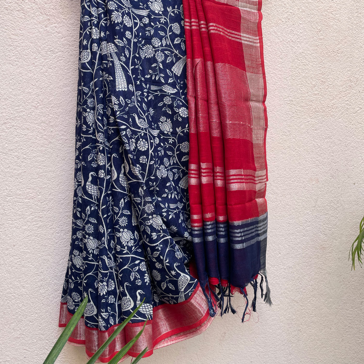 Beautiful forest inspired print on an Indigo Blue base with red zari border complemented with zari work on the pallu makes this drape a great selection for those evening parties.
