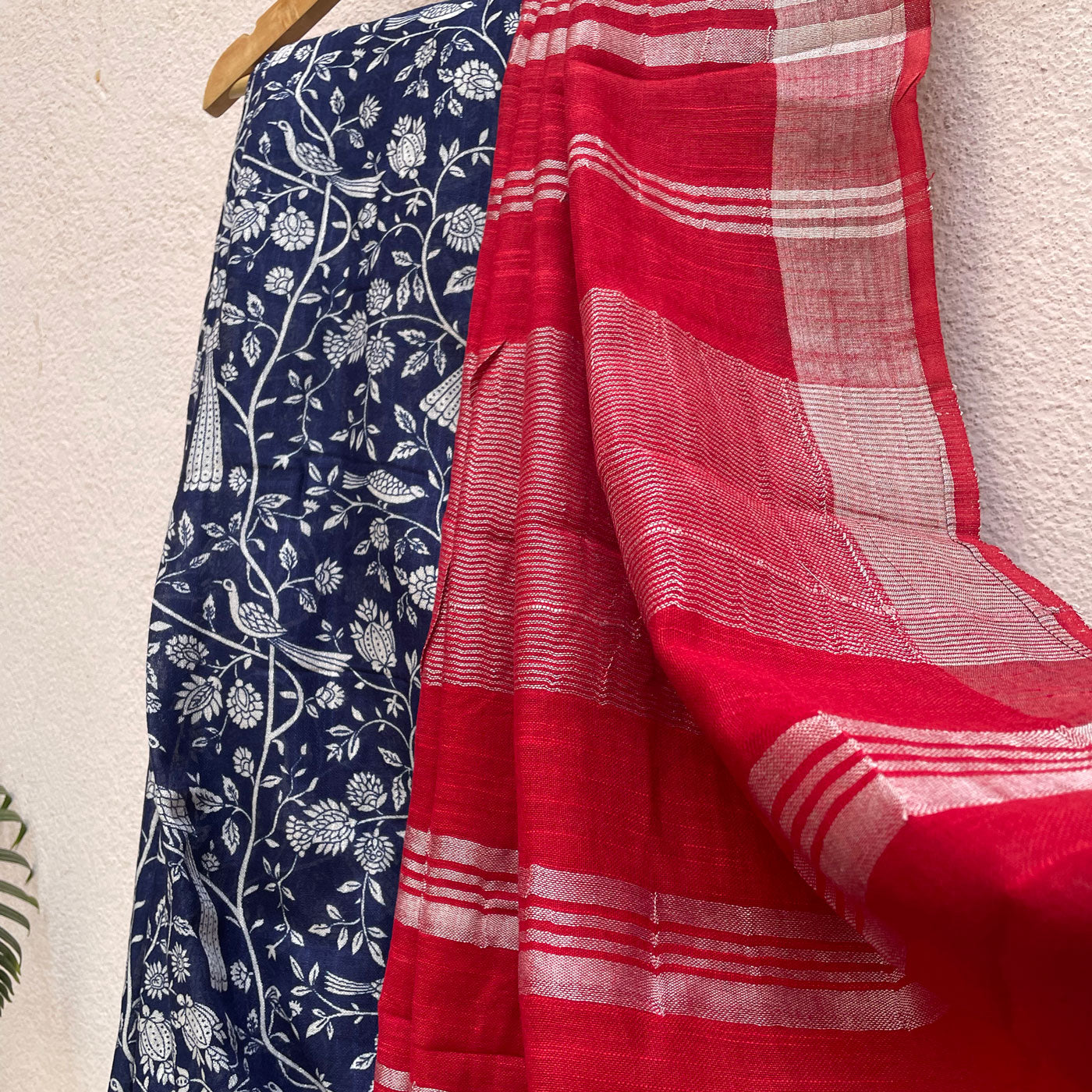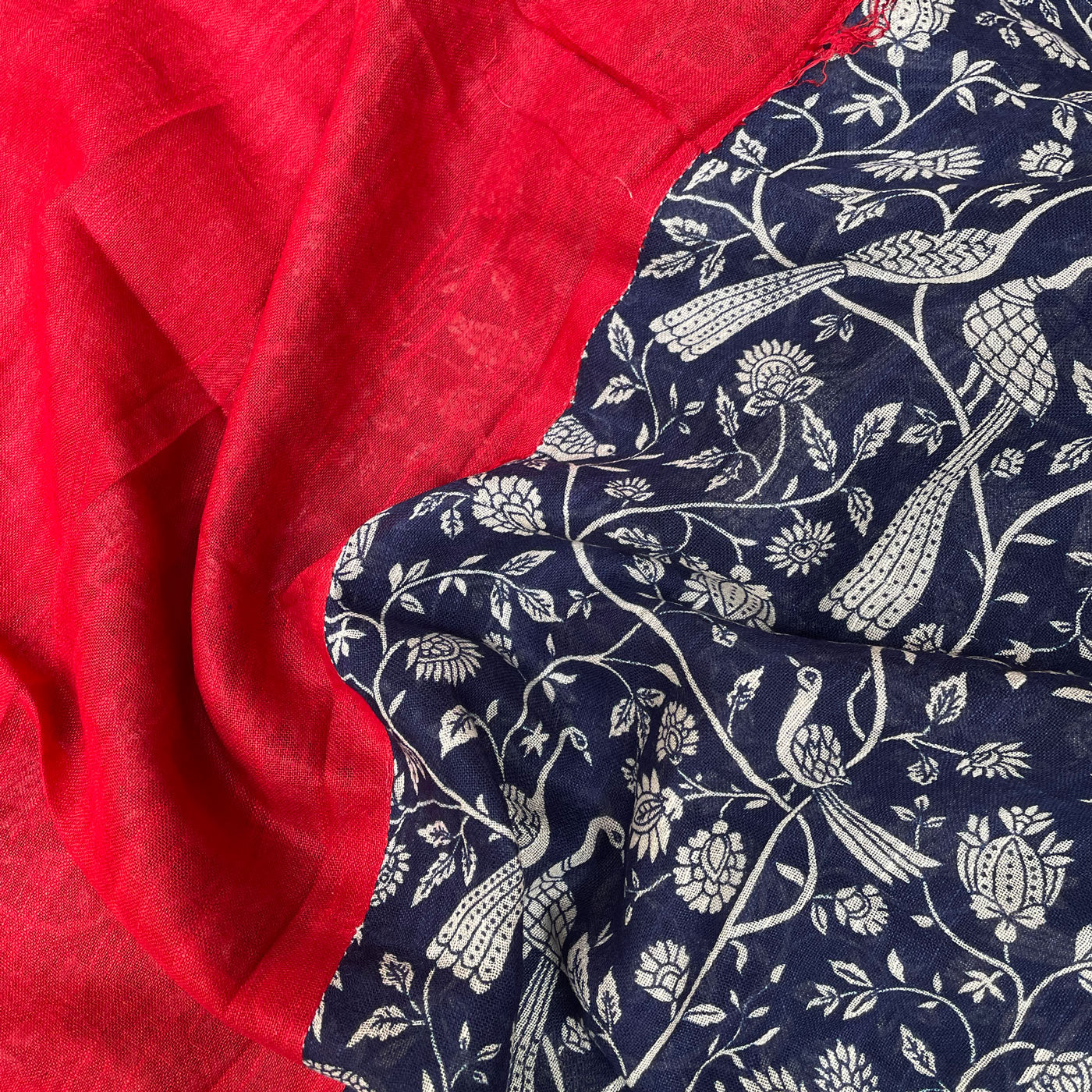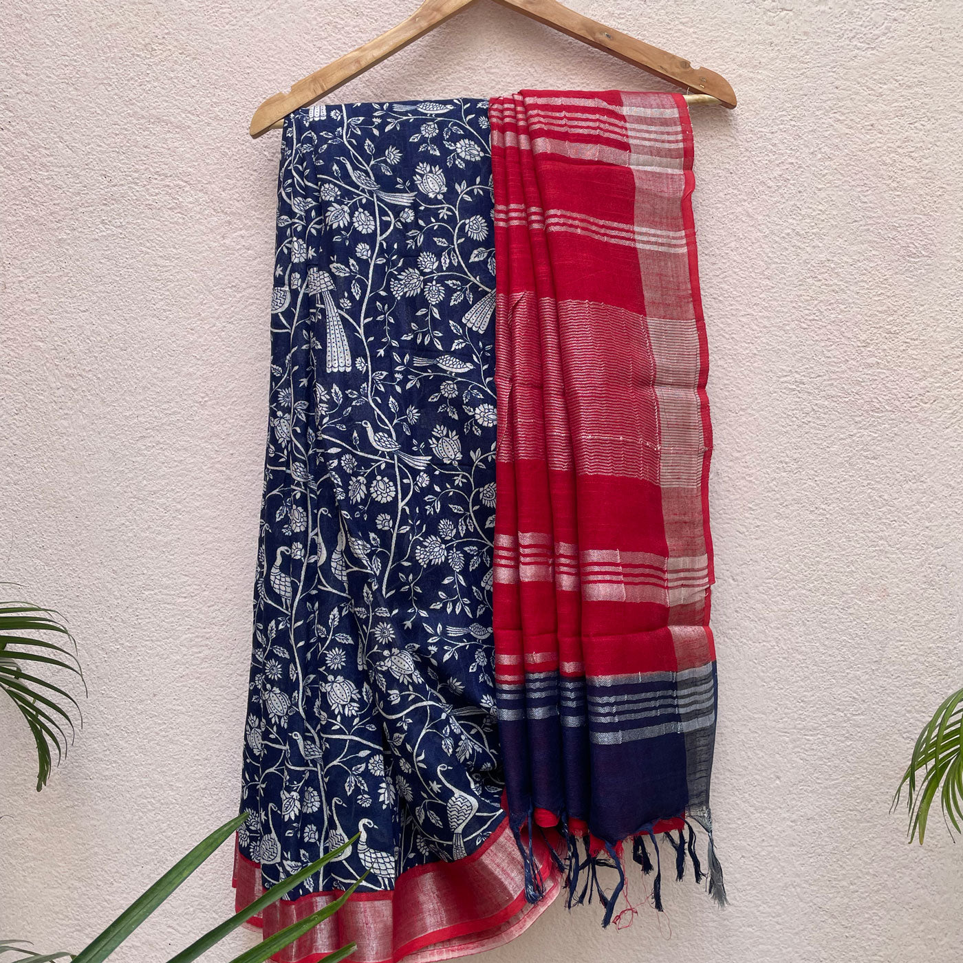 Beautiful forest inspired print on an Indigo Blue base with red zari border complemented with zari work on the pallu makes this drape a great selection for those evening parties.