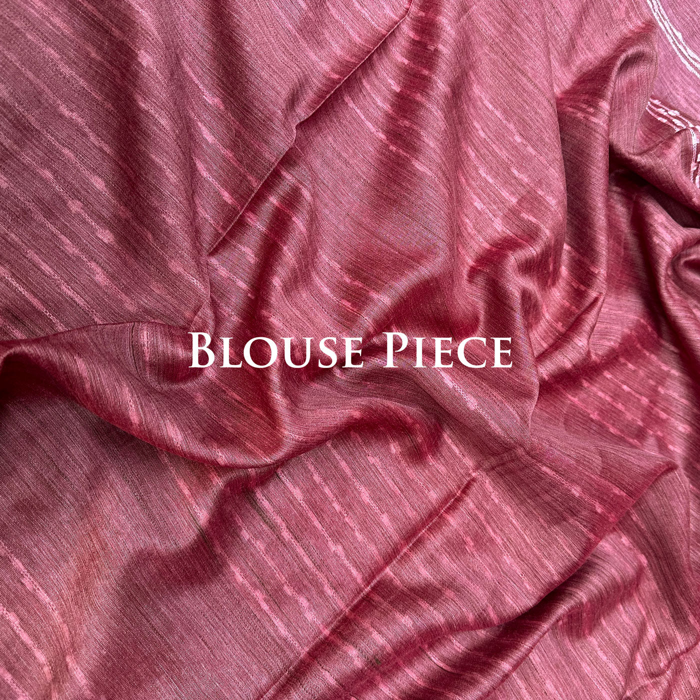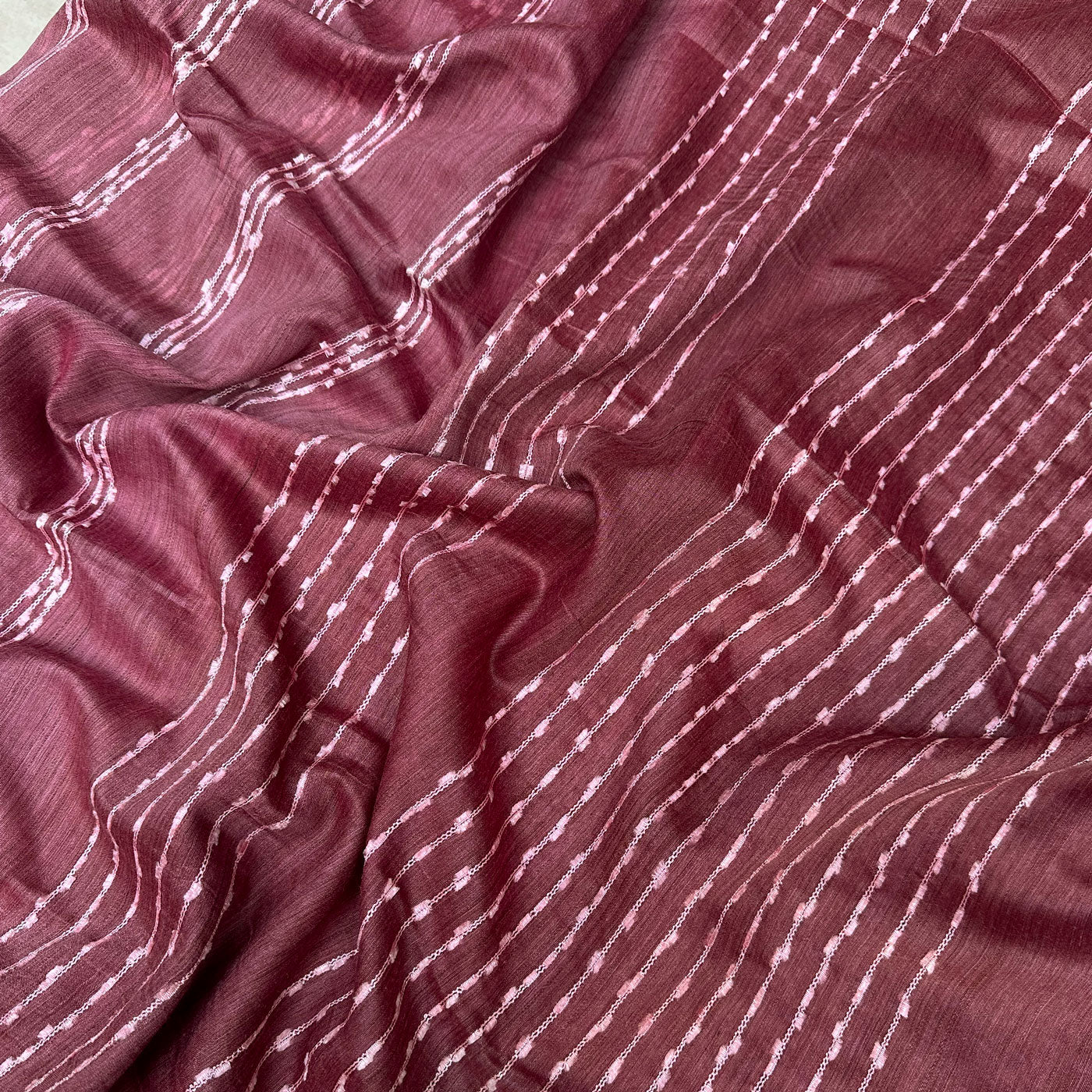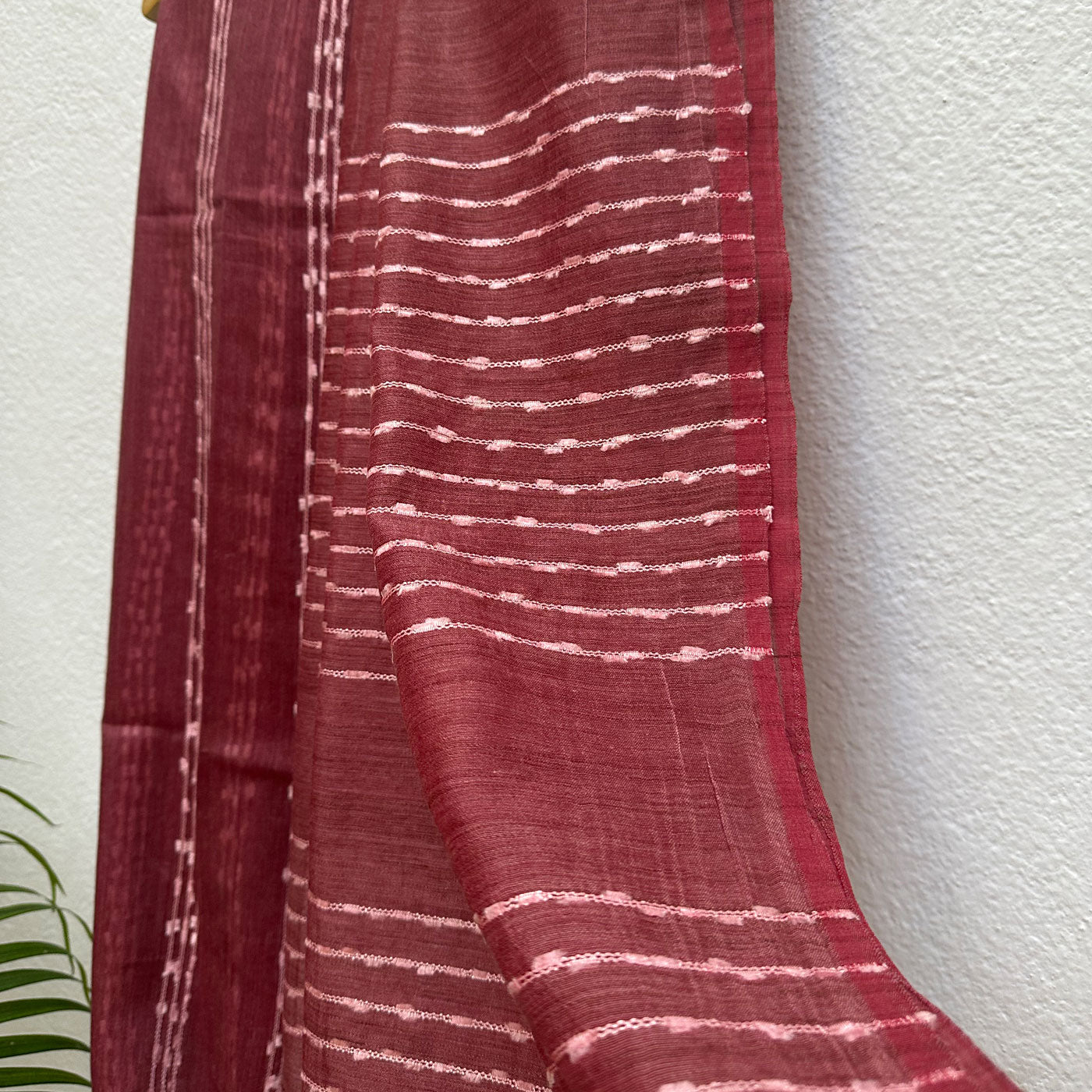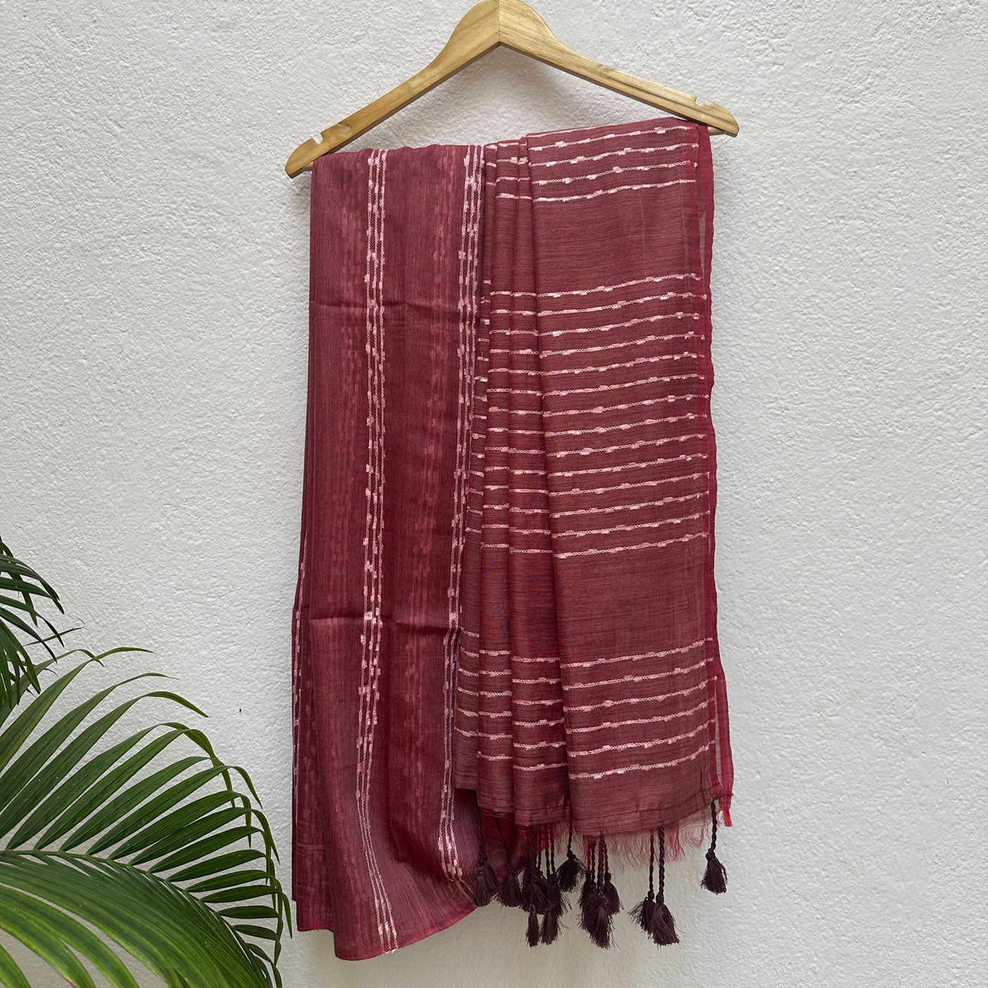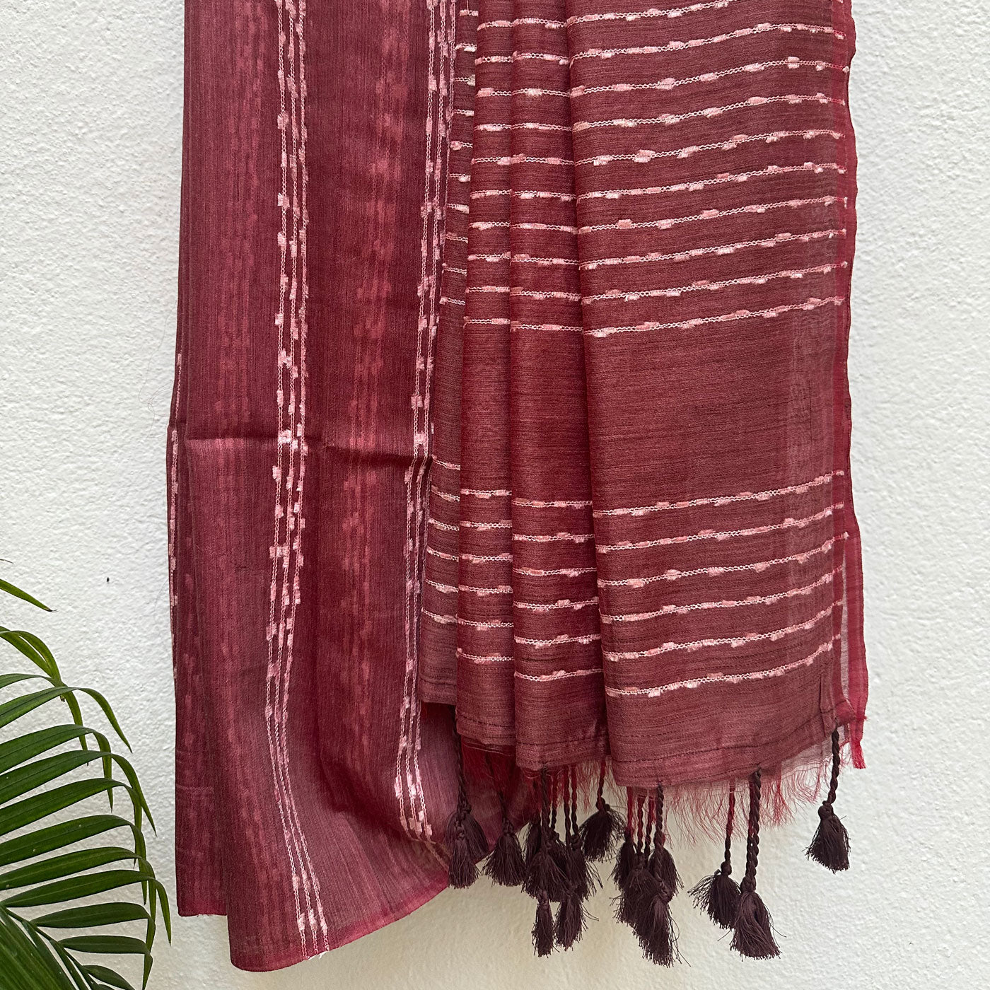 Elevate your style with the Cotton Bamboo Silk Saree in Maroon color. This saree boasts a one-of-a-kind fancy yarn stripes, while the pallu features horizontal playful striped details in fancy yarnn and coordinating tassels. Let these tassels be a chic and stylish statement of your unique fashion sense.