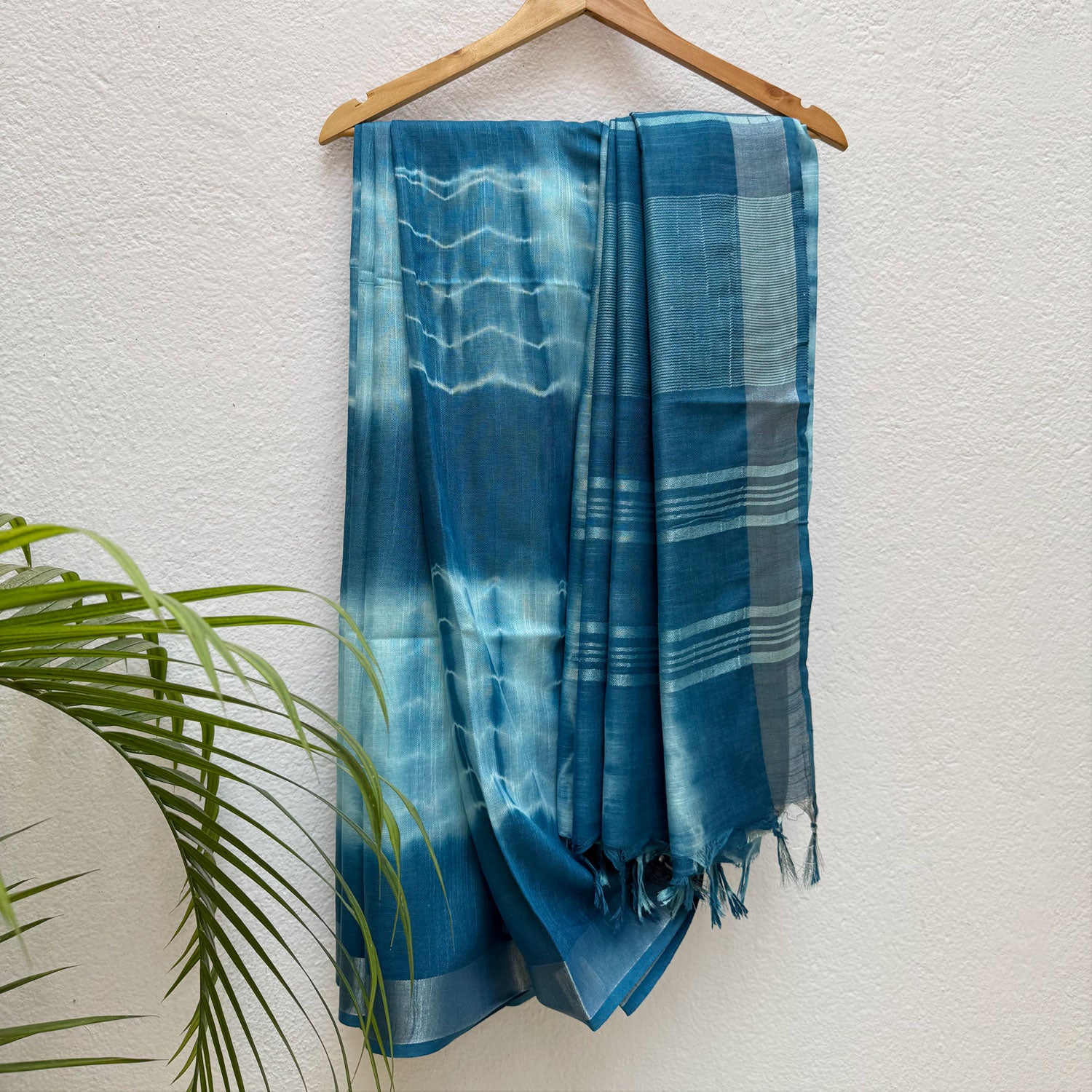 Shibori makes a comeback with this Diva Blue Cotton Linen Saree.