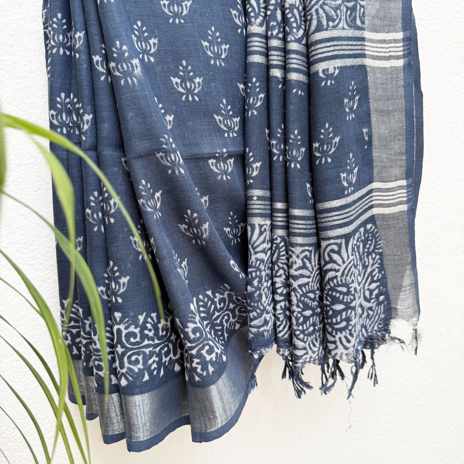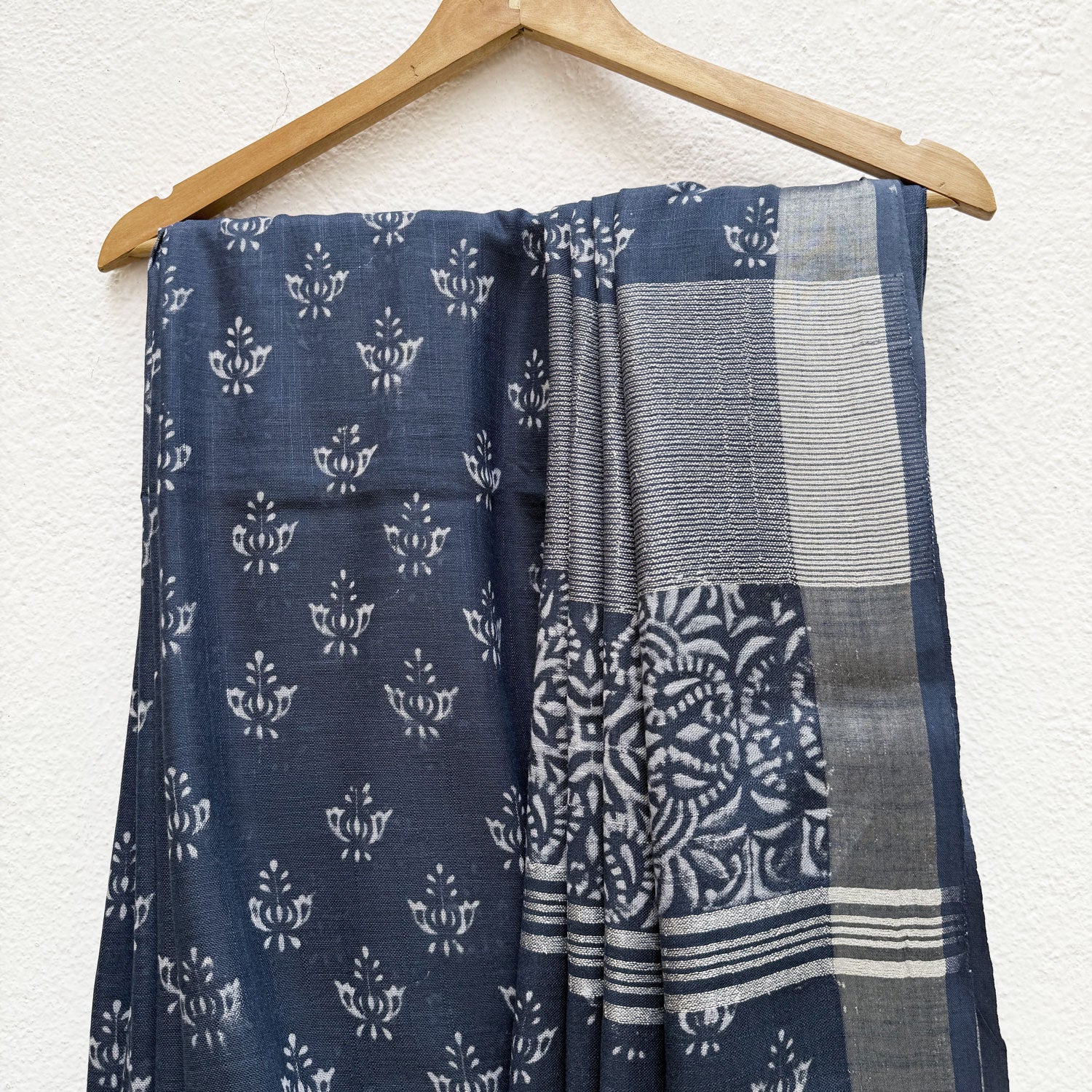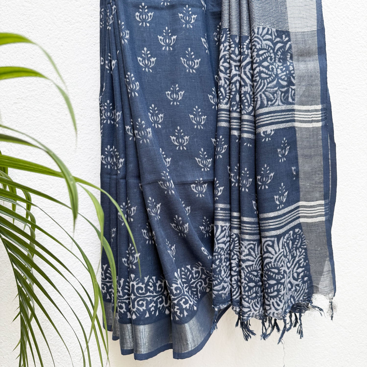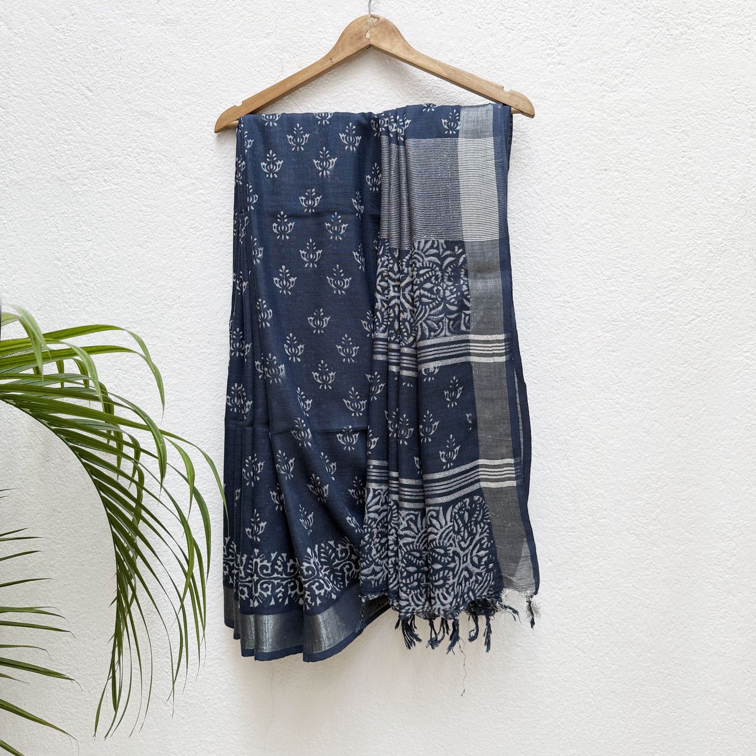 Ekansh Indigo Hand Block Cotton Linen Saree
