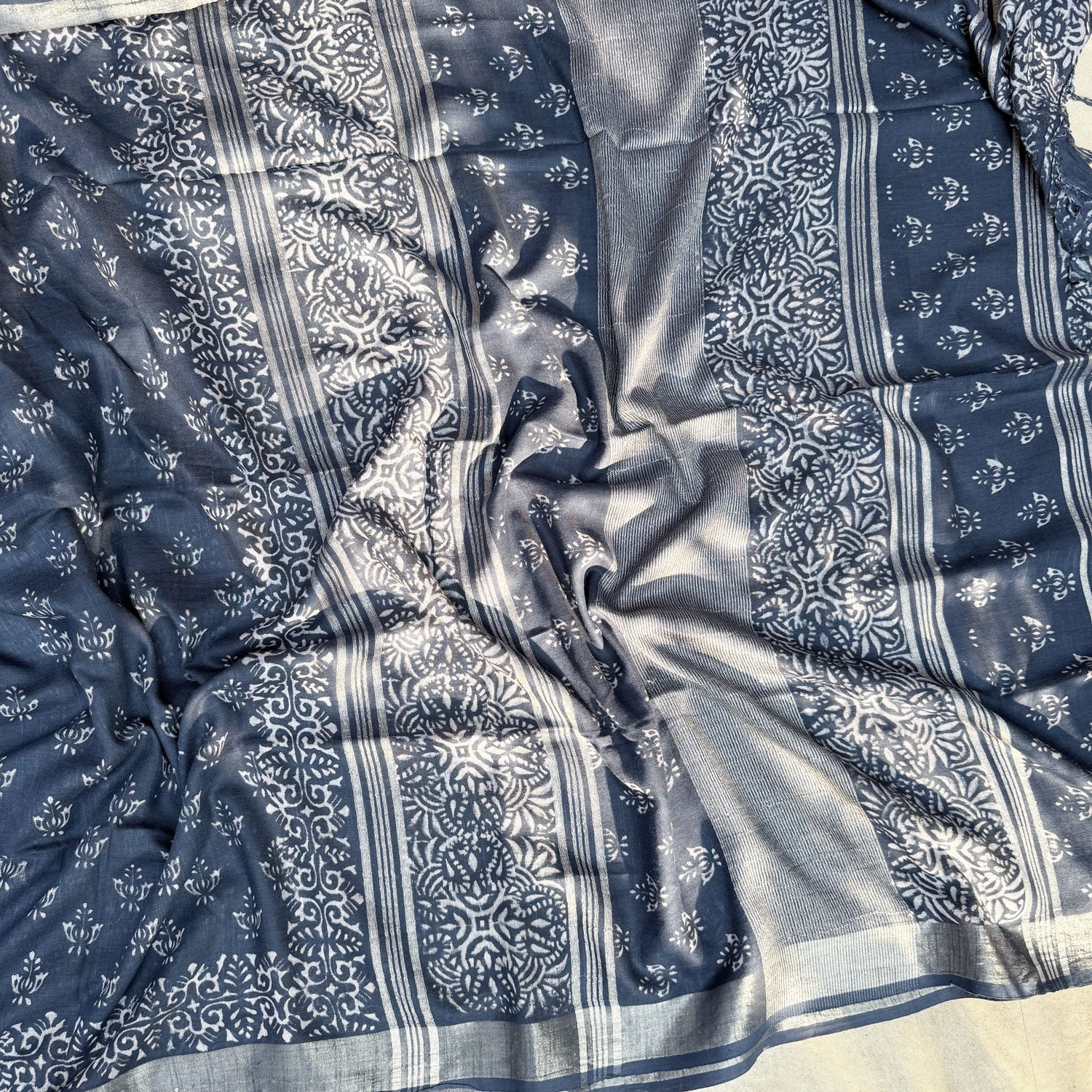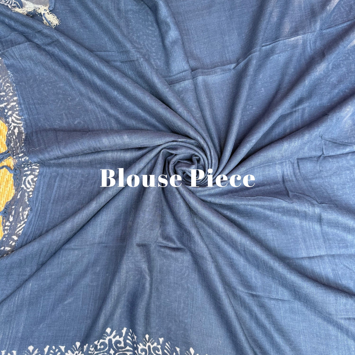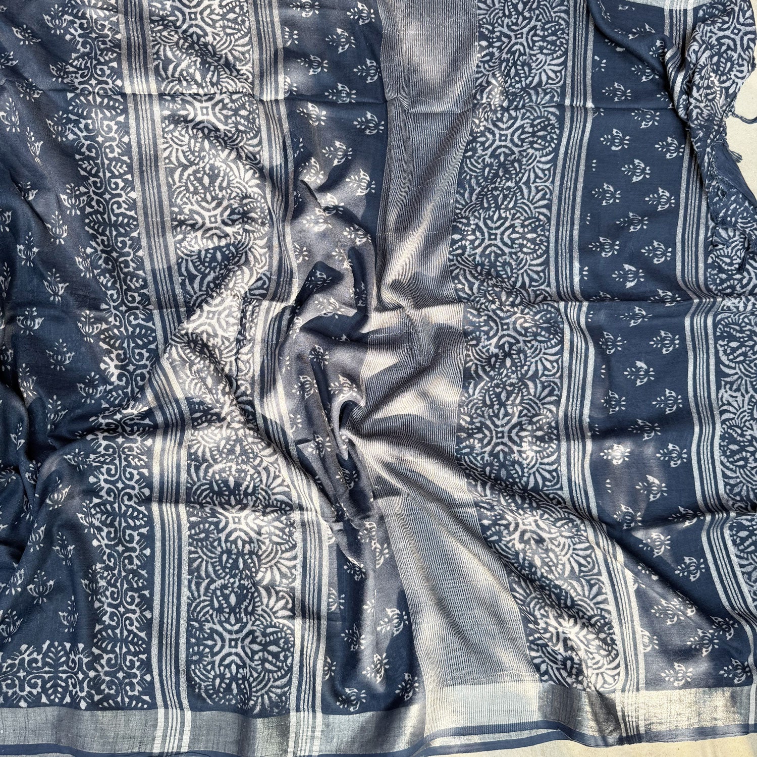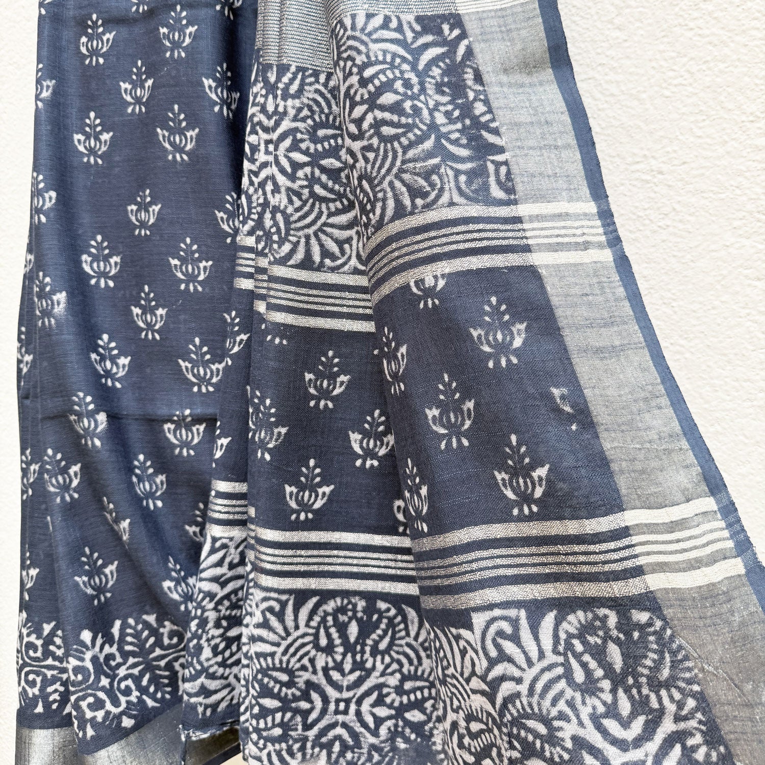 Ekansh Indigo Hand Block Cotton Linen Saree