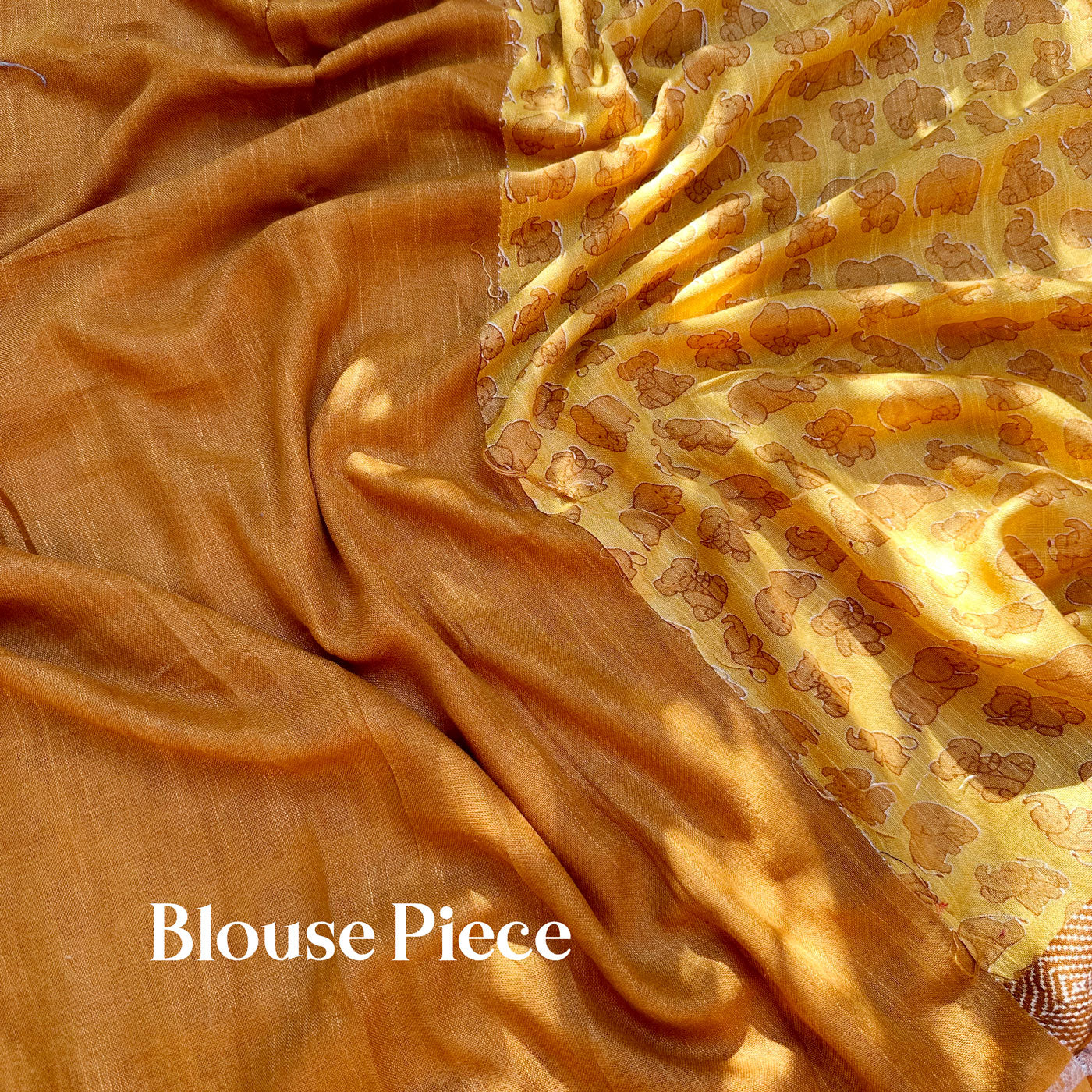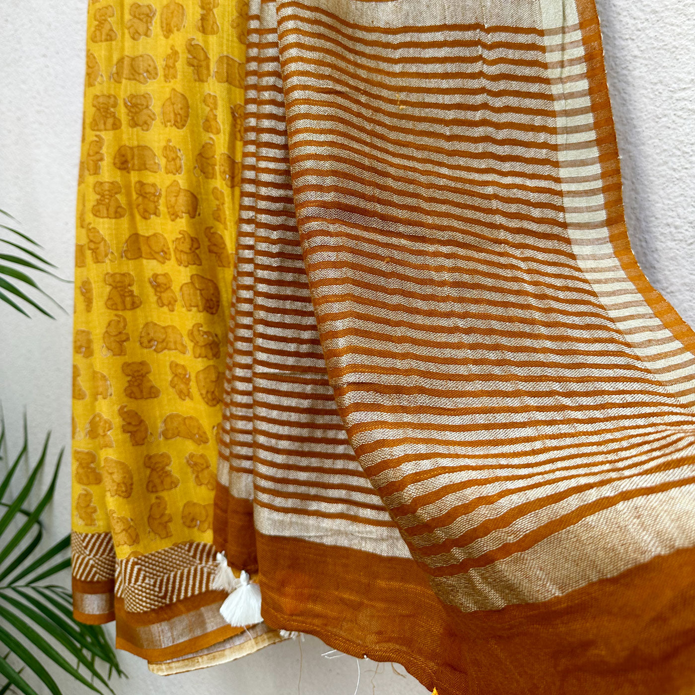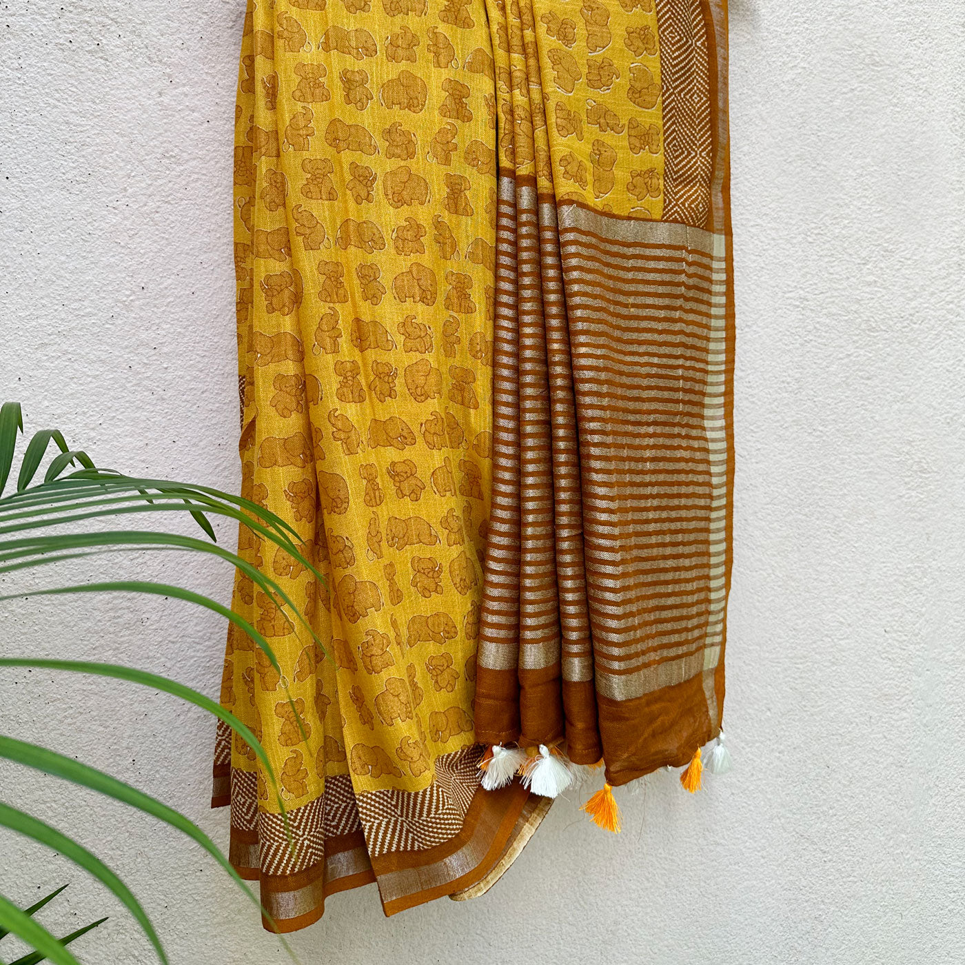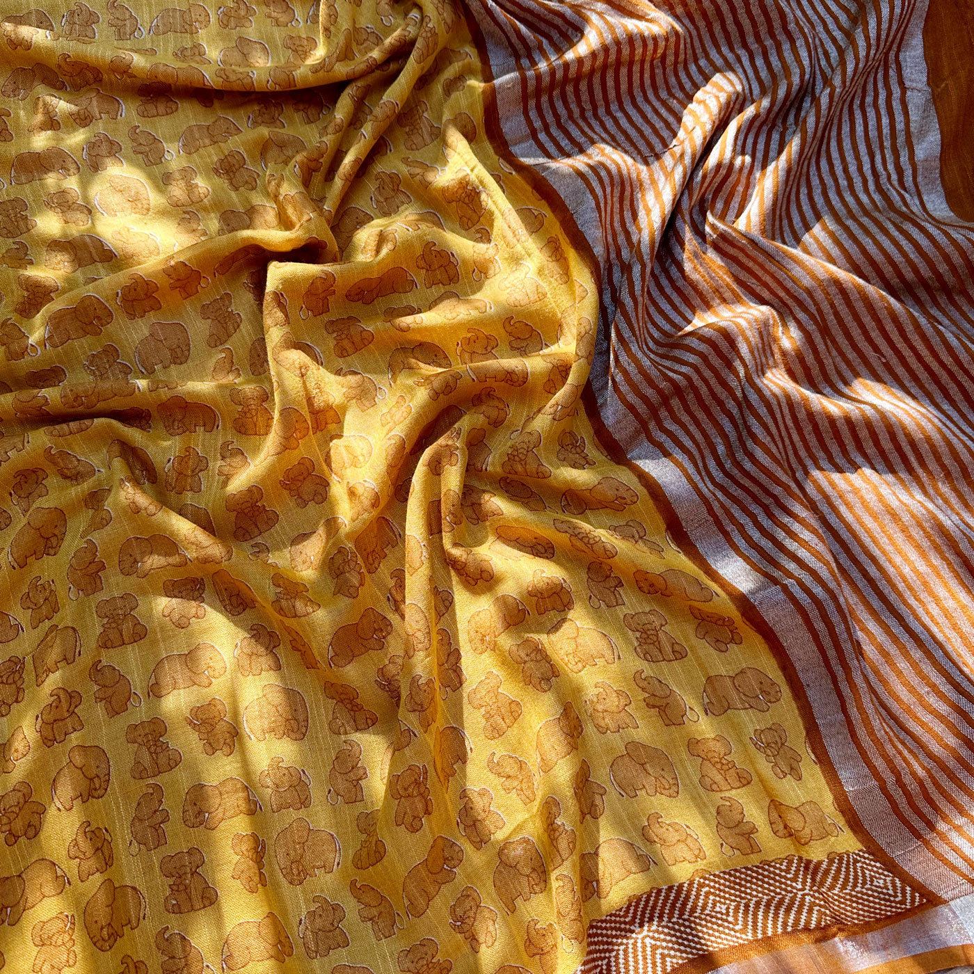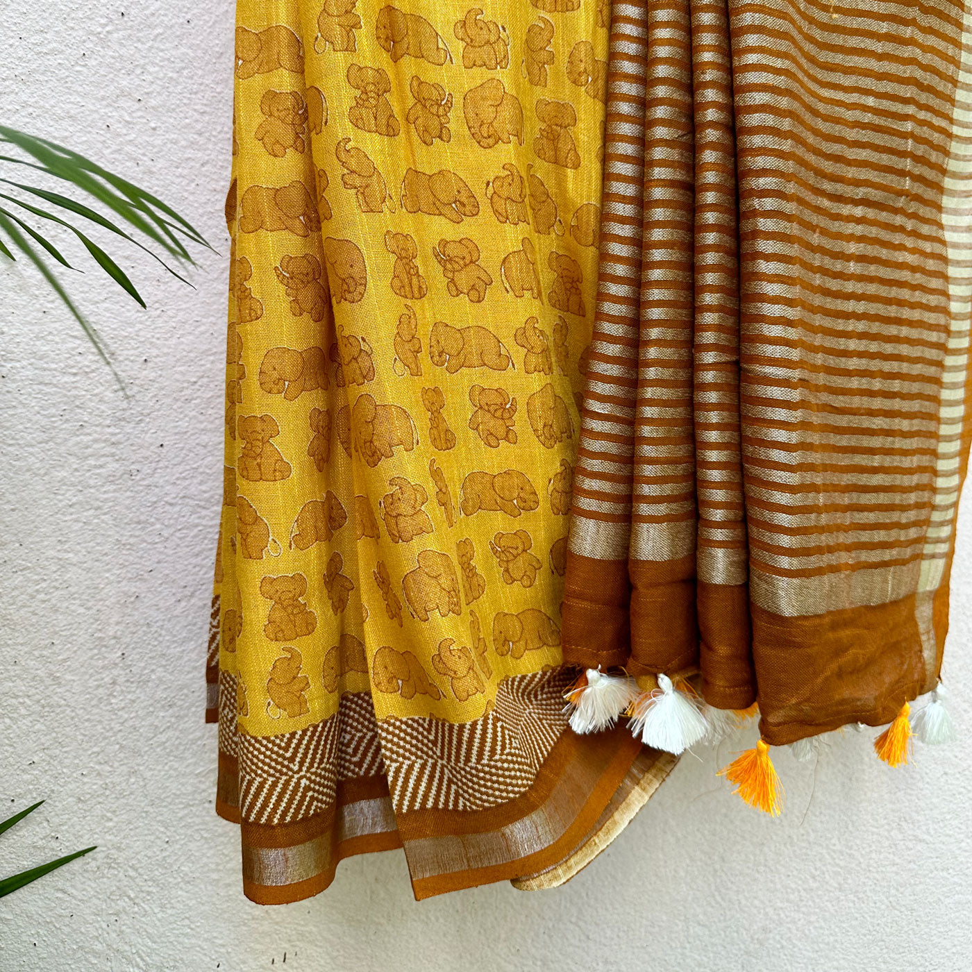 Embrace your wild side with this eccentric hand screen printed saree, featuring a playful elephant pattern and a geometric border. The dual colored tassel and vibrant print adds an element of fun, making this saree a standout piece that's guaranteed to grab attention. Complete the look with your favorite accessories and show off your individuality and vivacity! Why blend in when you can stand out!
