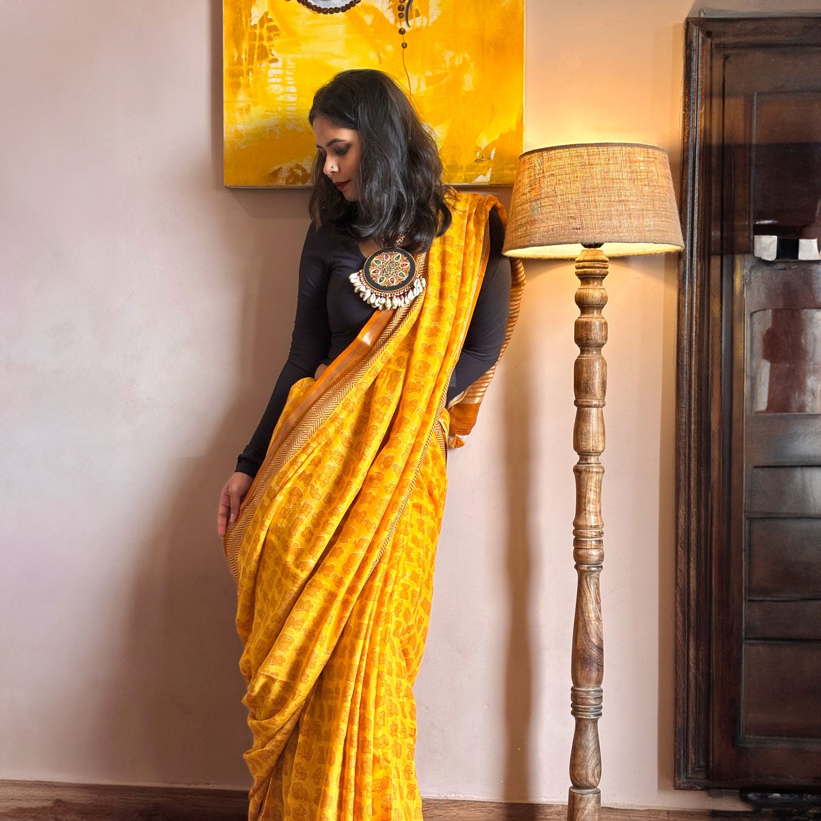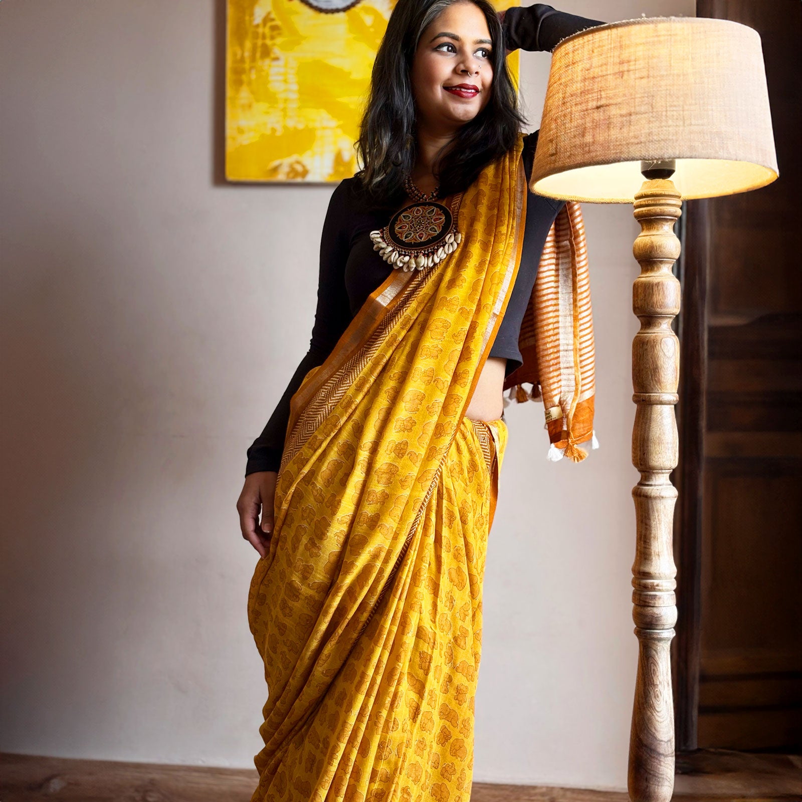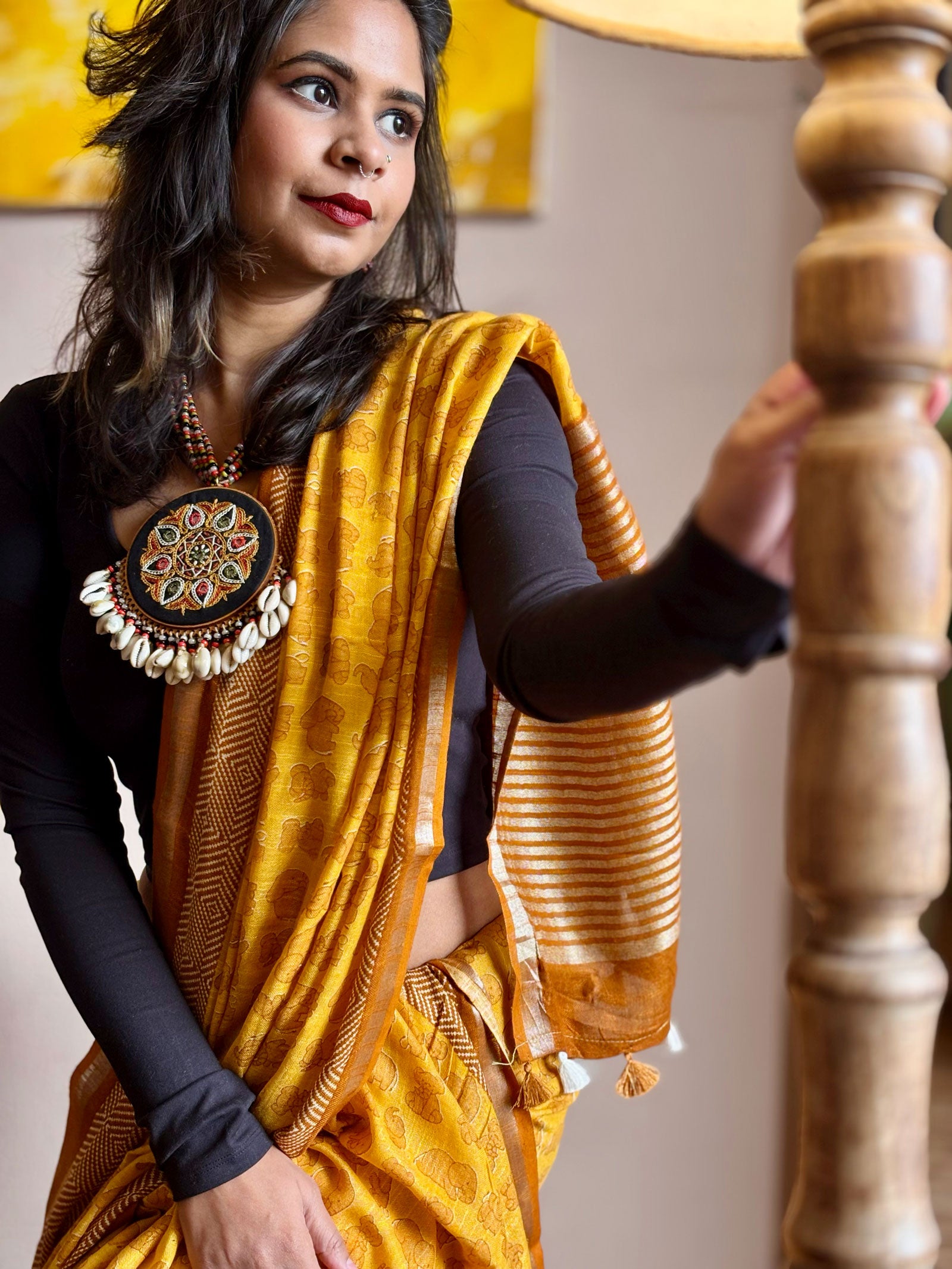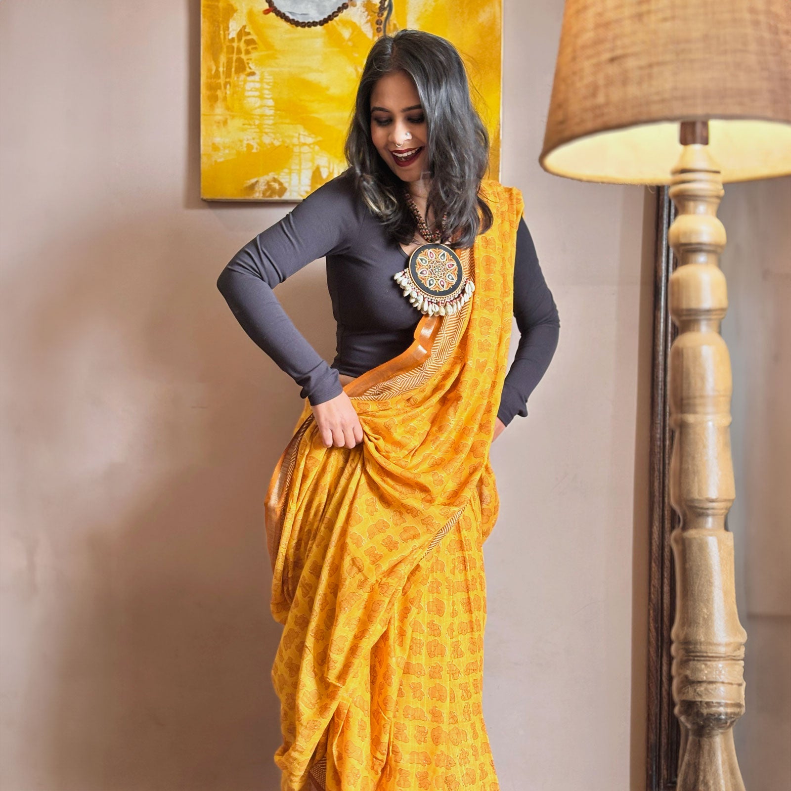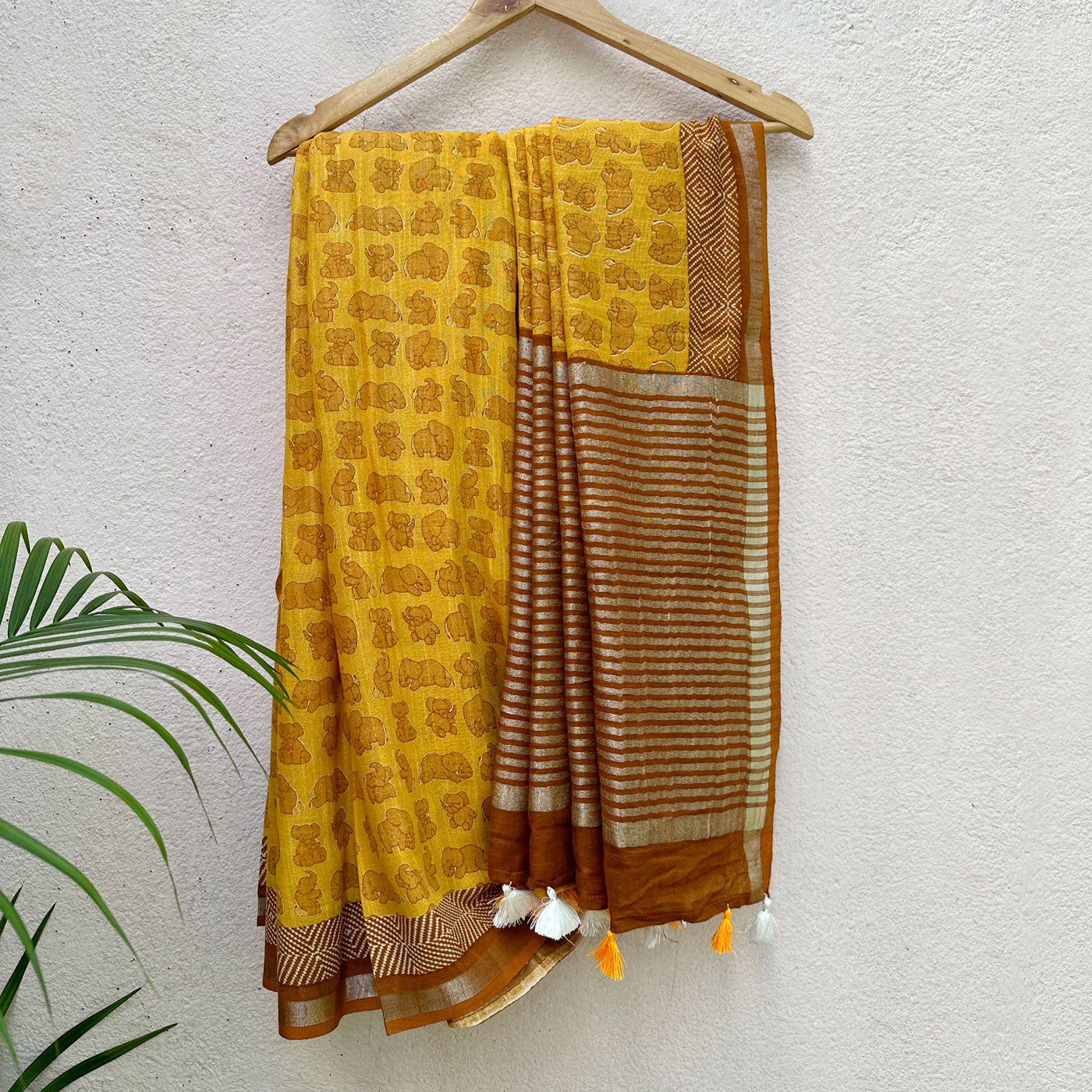Embrace your wild side with this eccentric hand screen printed saree, featuring a playful elephant pattern and a geometric border. The dual colored tassel and vibrant print adds an element of fun, making this saree a standout piece that's guaranteed to grab attention. Complete the look with your favorite accessories and show off your individuality and vivacity! Why blend in when you can stand out!