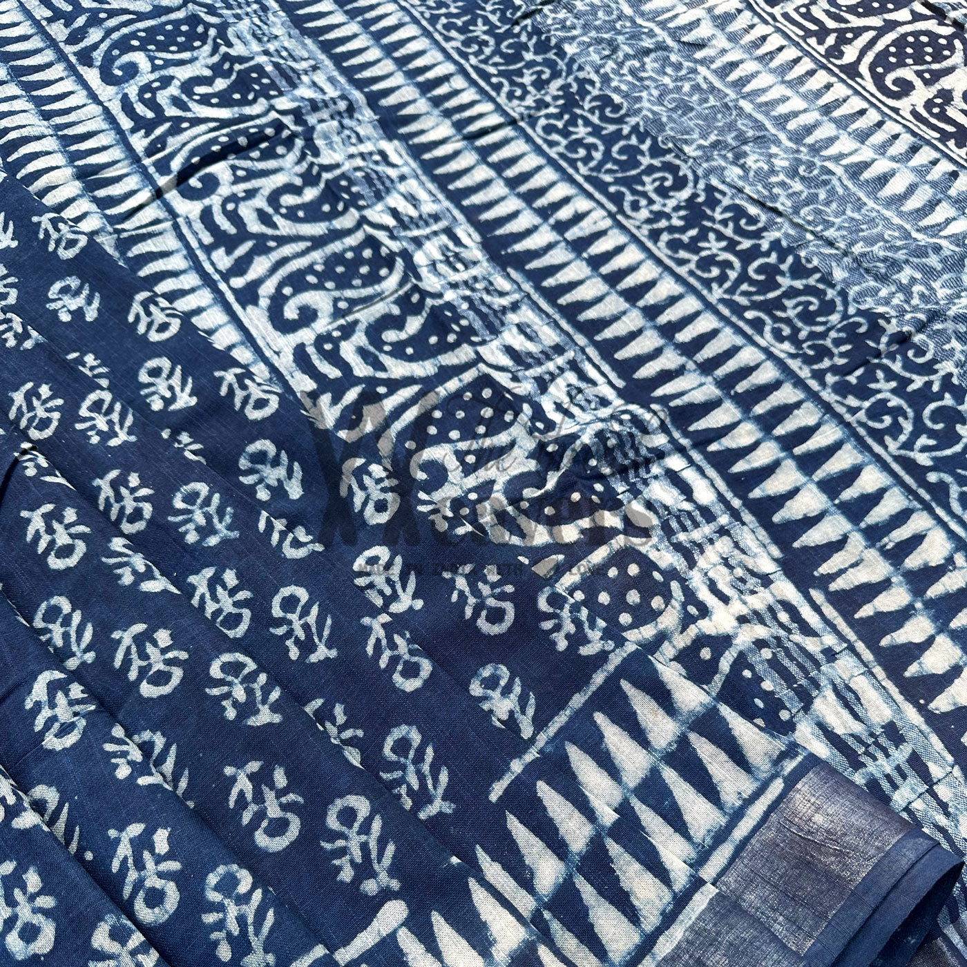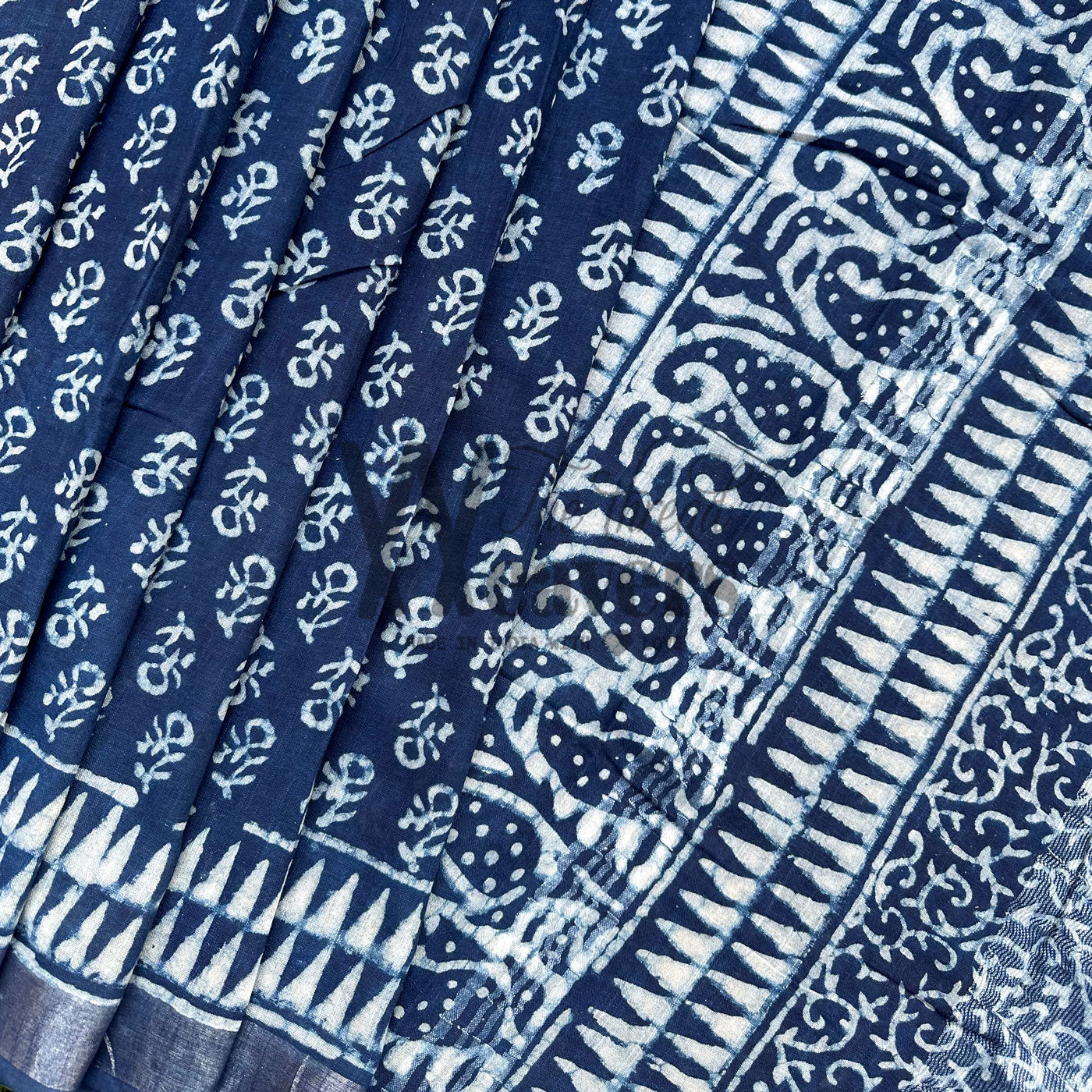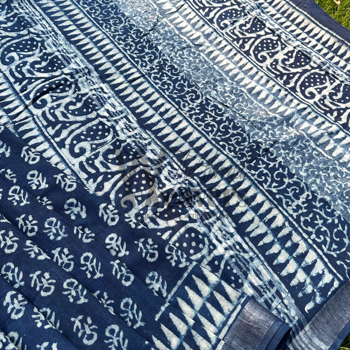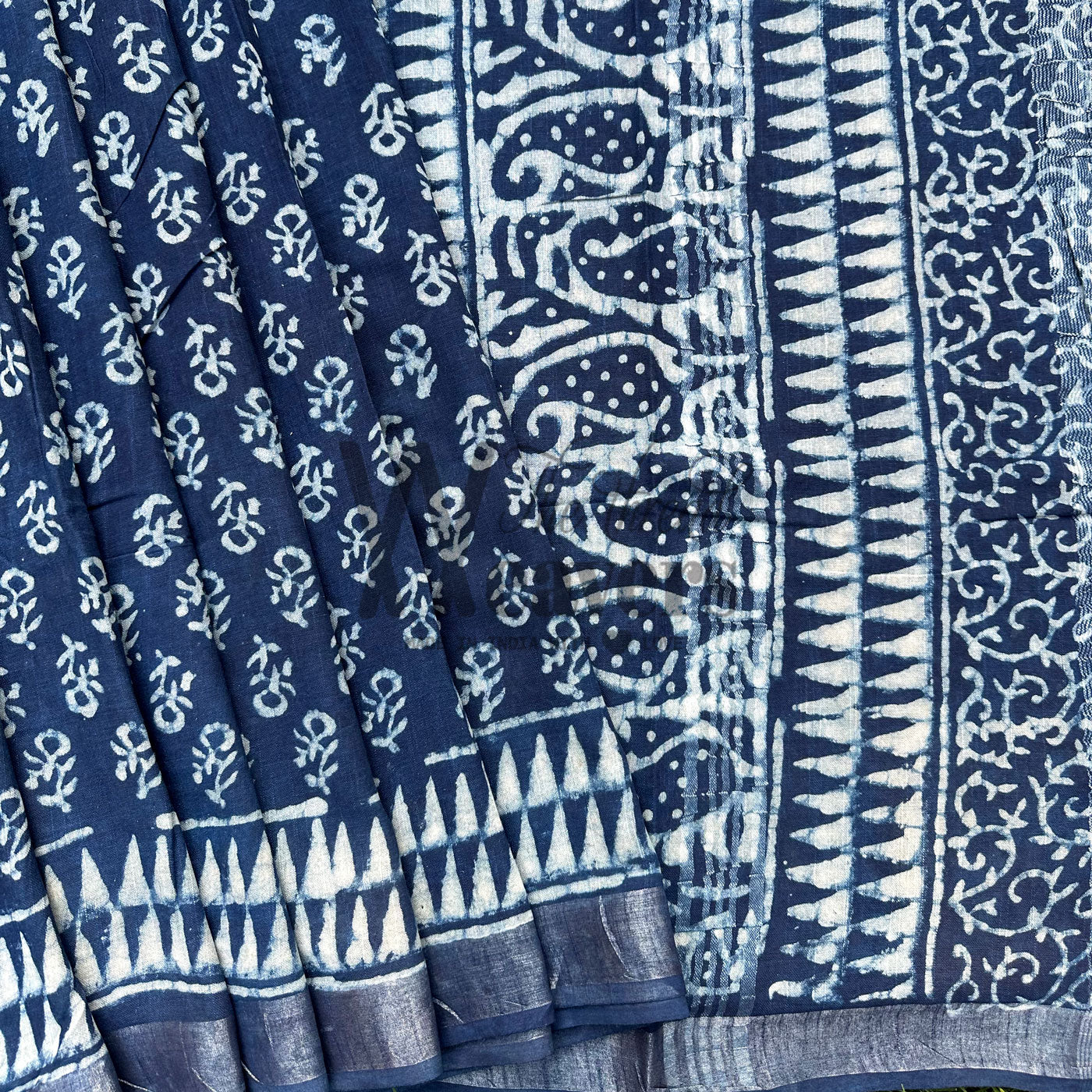 Gulbahaar Indigo Hand Block Cotton Linen Saree