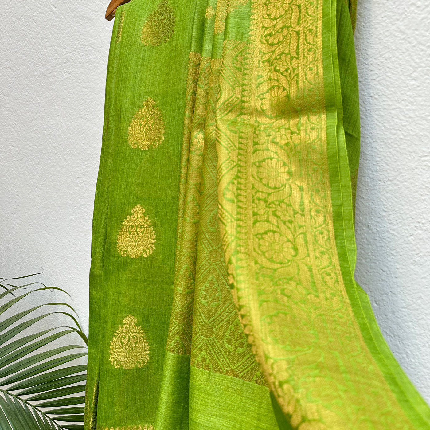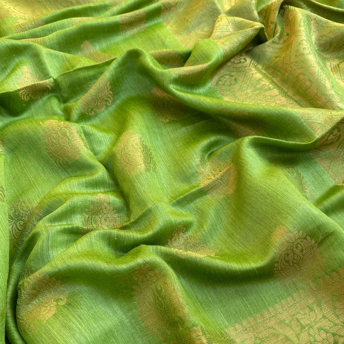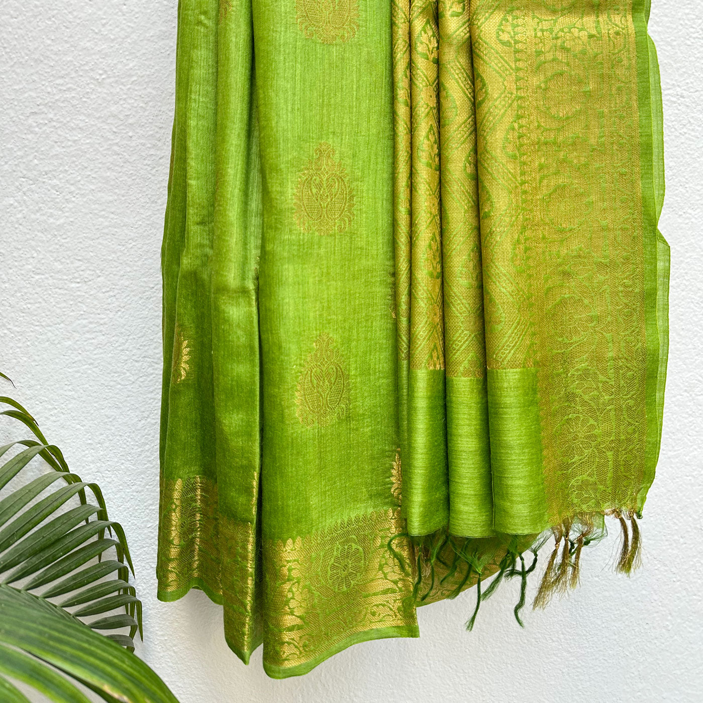 Impress with the stunning Gulmohar Pure Tussar Jacquard Silk Saree in green. Its opulent border and pallu are intricately embellished, exuding sophistication and poise. The delicate butis on the body add a hint of allure, perfect for impromptu dinners with loved ones or for dressing up for weddings, festive occasions, and special events.