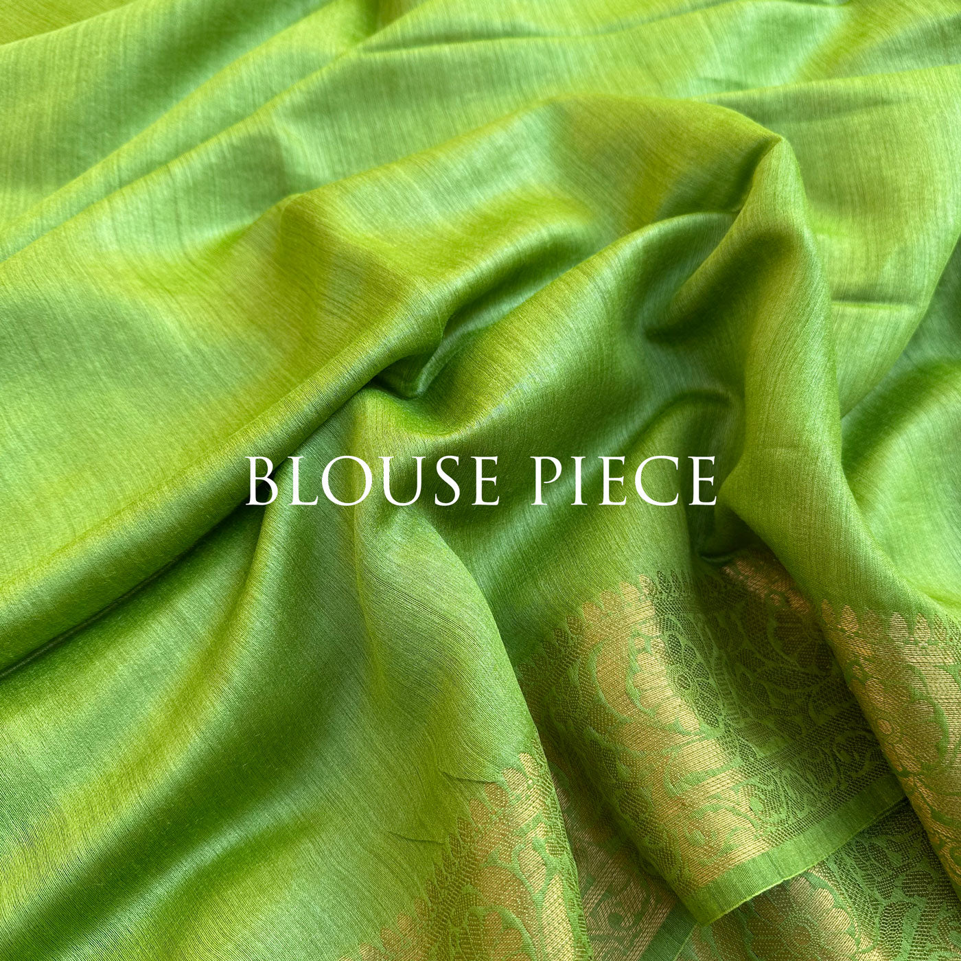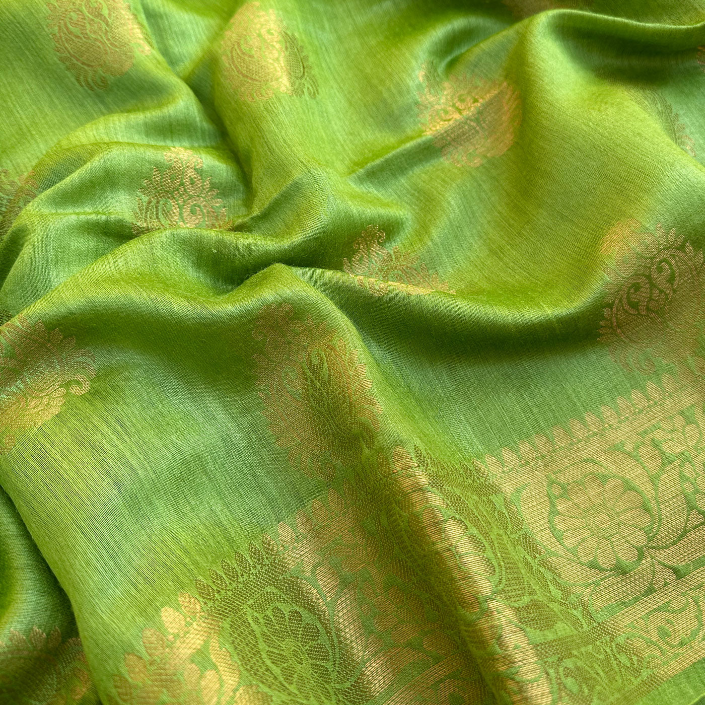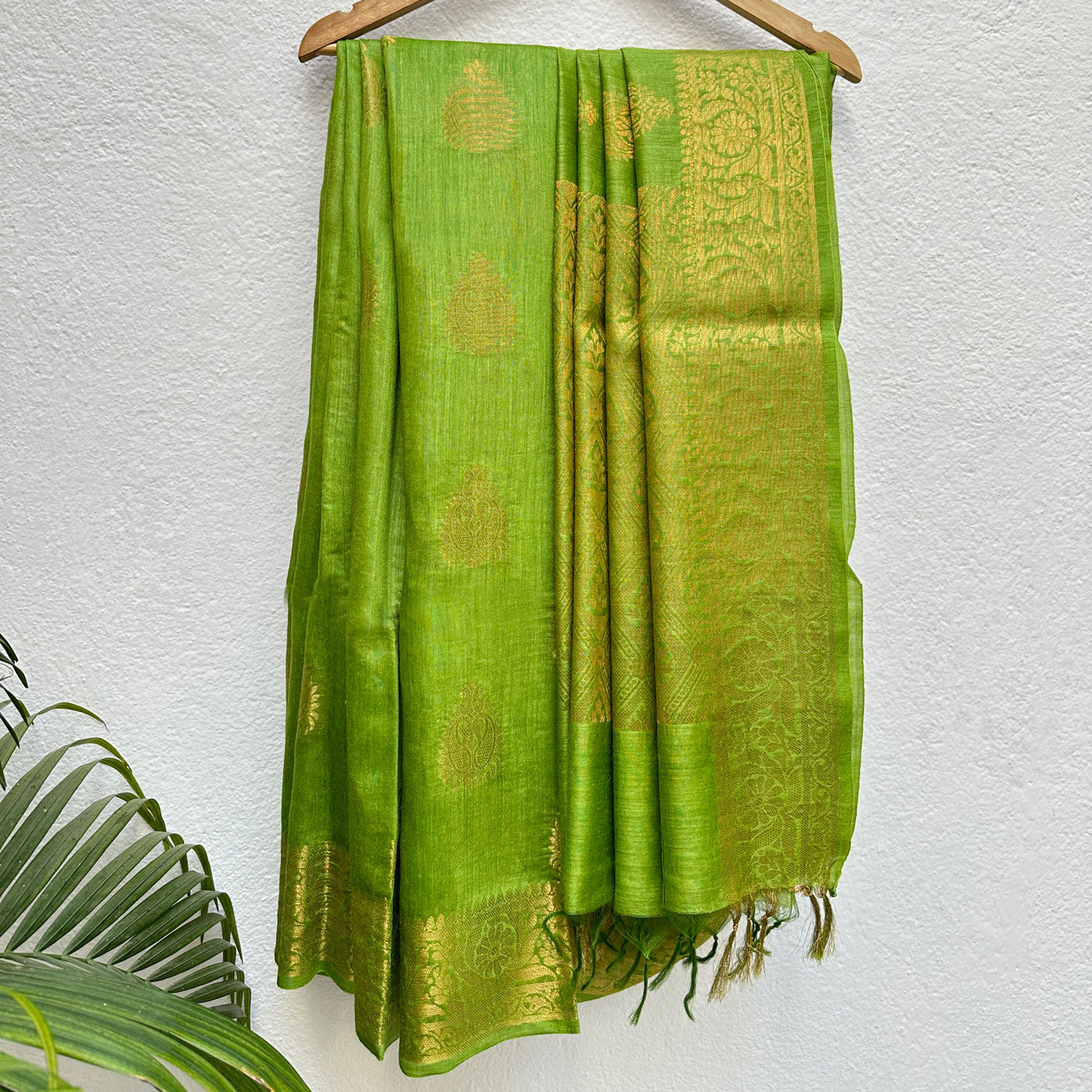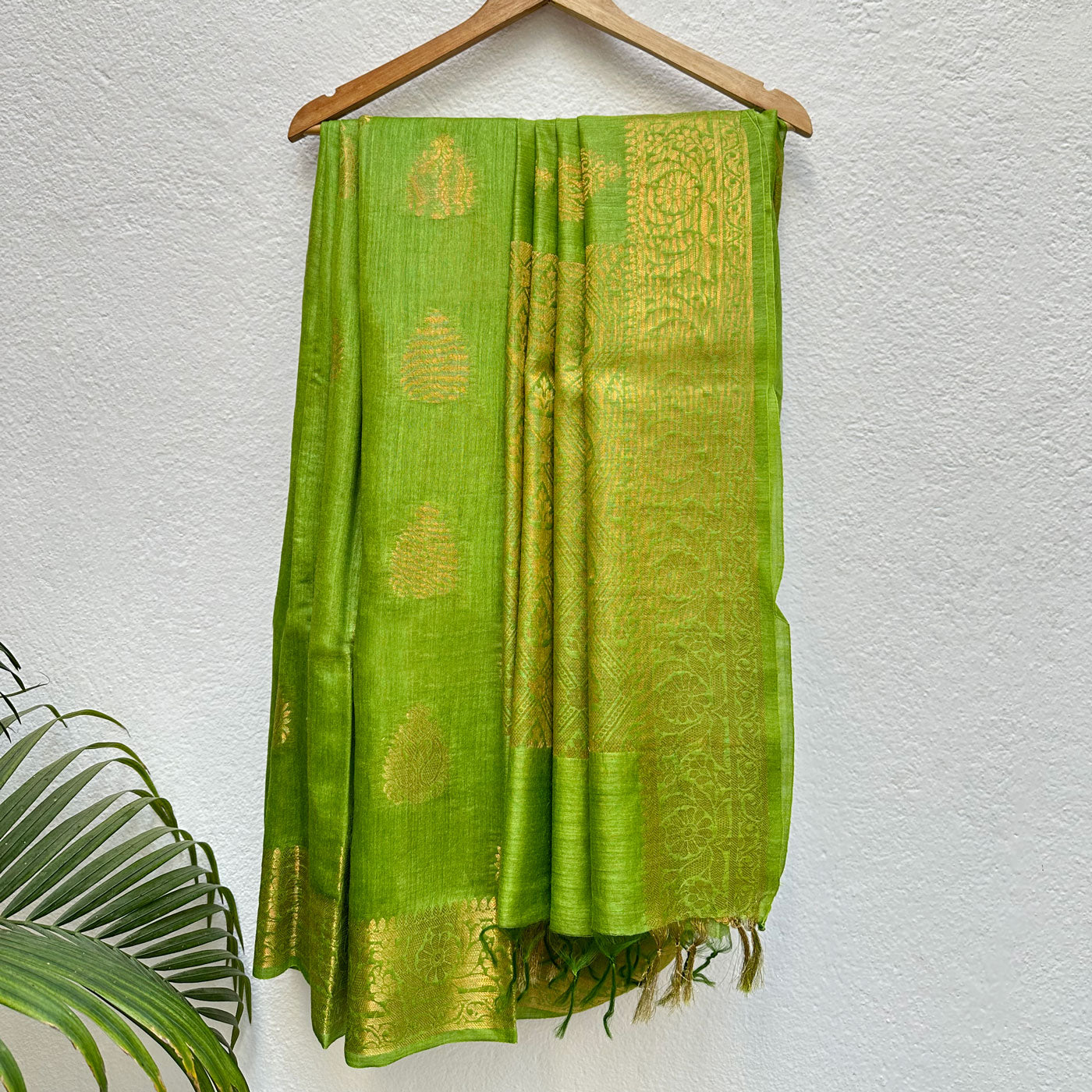 Impress with the stunning Gulmohar Pure Tussar Jacquard Silk Saree in green. Its opulent border and pallu are intricately embellished, exuding sophistication and poise. The delicate butis on the body add a hint of allure, perfect for impromptu dinners with loved ones or for dressing up for weddings, festive occasions, and special events.