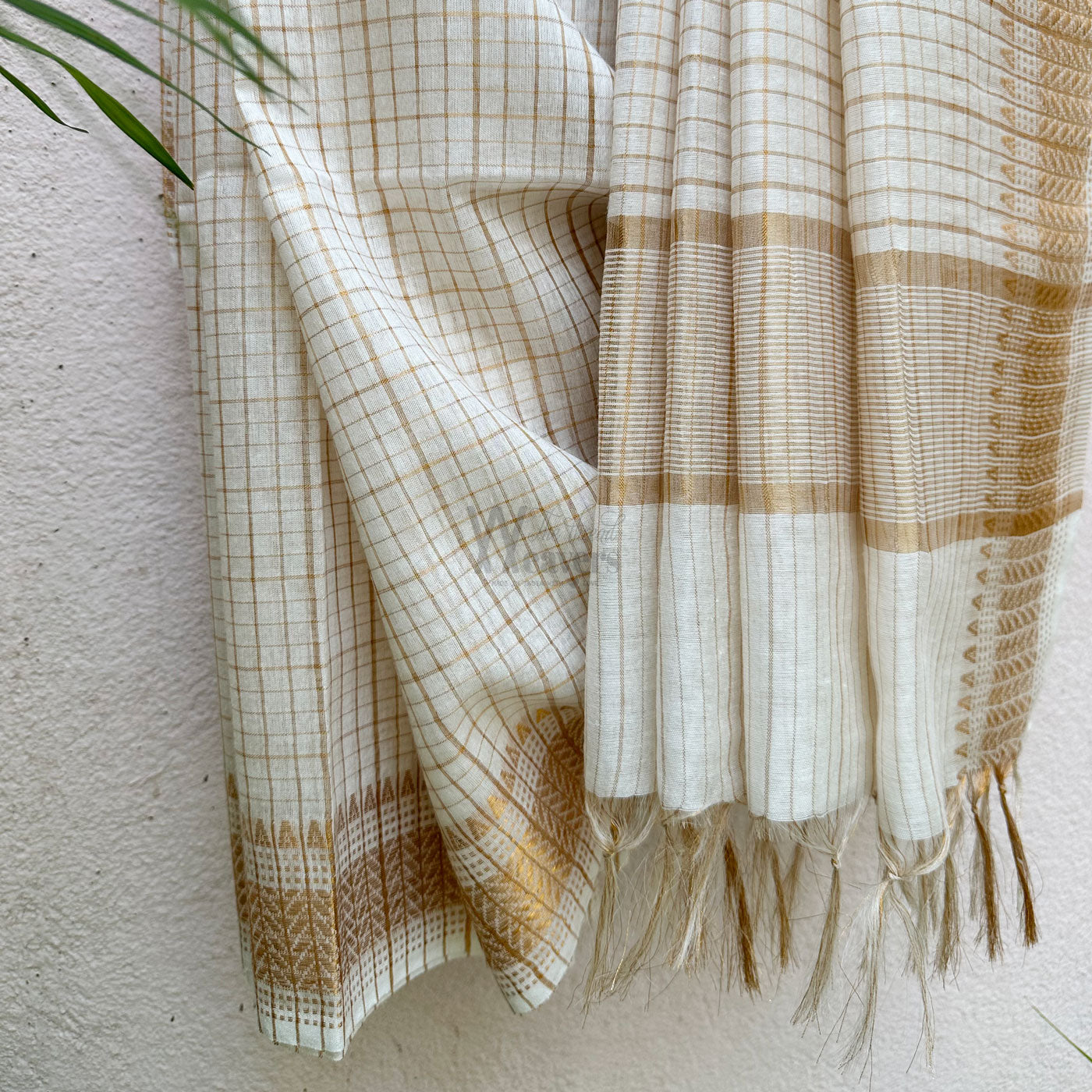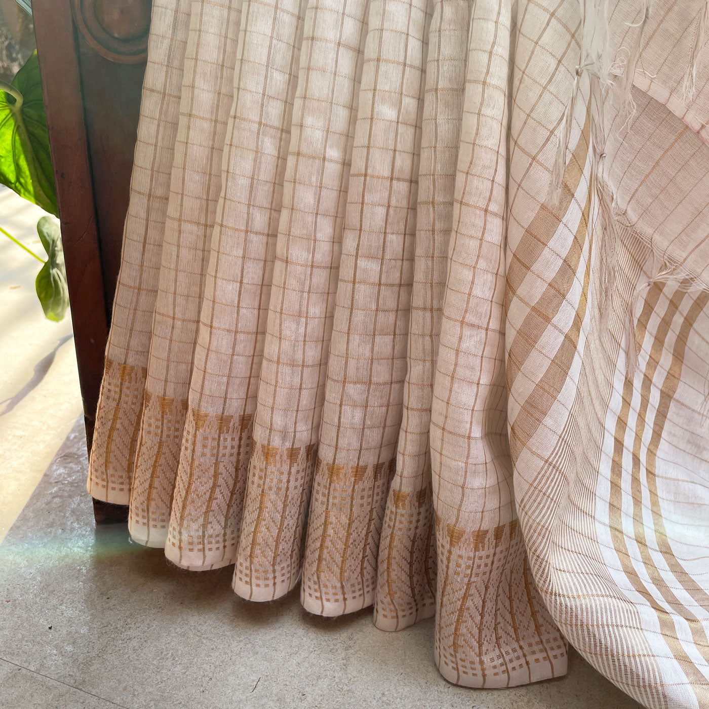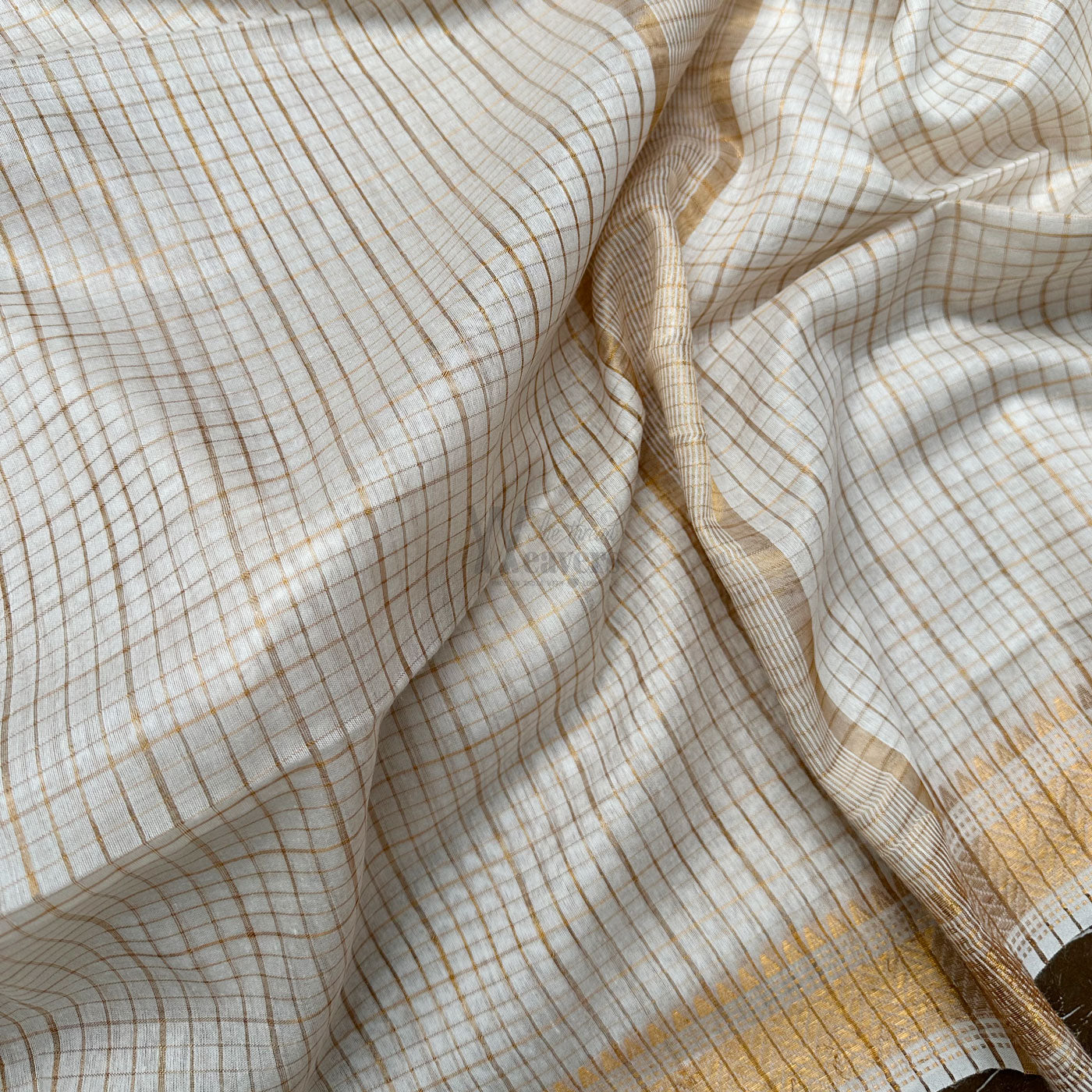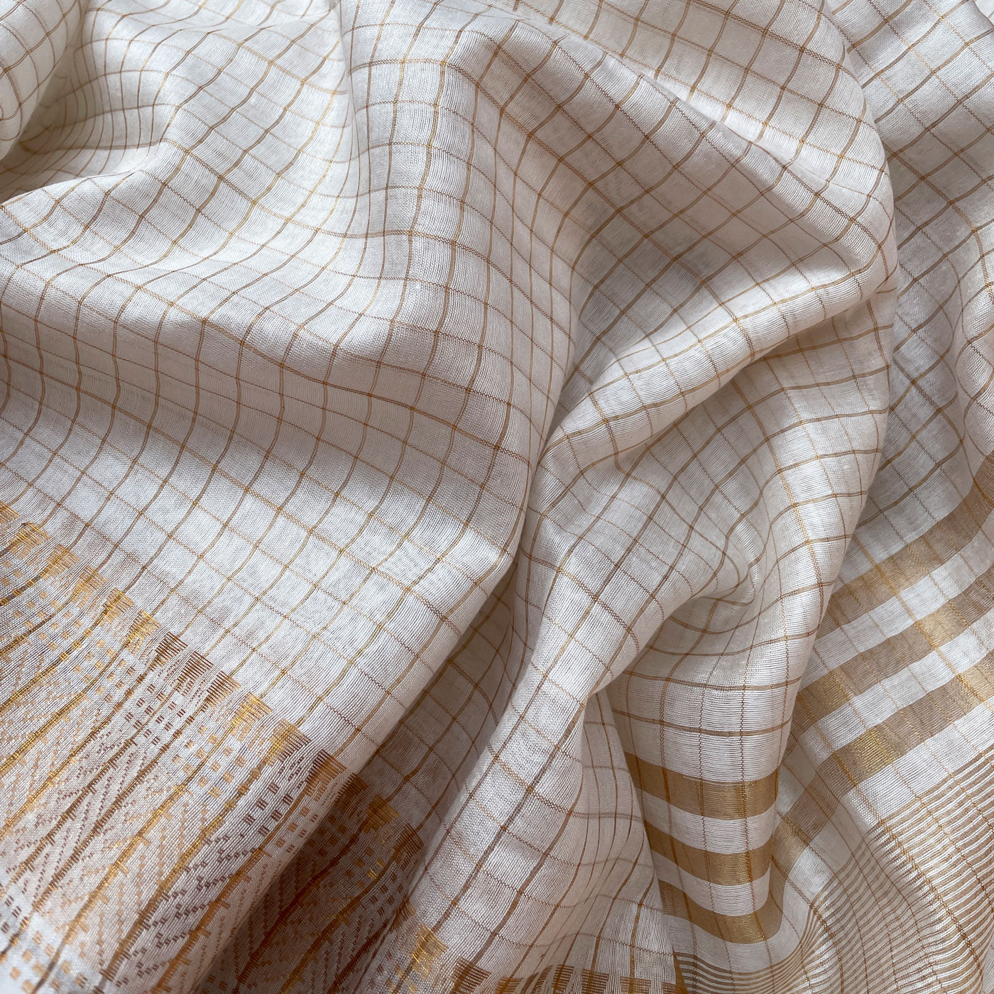 Set on a pearl white base, this saree's border is inspired by the veins of the leaves, this one is an out of the box design. The check pattern on the body and tasseled pallu features zari stripes to complete the look. This dreamy looking saree will definitely make you stand out in the crowd. Don't miss out on the extra green banarasi brocade blouse piece, featuring intricate floral designs in multiple colors. Upgrade your wardrobe today with this luxurious saree.