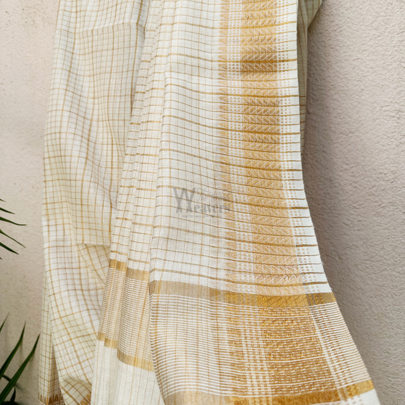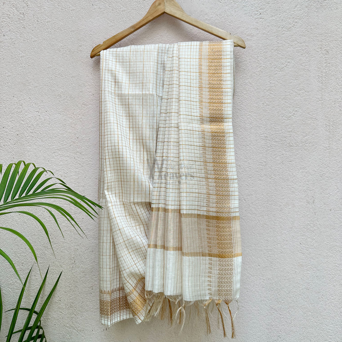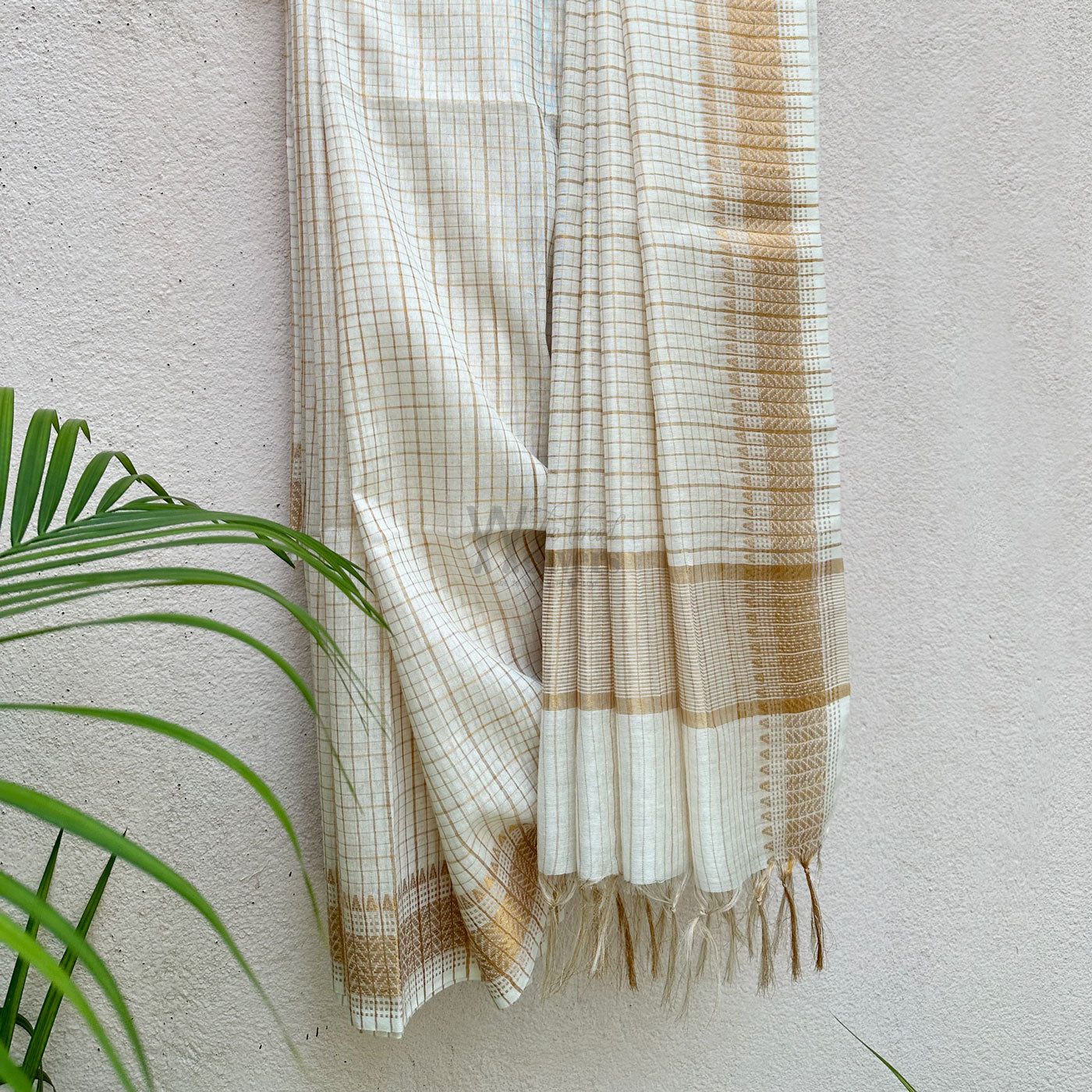 Set on a pearl white base, this saree's border is inspired by the veins of the leaves, this one is an out of the box design. The check pattern on the body and tasseled pallu features zari stripes to complete the look. This dreamy looking saree will definitely make you stand out in the crowd. Don't miss out on the extra green banarasi brocade blouse piece, featuring intricate floral designs in multiple colors. Upgrade your wardrobe today with this luxurious saree.