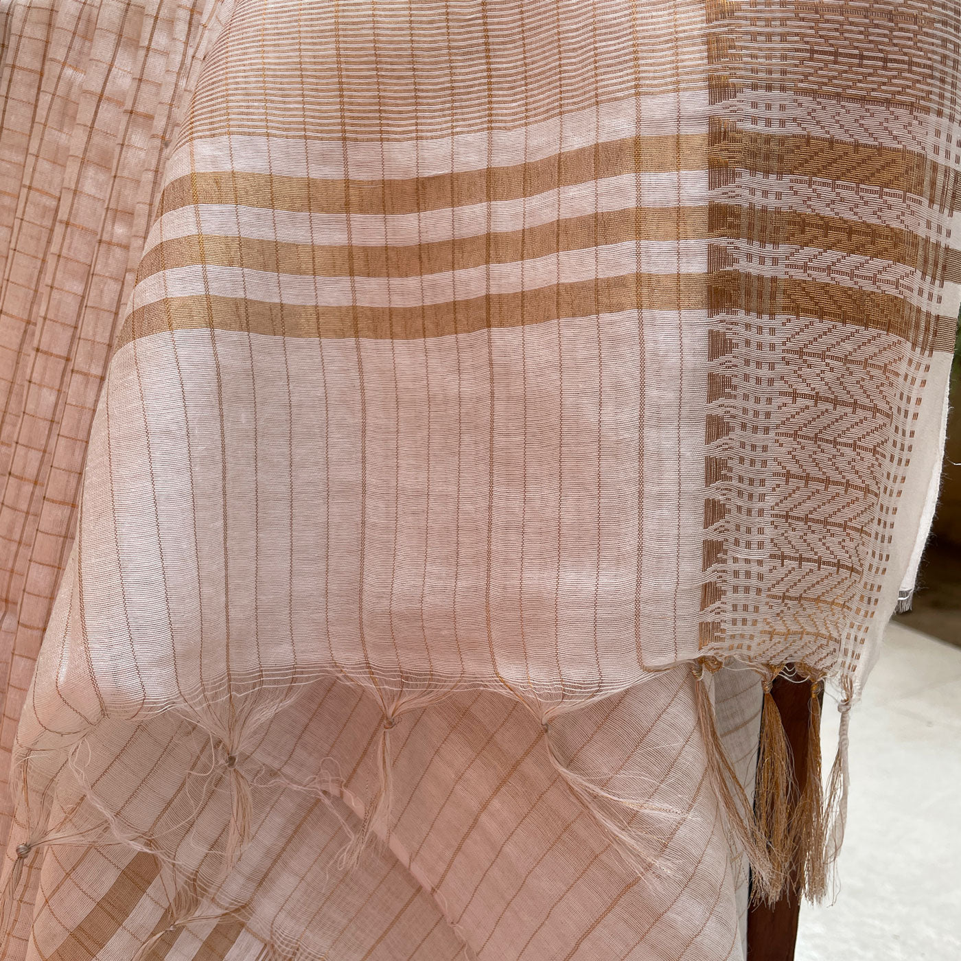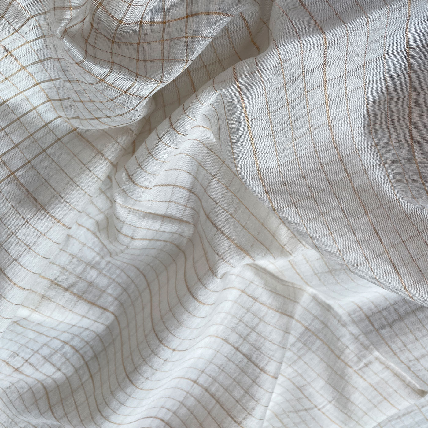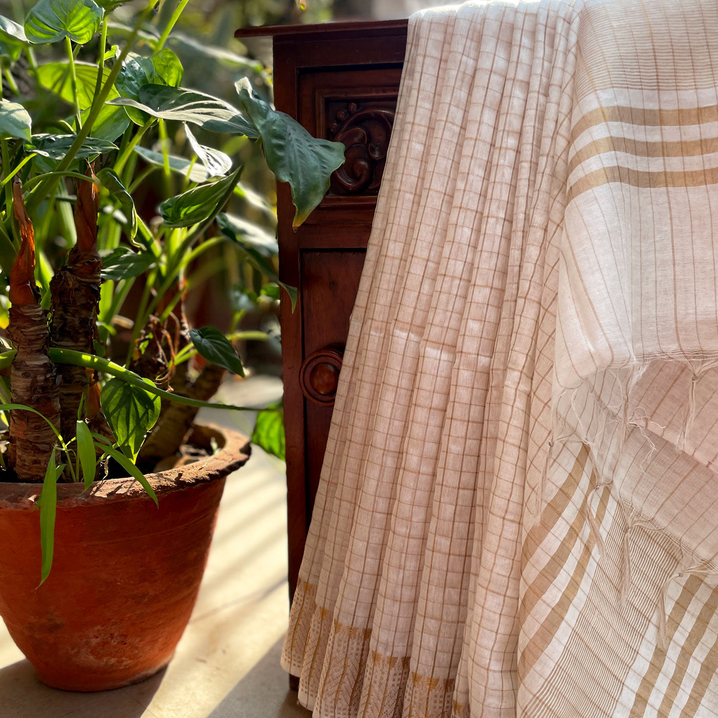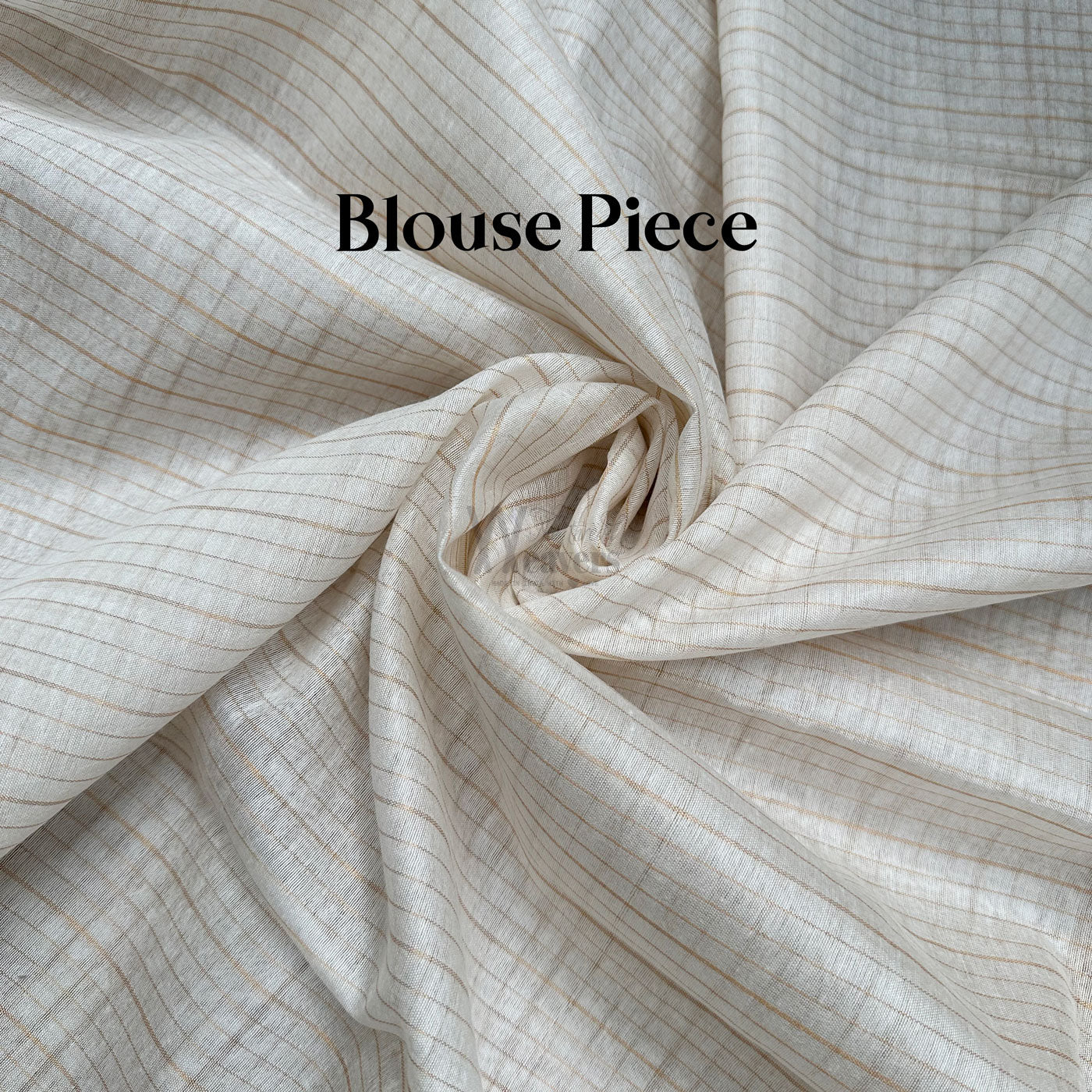 Set on a pearl white base, this saree's border is inspired by the veins of the leaves, this one is an out of the box design. The check pattern on the body and tasseled pallu features zari stripes to complete the look. This dreamy looking saree will definitely make you stand out in the crowd. Don't miss out on the extra green banarasi brocade blouse piece, featuring intricate floral designs in multiple colors. Upgrade your wardrobe today with this luxurious saree.