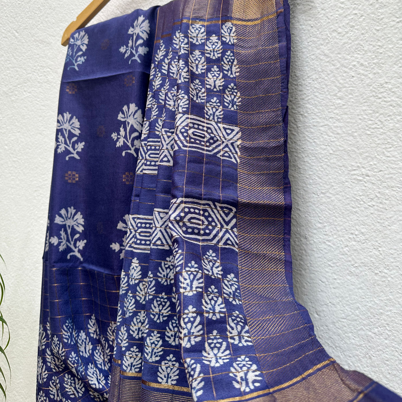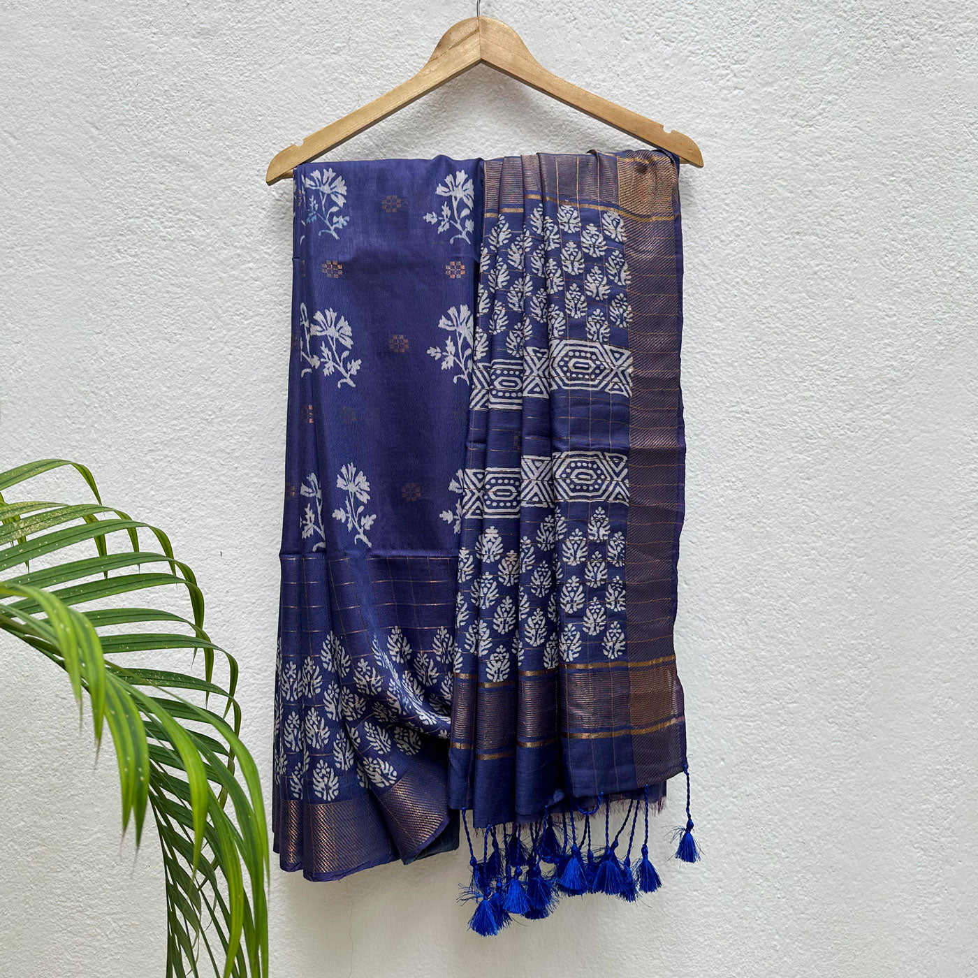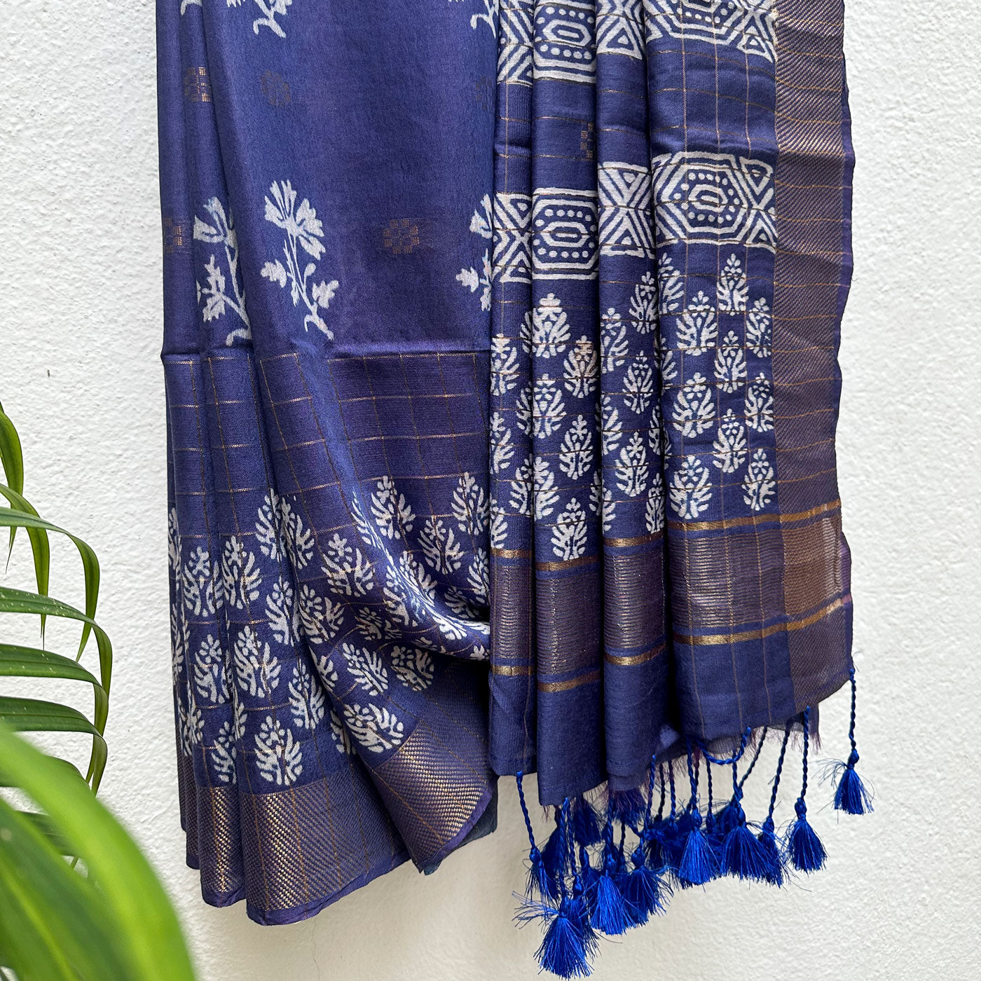 Embrace bold elegance with this cotton-silk saree, boasting a striking traditional gold stripe border and pallu that command attention. Playful tassels on the pallu add a daring twist, while the handblock motifs, gold butas, and checks pattern across the fabric radiate timeless sophistication. Designed to empower your presence and leave an unforgettable mark, this saree is your perfect choice for making a statement at any celebration.