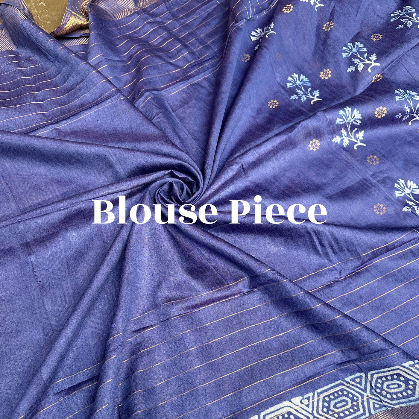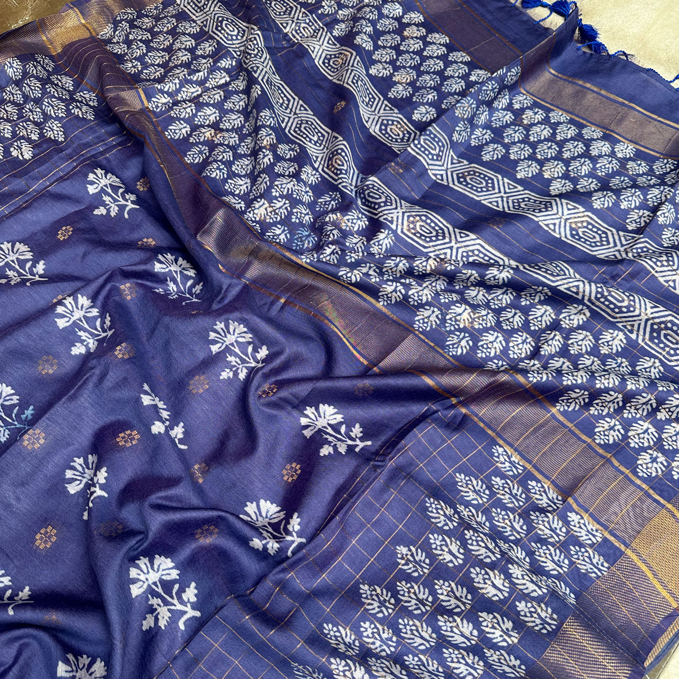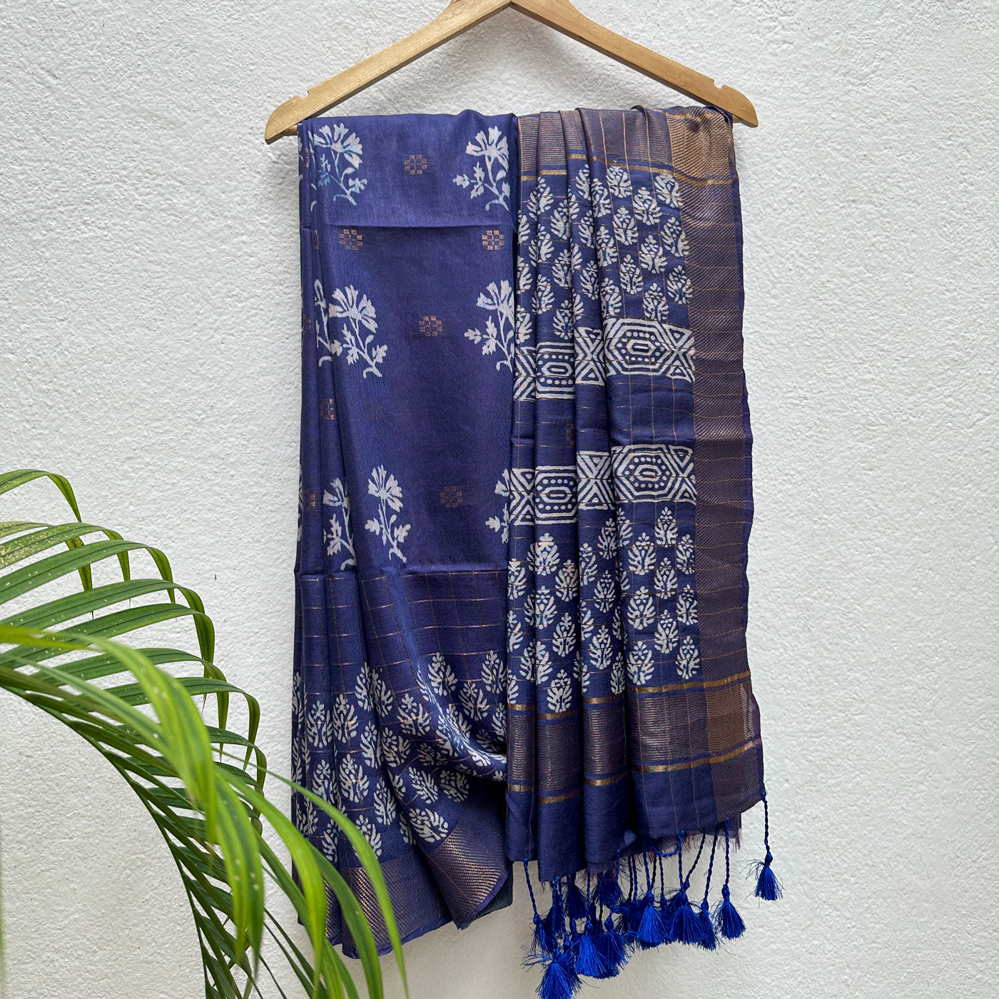 Embrace bold elegance with this cotton-silk saree, boasting a striking traditional gold stripe border and pallu that command attention. Playful tassels on the pallu add a daring twist, while the handblock motifs, gold butas, and checks pattern across the fabric radiate timeless sophistication. Designed to empower your presence and leave an unforgettable mark, this saree is your perfect choice for making a statement at any celebration.