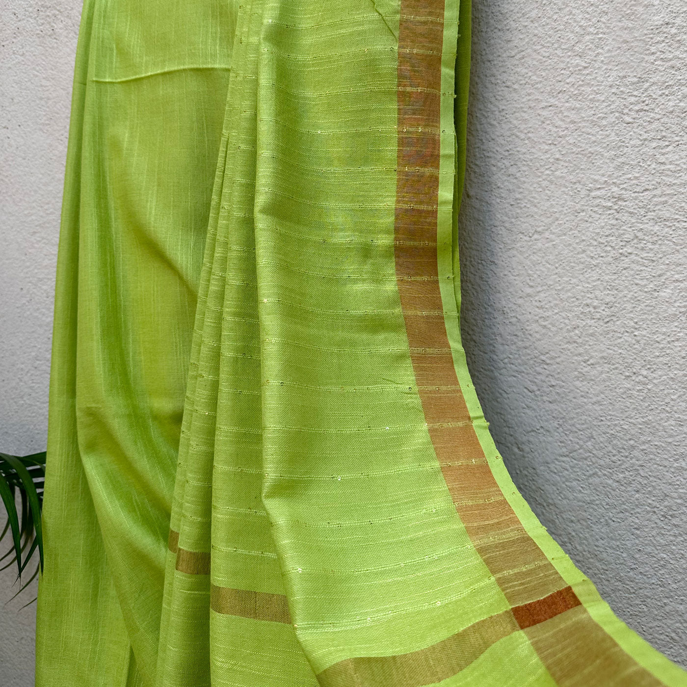 Indulge in fashion with this chic cotton saree, complete with a sparkling copper zari border that's sure to turn heads. It comes with two blouses - one classic and one unique - for endless styling options. And don't miss the sequins on the pallu along with matching tassels, making it a must-have for your wardrobe. Made with soft and breathable cotton, it's a must-have for any fashion-forward person looking to make a stylish statement.