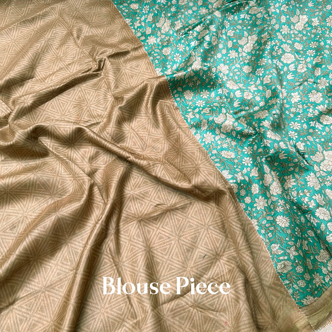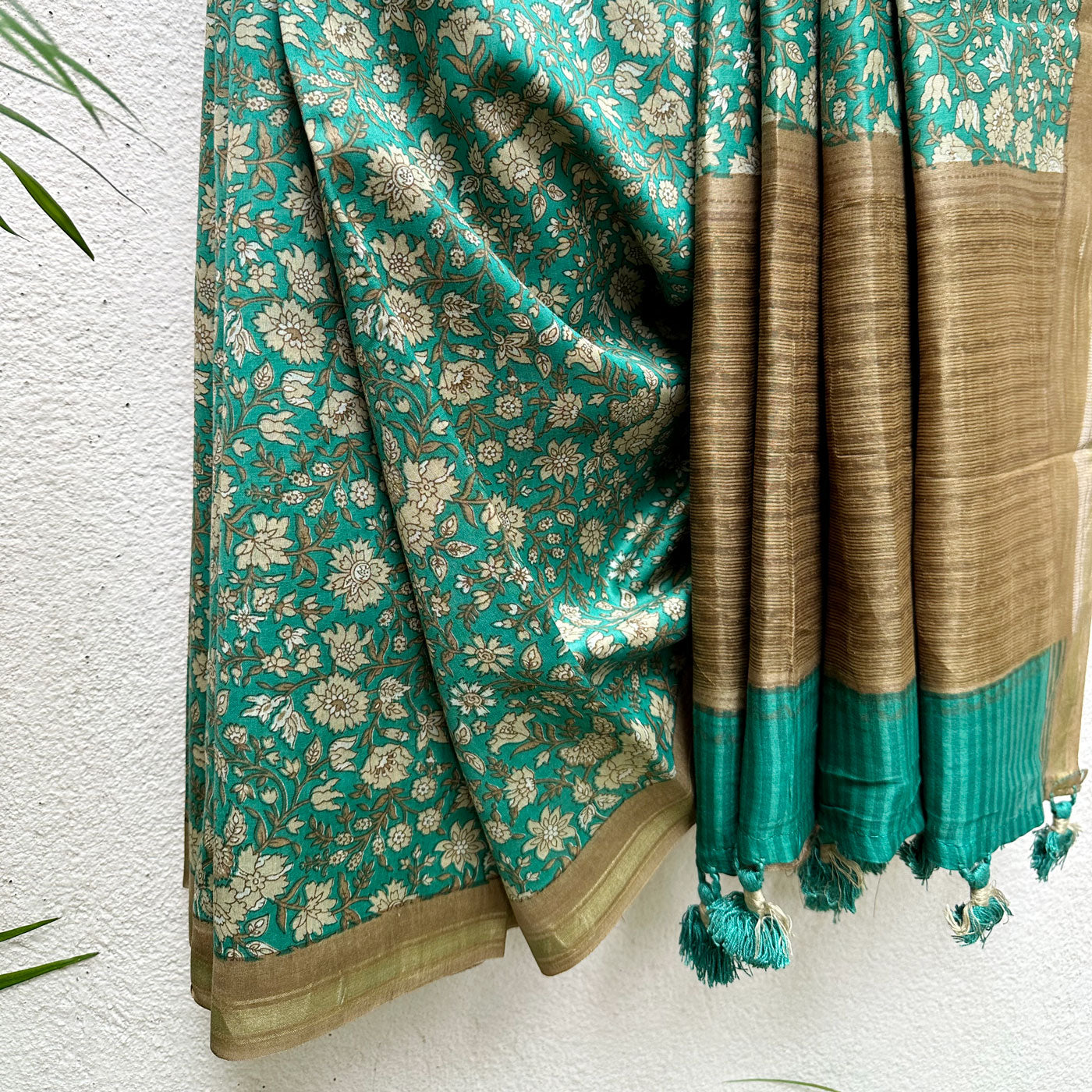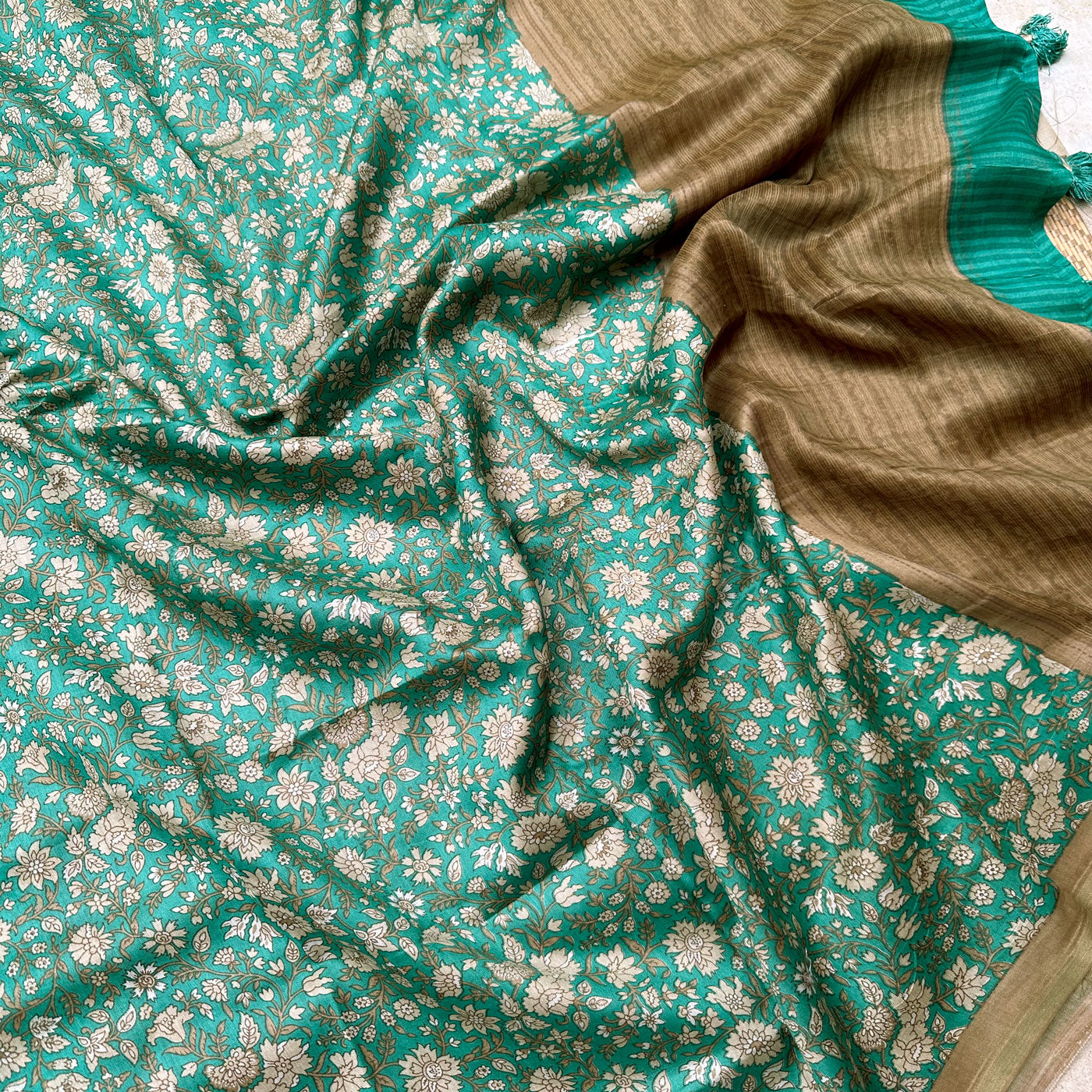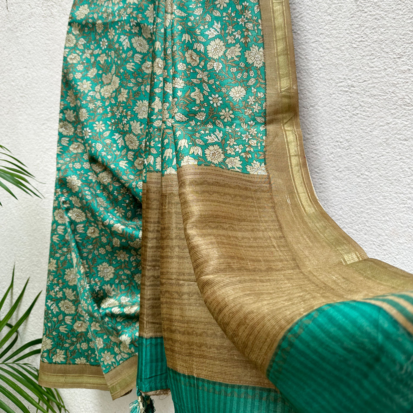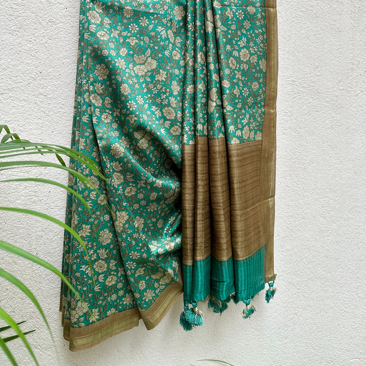 Take a walk on the wild side with this teal green saree adorned with liberty-inspired prints and traditional patterns. The striped pallu and matching tassels add a charming touch, making it perfect for any festive occasion. Get ready to turn heads and make a statement with this stunning saree! With its expert craftsmanship and undeniable charm, it's a must-have for bold fashionistas. Complete the look with traditional jewelry for a dazzling and daring ensemble!