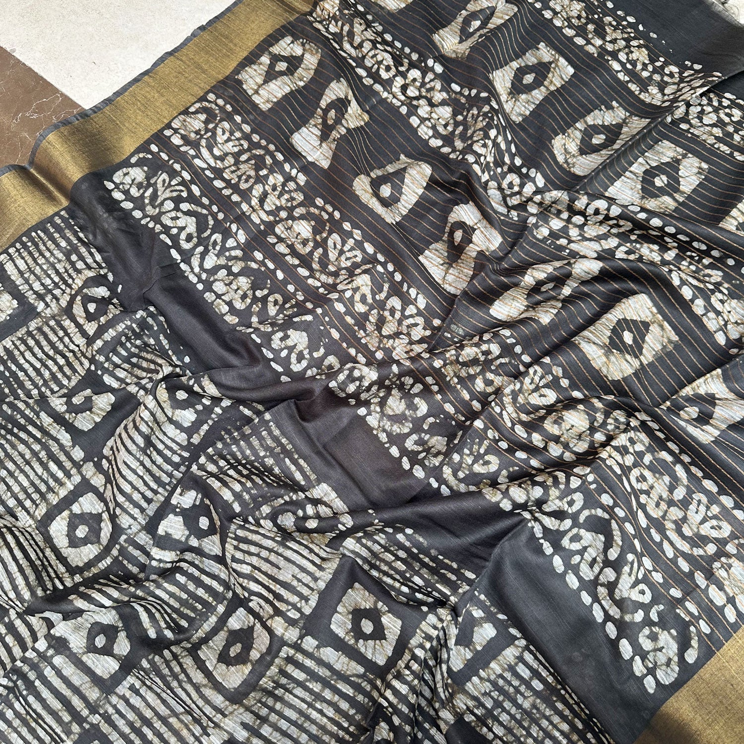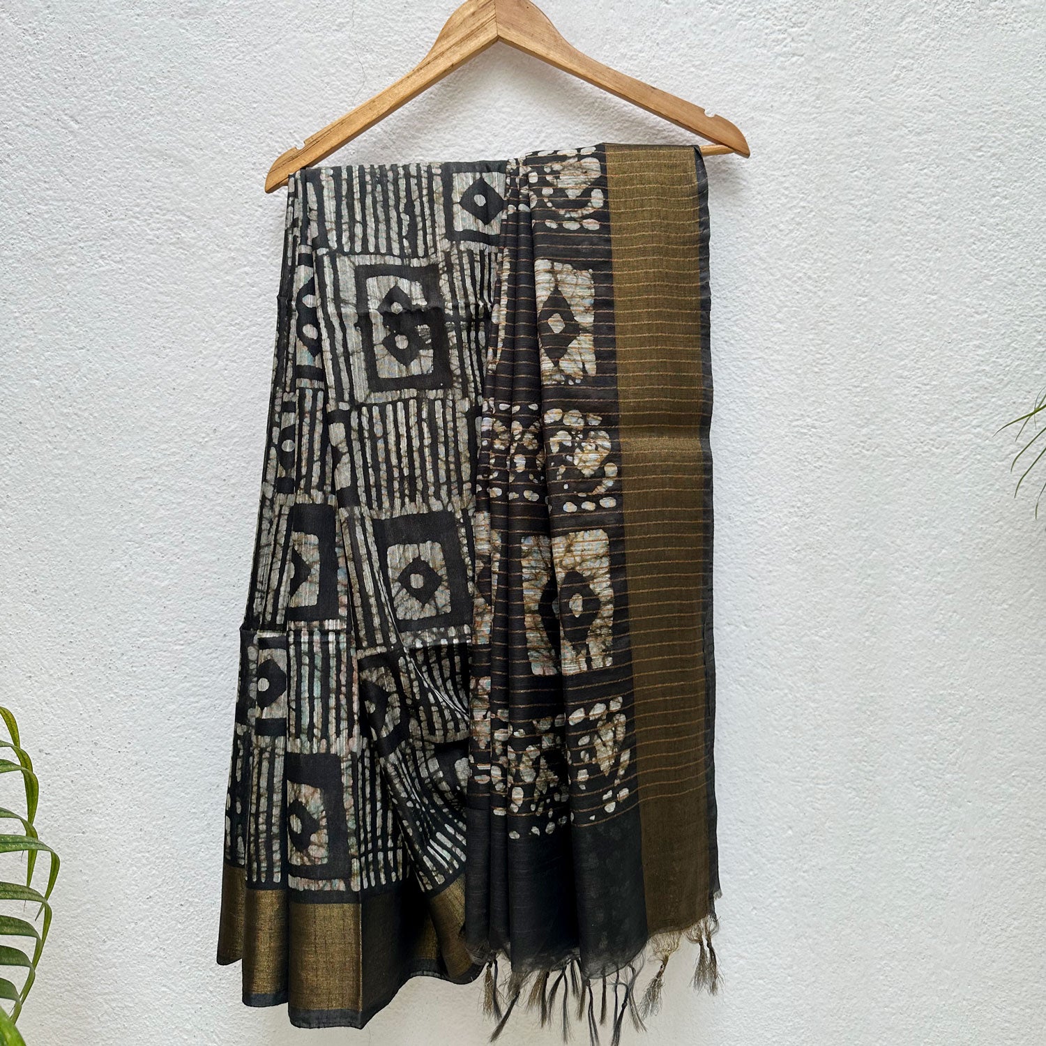 Dive into bold elegance with this striking Insignia Blue Batik Cotton Silk Saree. Draped in a commanding charcoal blue hue, it commands attention with its audacious gold zari border showcasing geometric precision. Crafted from premium materials, each piece showcases intricate hand-block artistry that refuses to blend in. This is a saree for those who dare to make a statement—expect admiring glances and conversations wherever you wear it.