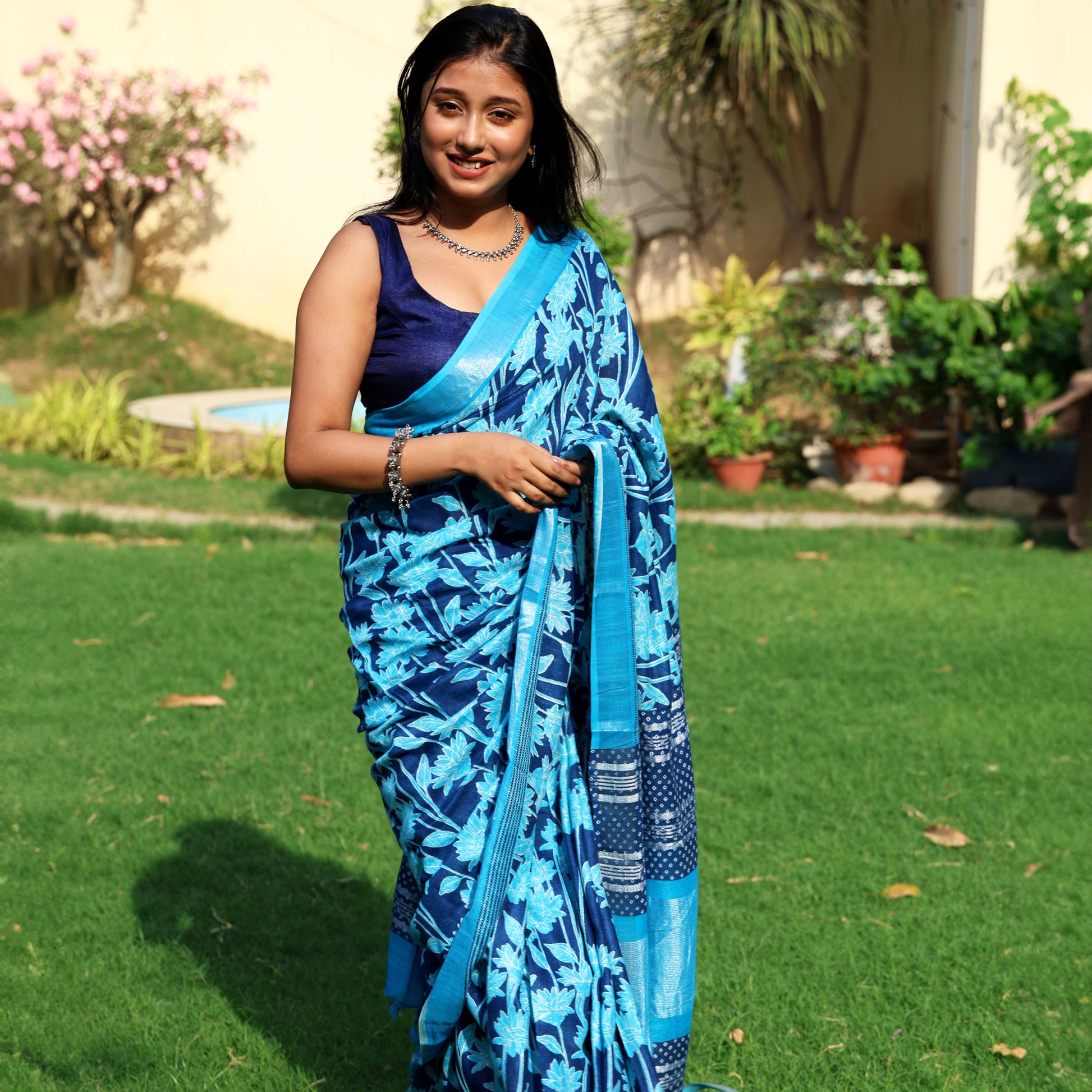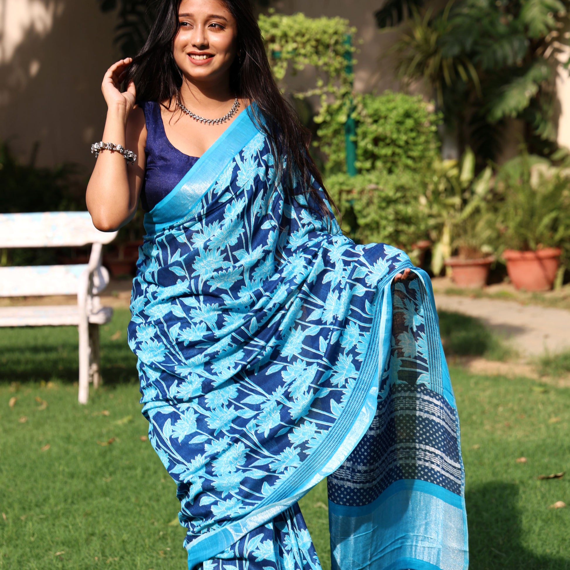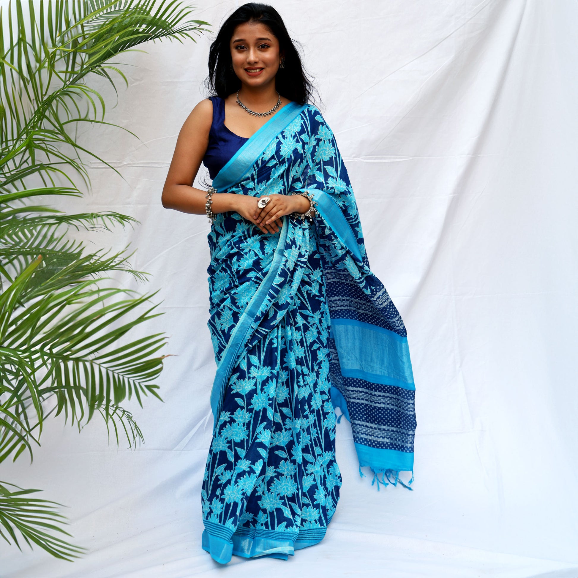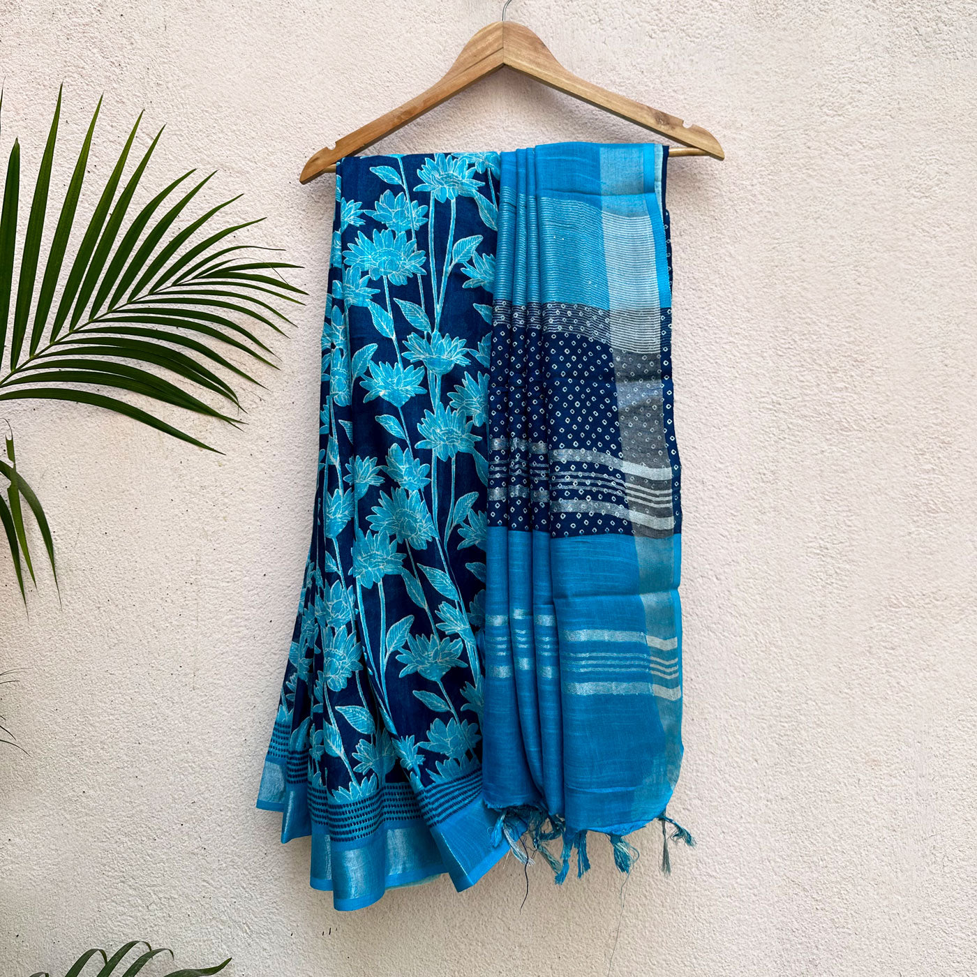 Upgrade your clothing collection with our Ivanetti Dahlia Printed Organic Linen Saree, showcasing a blend of vivid blues! This sustainable saree showcases a stylish Dahlia design on the fabric and a striped hem. A classy pallu with polka dots adds a touch of refinement. Suitable for all generations, this saree will grab attention with its alluring colors!