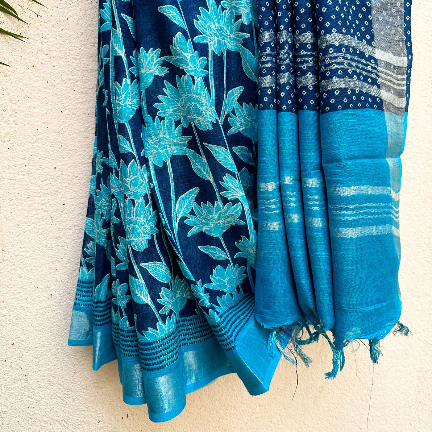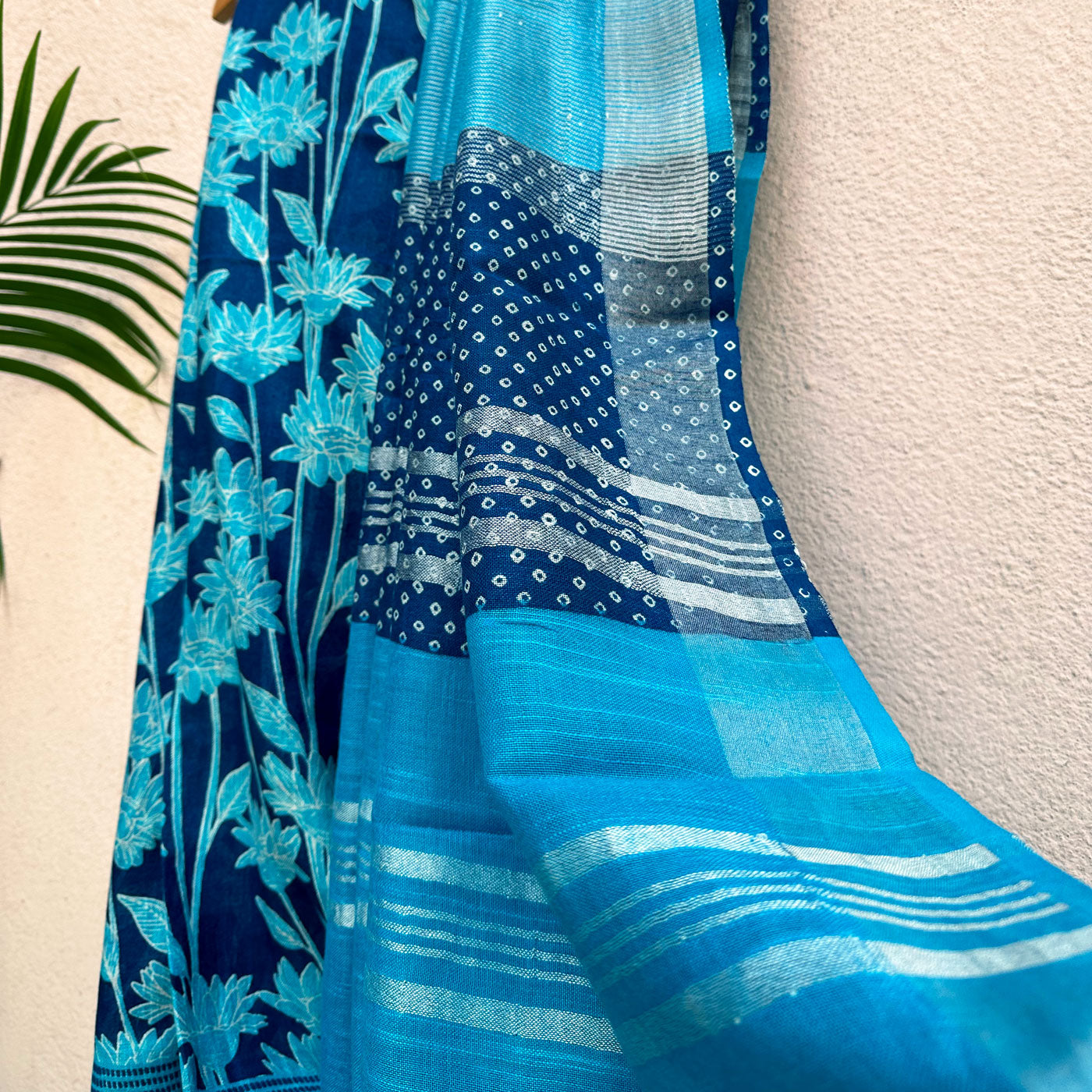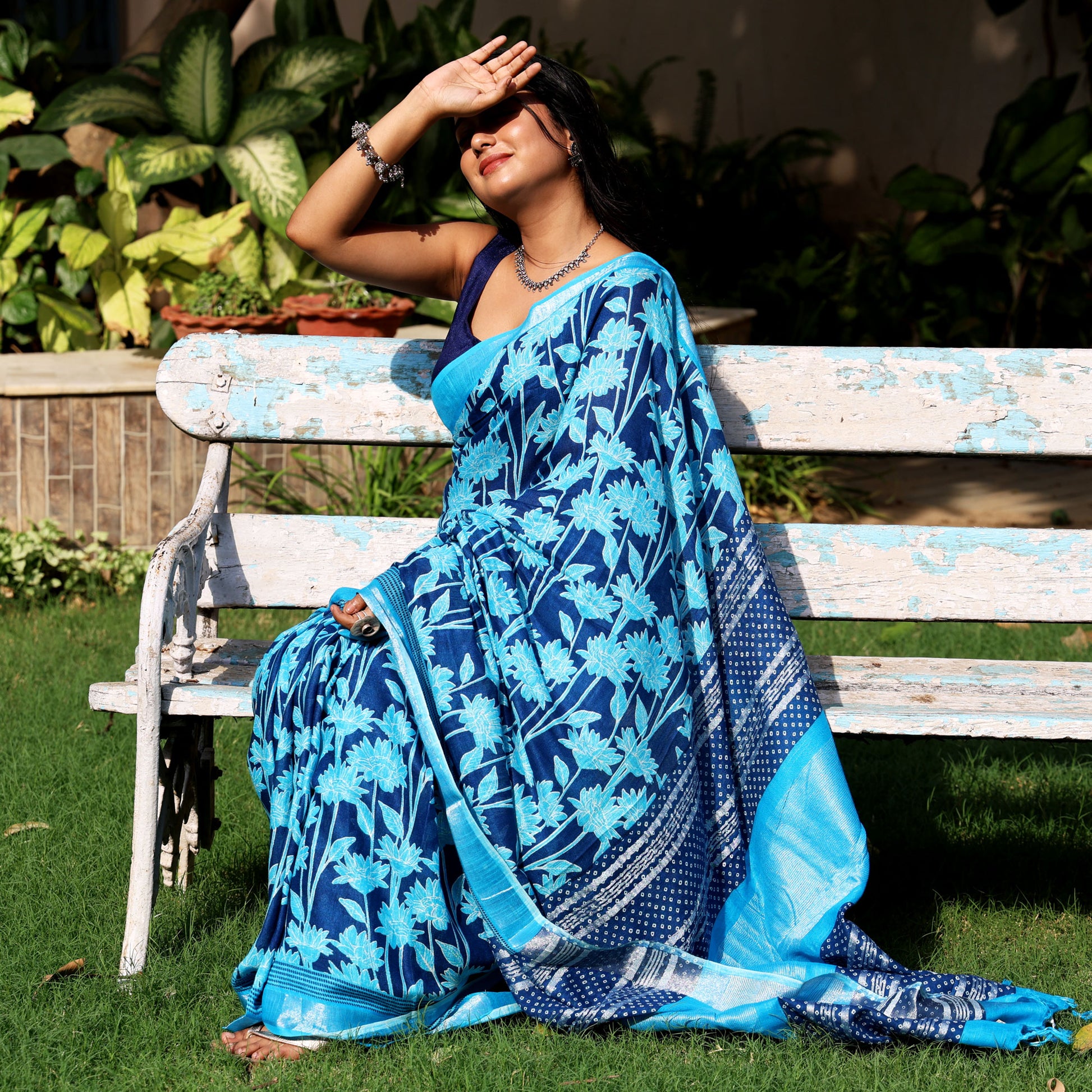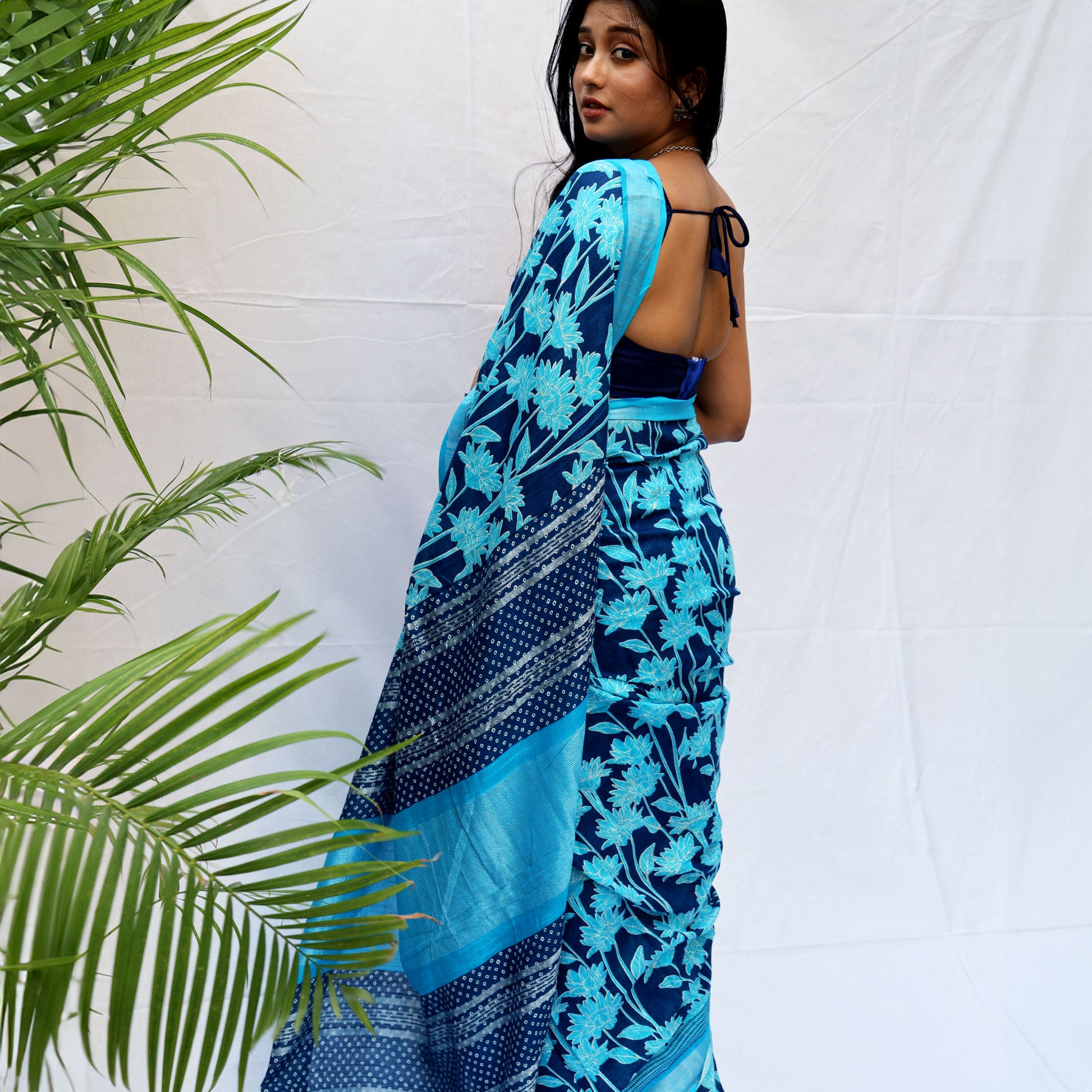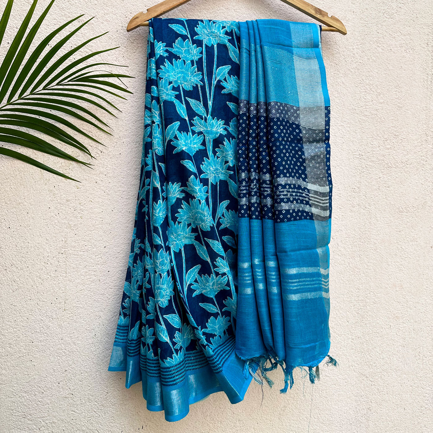 Upgrade your clothing collection with our Ivanetti Dahlia Printed Organic Linen Saree, showcasing a blend of vivid blues! This sustainable saree showcases a stylish Dahlia design on the fabric and a striped hem. A classy pallu with polka dots adds a touch of refinement. Suitable for all generations, this saree will grab attention with its alluring colors!