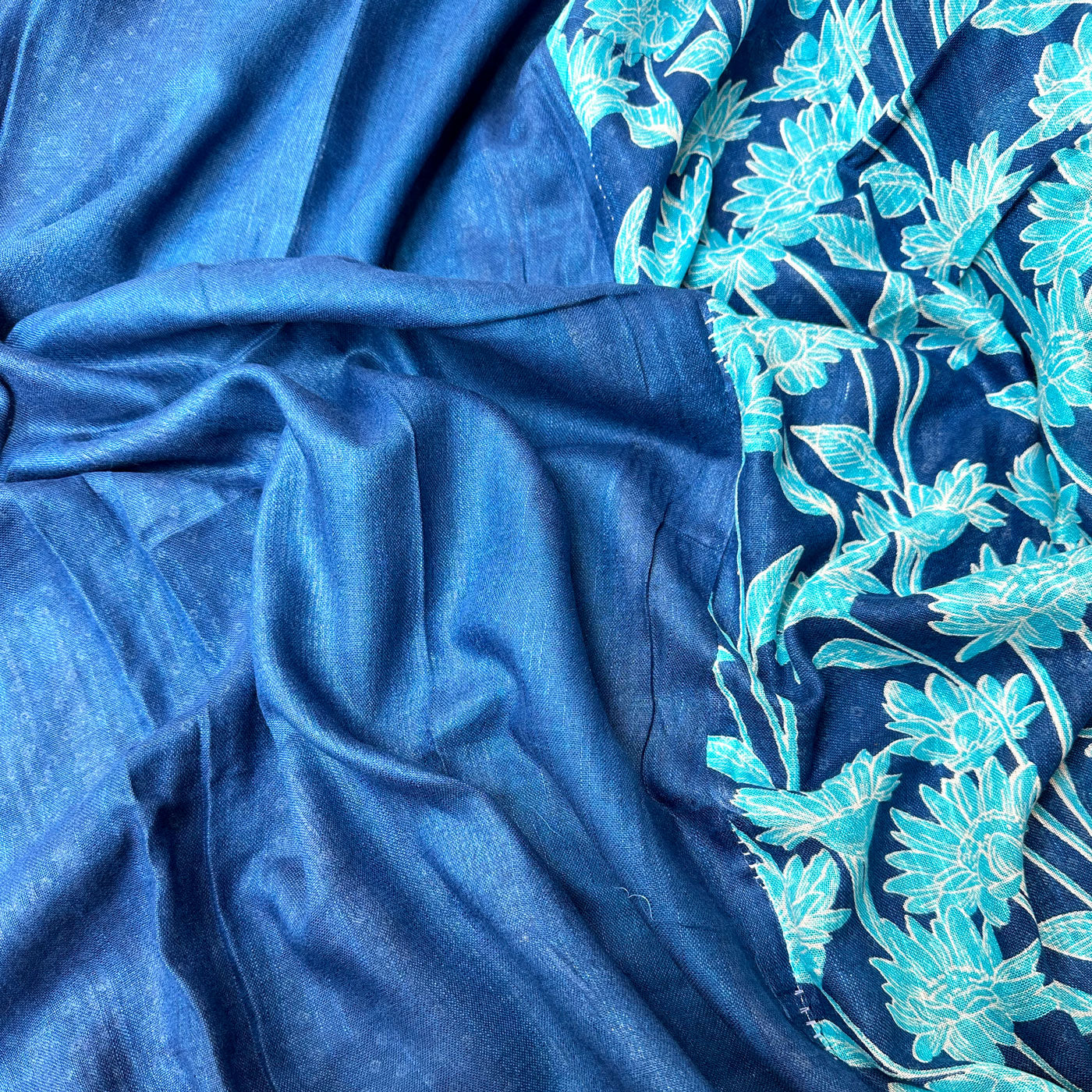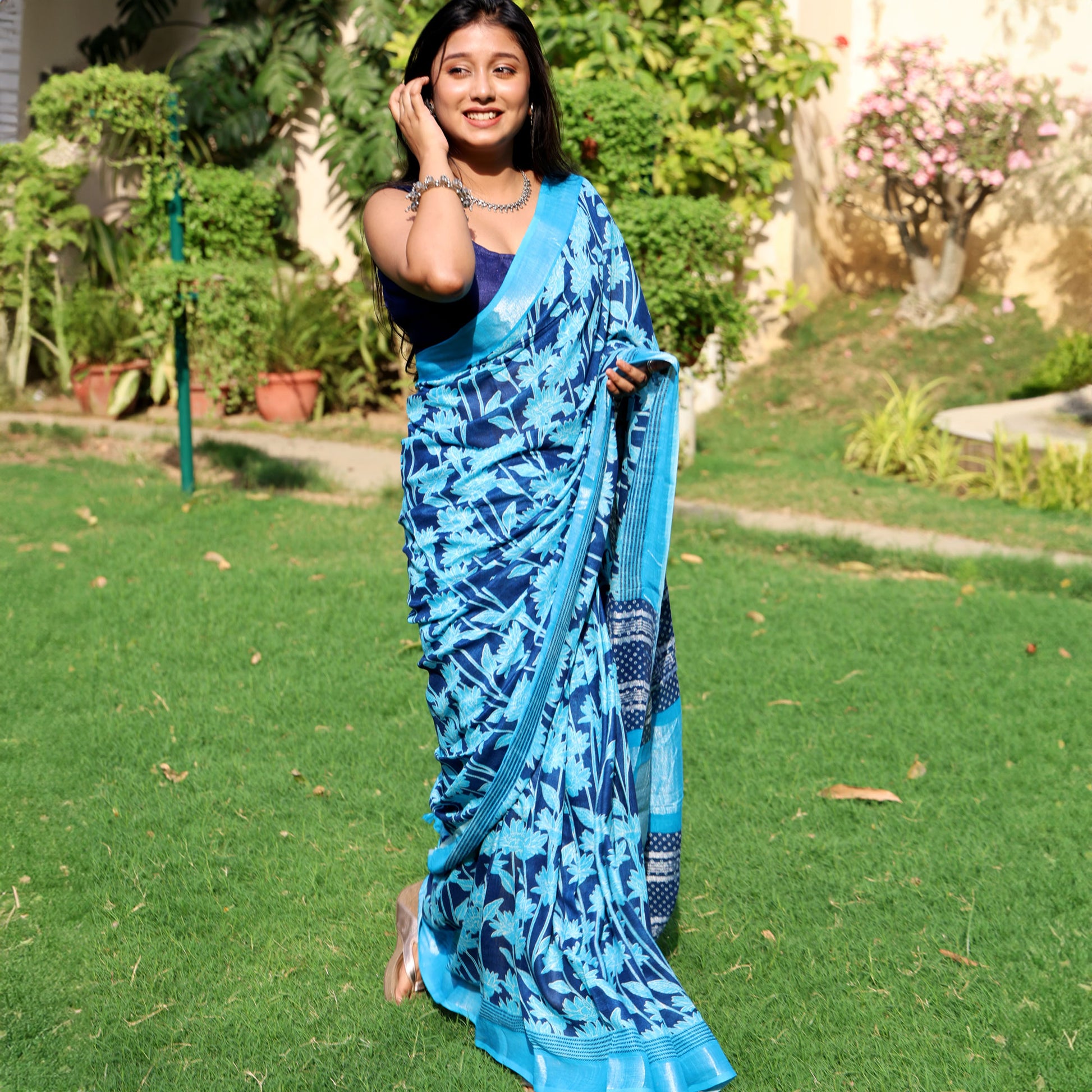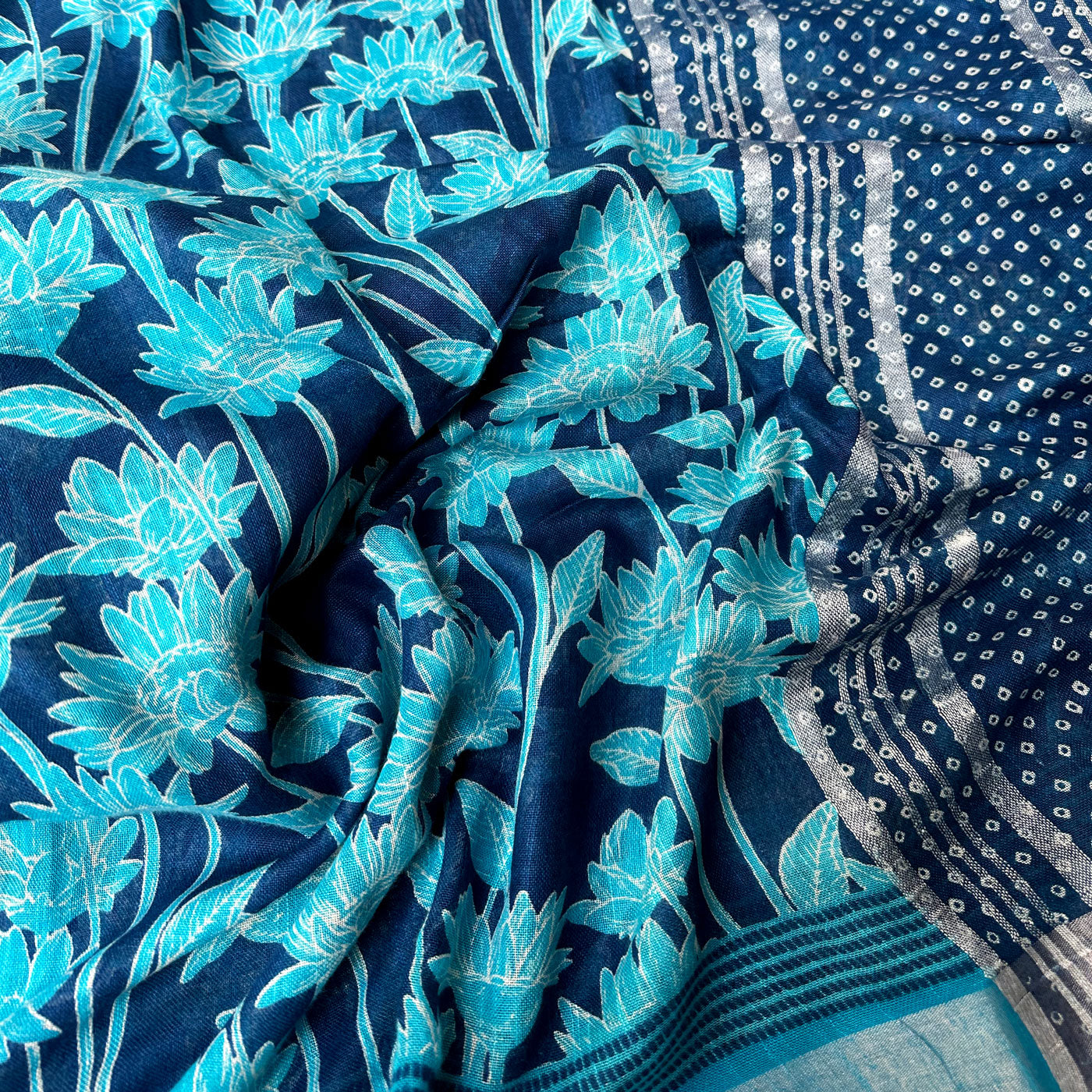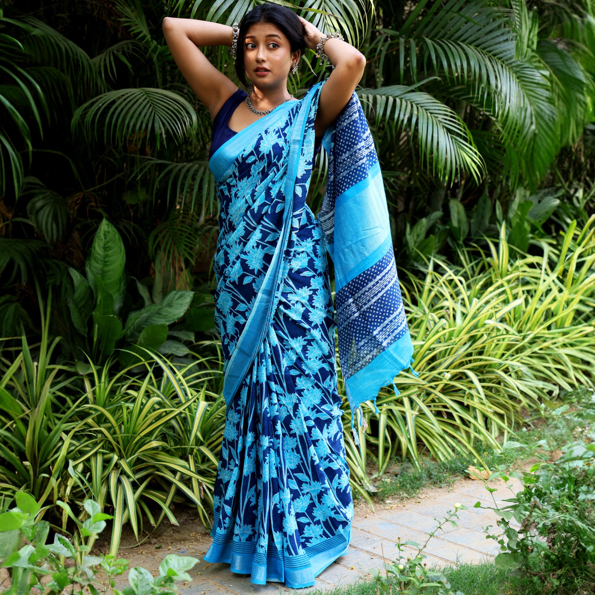 Upgrade your clothing collection with our Ivanetti Dahlia Printed Organic Linen Saree, showcasing a blend of vivid blues! This sustainable saree showcases a stylish Dahlia design on the fabric and a striped hem. A classy pallu with polka dots adds a touch of refinement. Suitable for all generations, this saree will grab attention with its alluring colors!