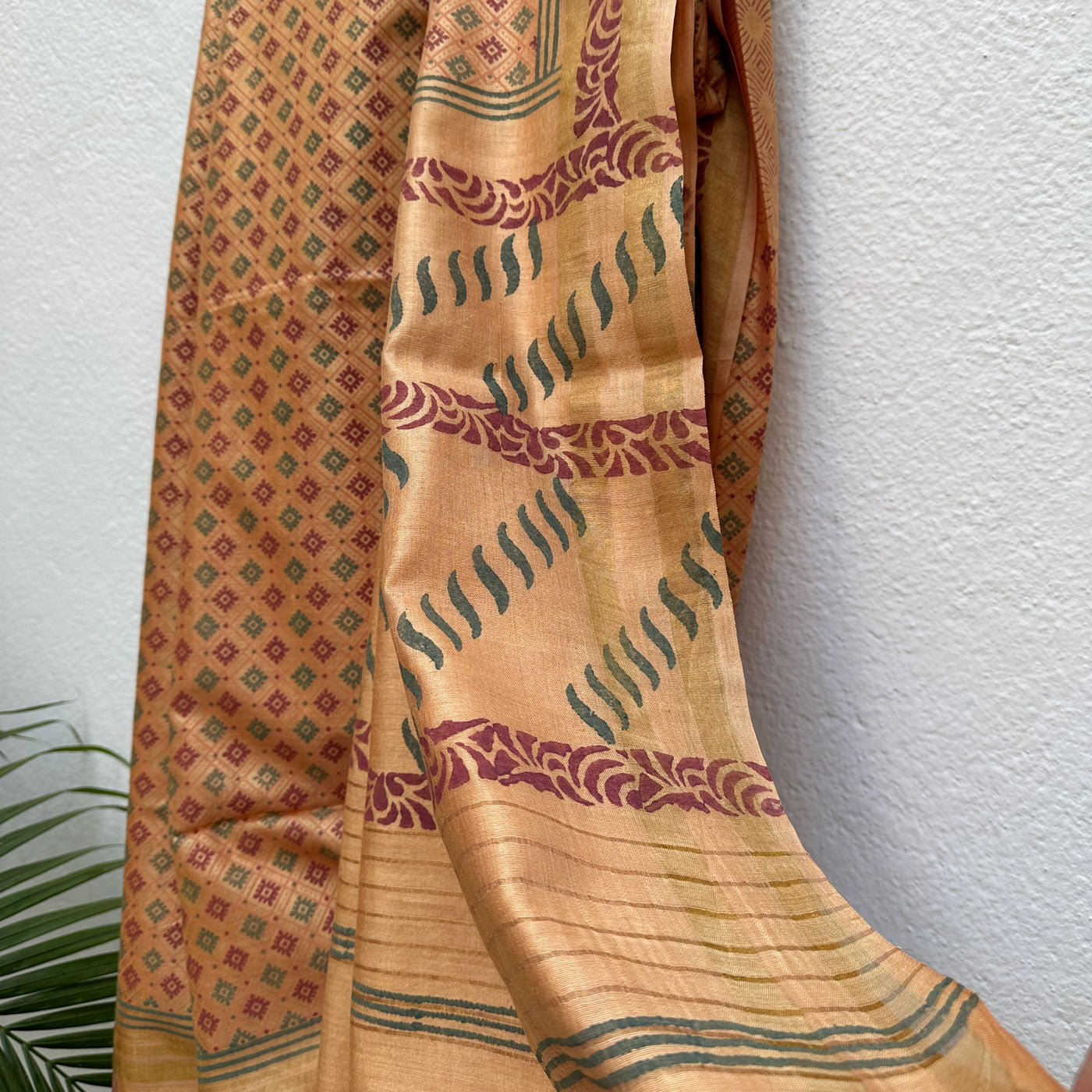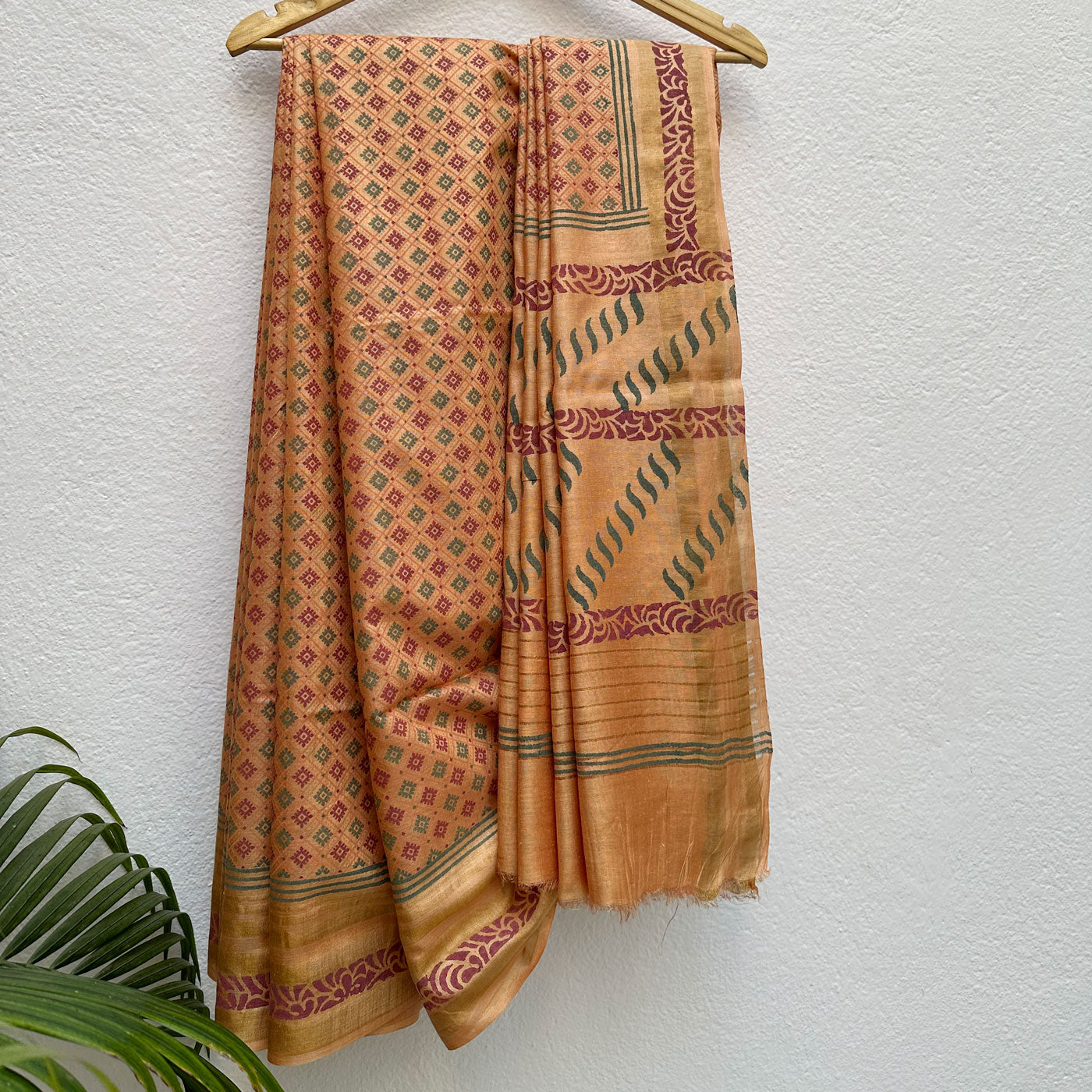 Indulge your unique style and make a statement with the luxurious Handblock Printed Silk Saree. Meticulously crafted with a striped gold border, intricate ornamental motifs, and a delicate geometric buta pattern, this saree exudes elegance and boldness. Perfect for both casual get-togethers and special occasions.