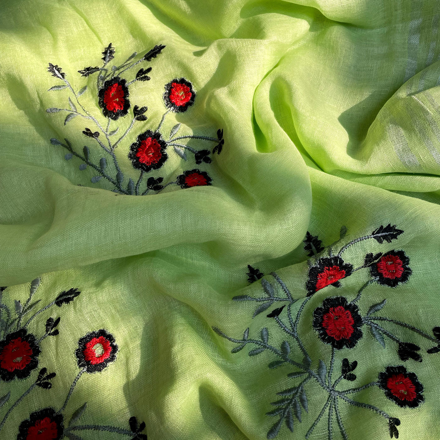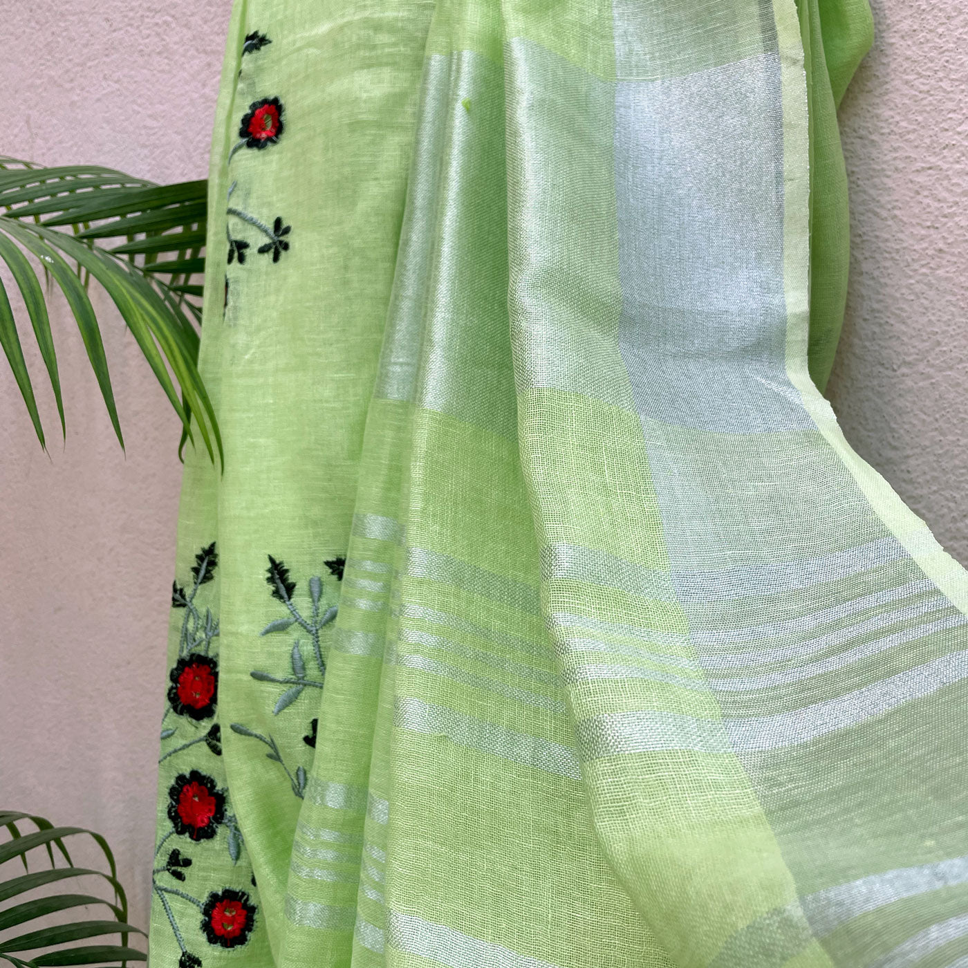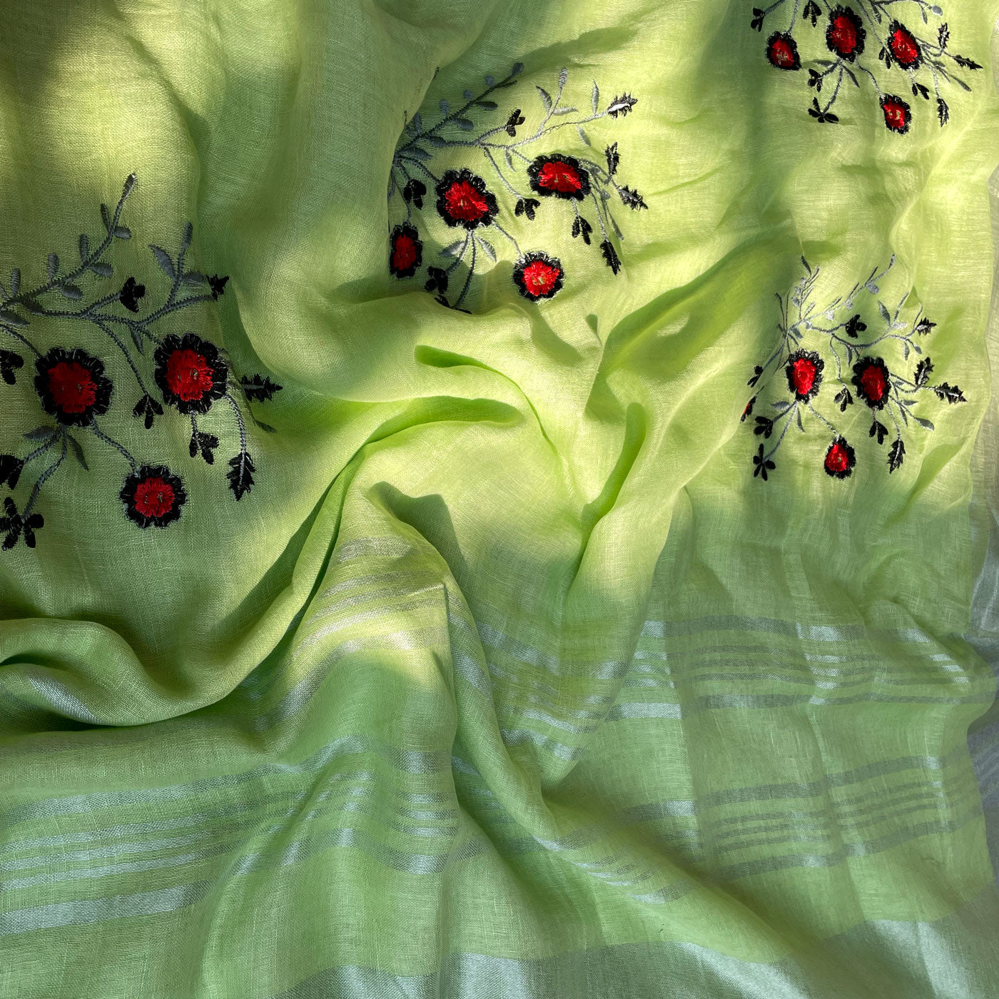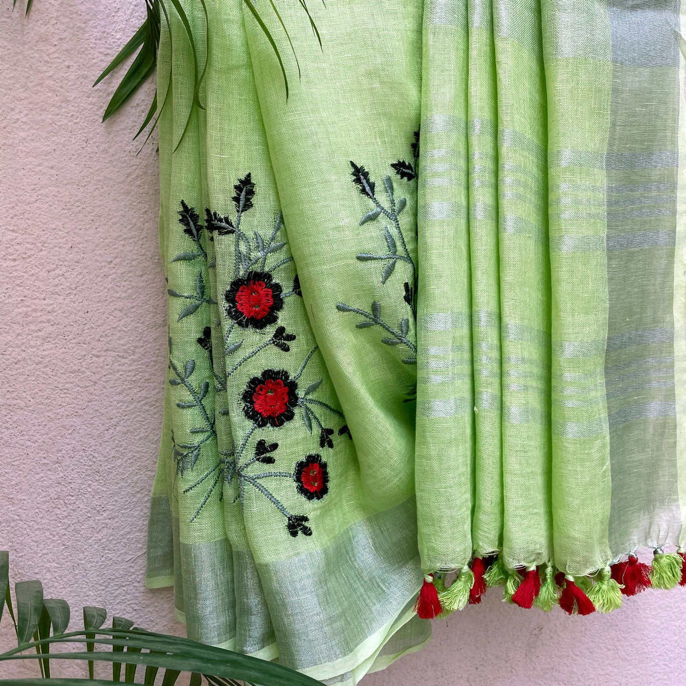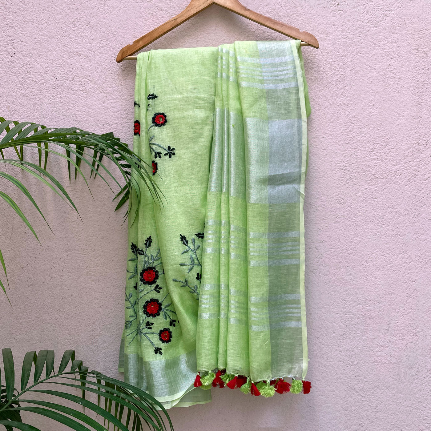 Sometimes its OK if the only thing you did today was breathe. Taking it easy with our pure linen saree with a lovely floral bunch embroidery work and silver zari border. The dual colored pom-poms on the pallu will definitely get you in the spotlight.