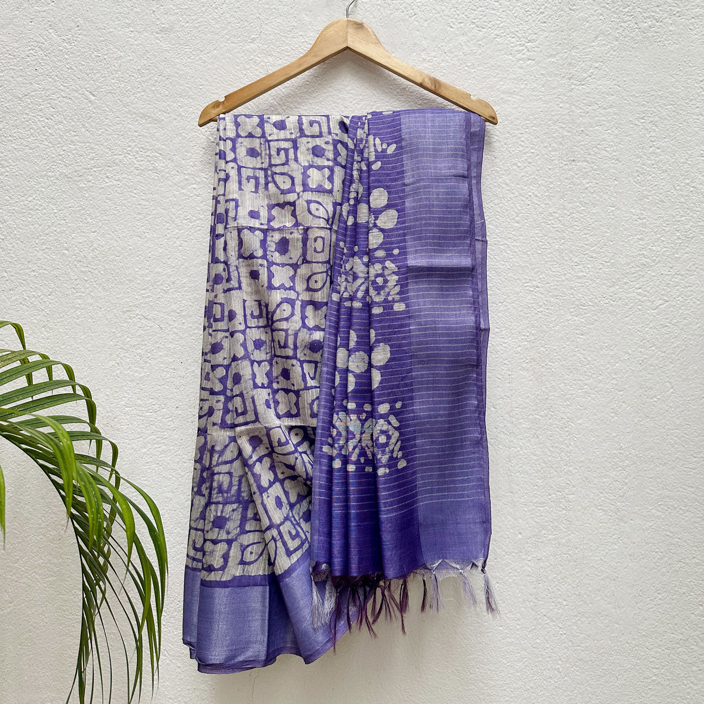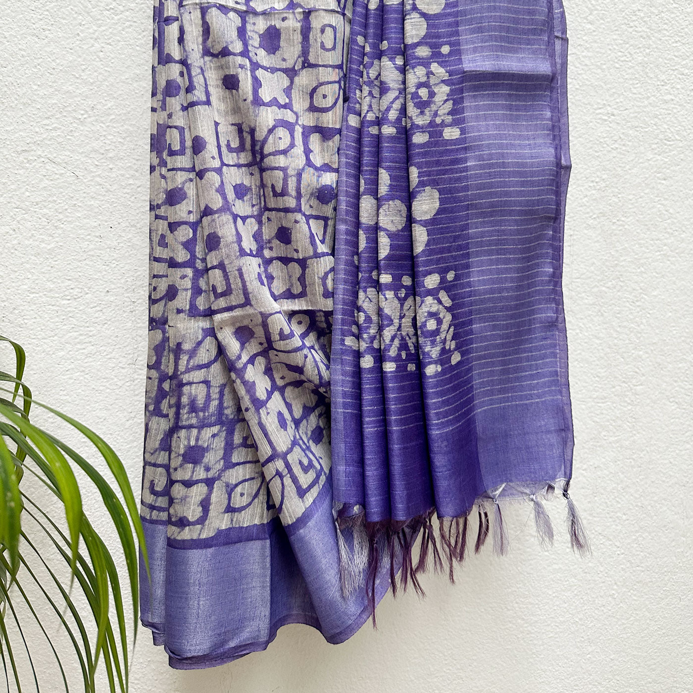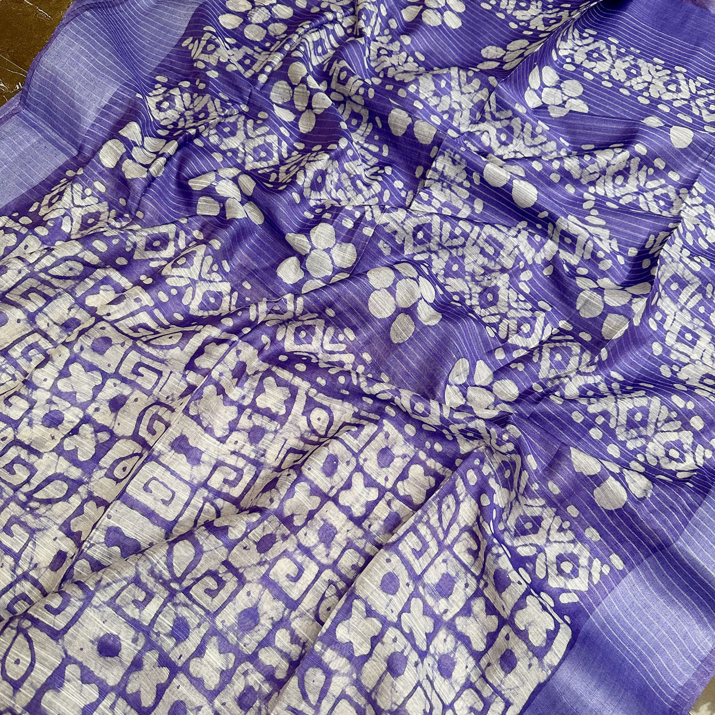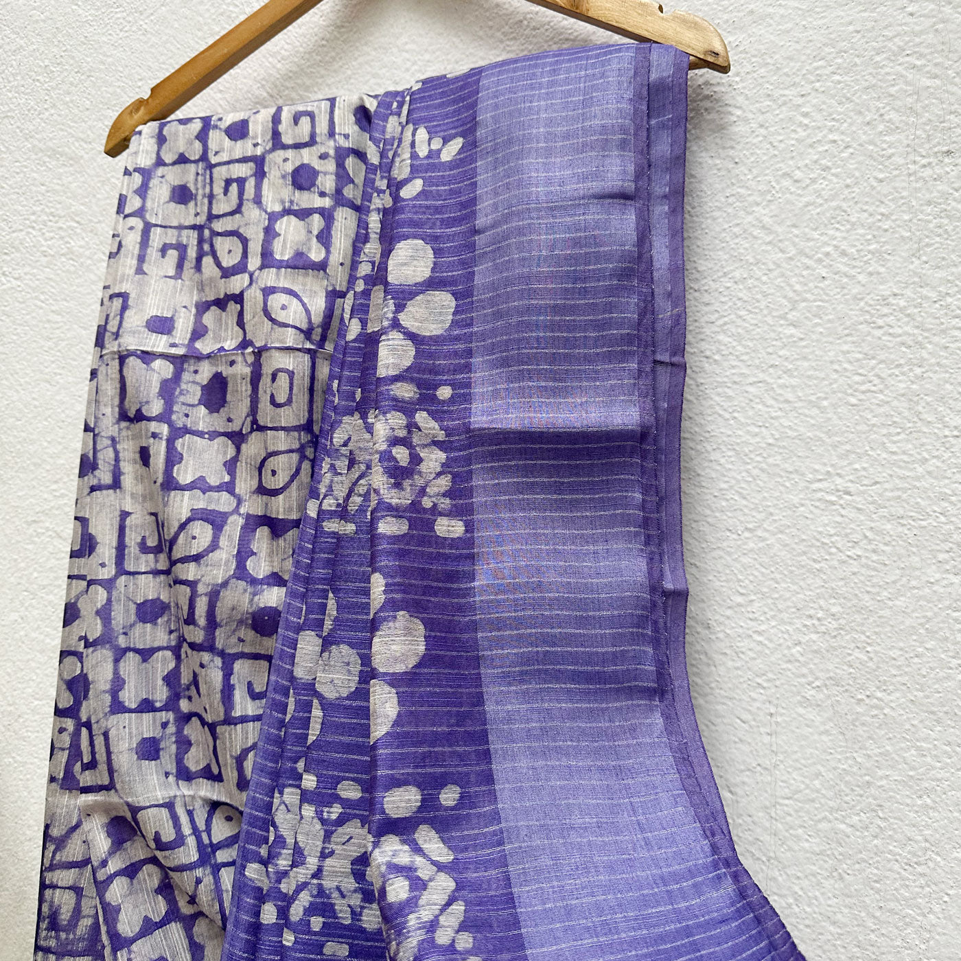 Crafted from purple cotton silk and featuring eye-catching handblock batik square motifs, you'll be a showstopper that stands out from the crowd. This festive saree is perfect for bridesmaids and newlyweds alike, featuring gold accents and no border for a truly timeless look. Swish, swank, and slay your way into the evening!