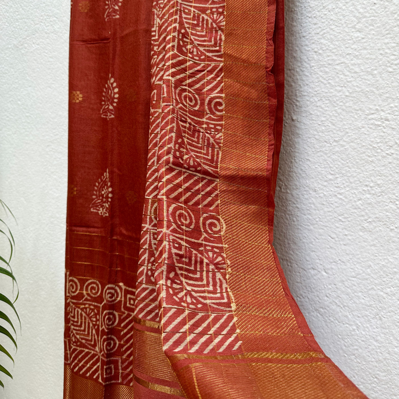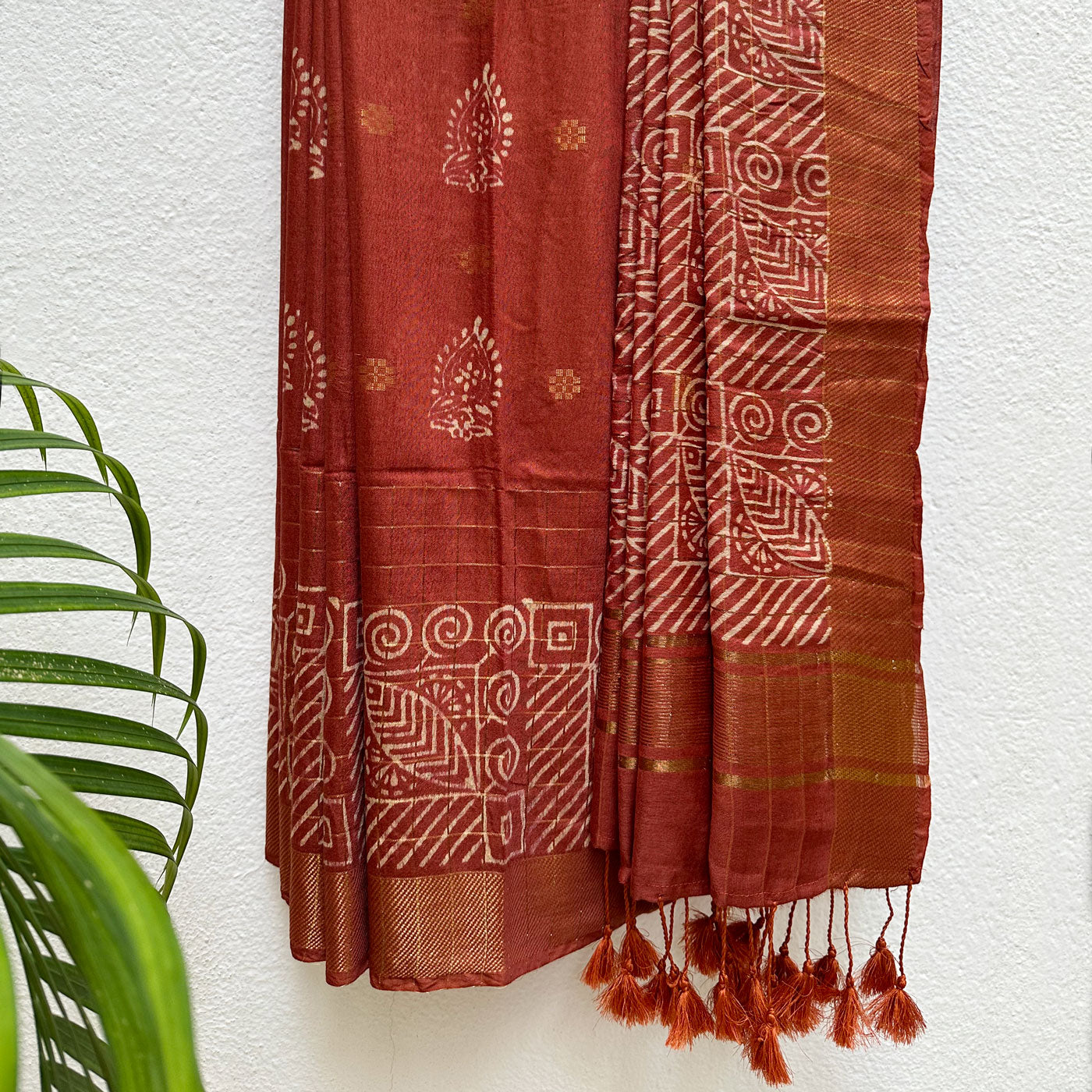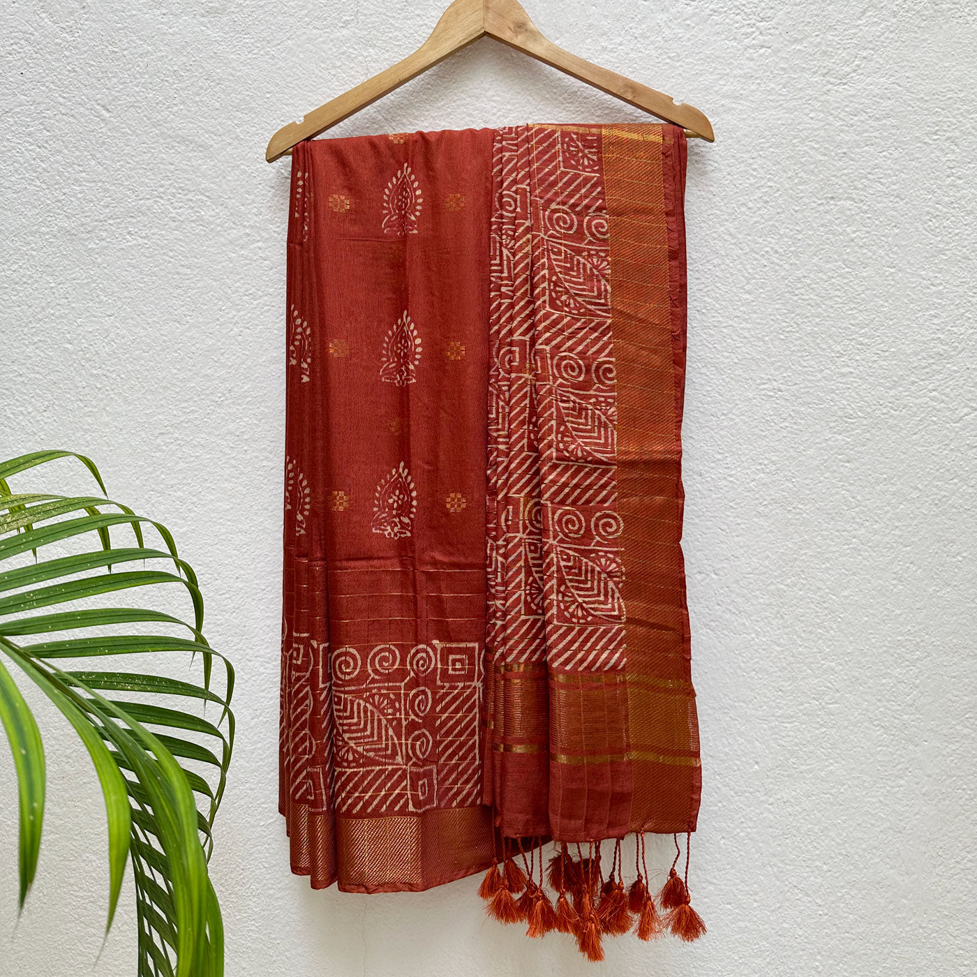 Enhance your wardrobe with this beautiful cotton-silk saree, designed with a classic gold stripe border accented by an attractive handblock chevron pattern. The delicate tassels on the pallu add a touch of elegance, while the handblock motifs, gold butas, and checks pattern throughout the saree reflect timeless beauty. Thoughtfully crafted to boost your confidence and help you leave a lasting impression, this saree is a wonderful choice for making a graceful statement at any occasion.