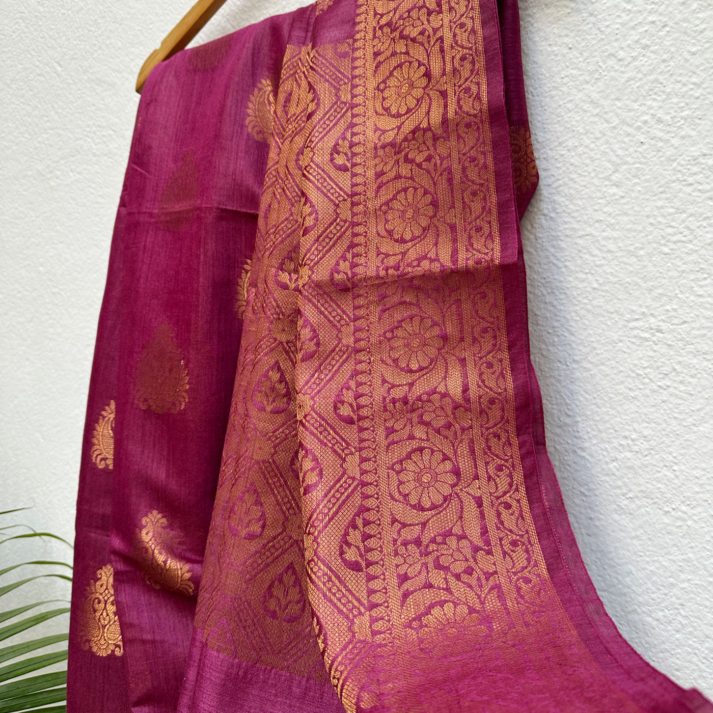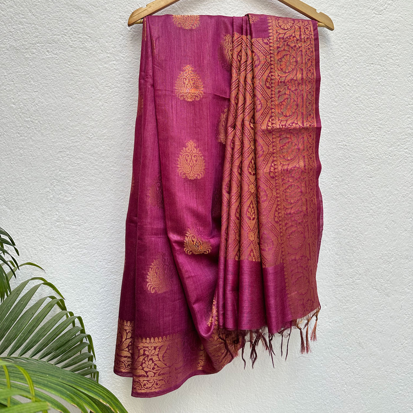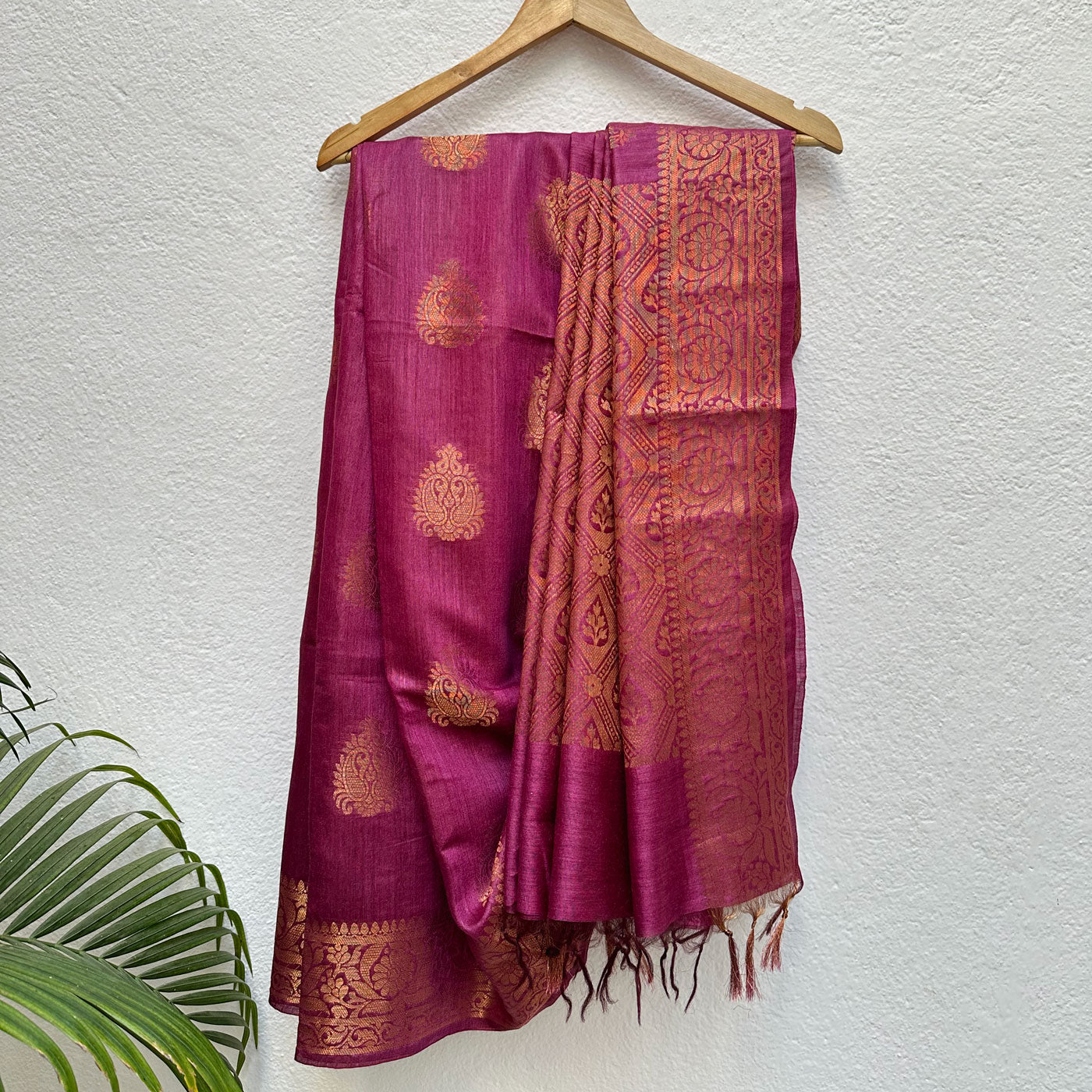 Make a statement with the gorgeous Majestic Magenta Pure Tussar Jacquard Silk Saree. Its lavish border and pallu are adorned with intricate designs, radiating elegance and grace. The subtle butis on the fabric add a touch of charm, ideal for spontaneous dinners with family or for dressing up for weddings, celebrations, and noteworthy gatherings.