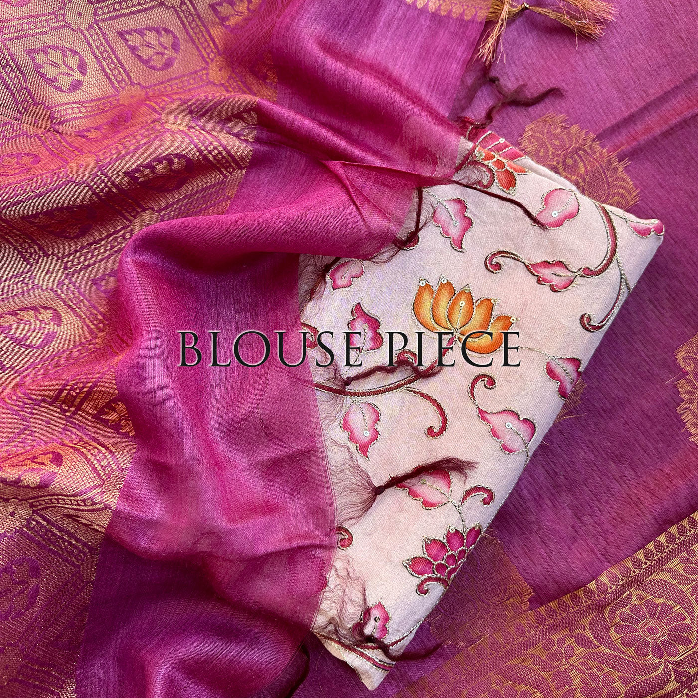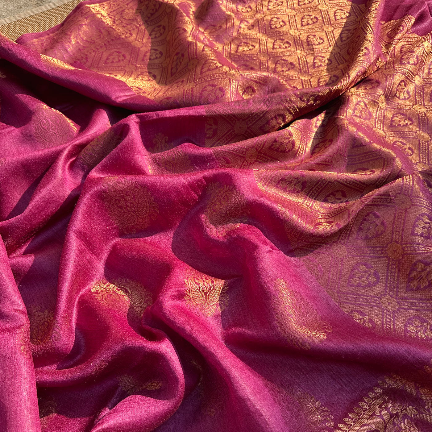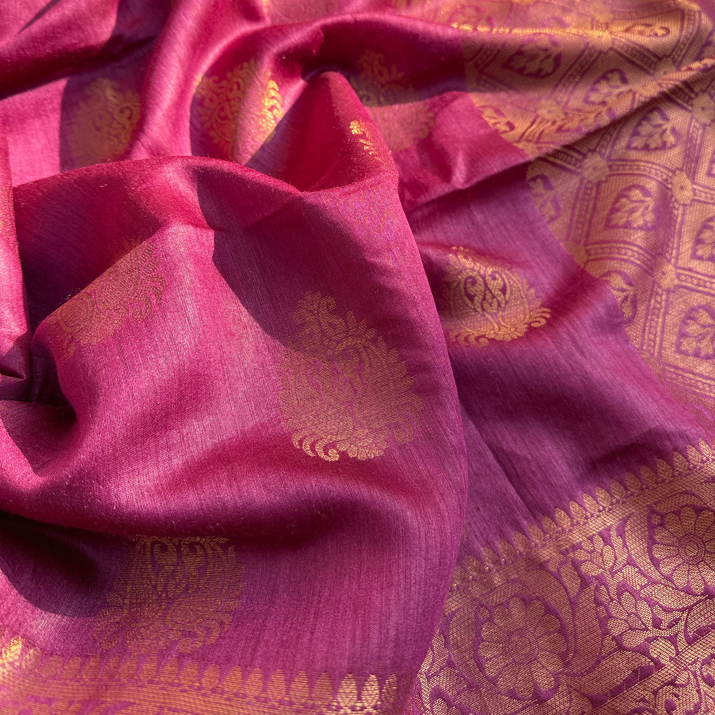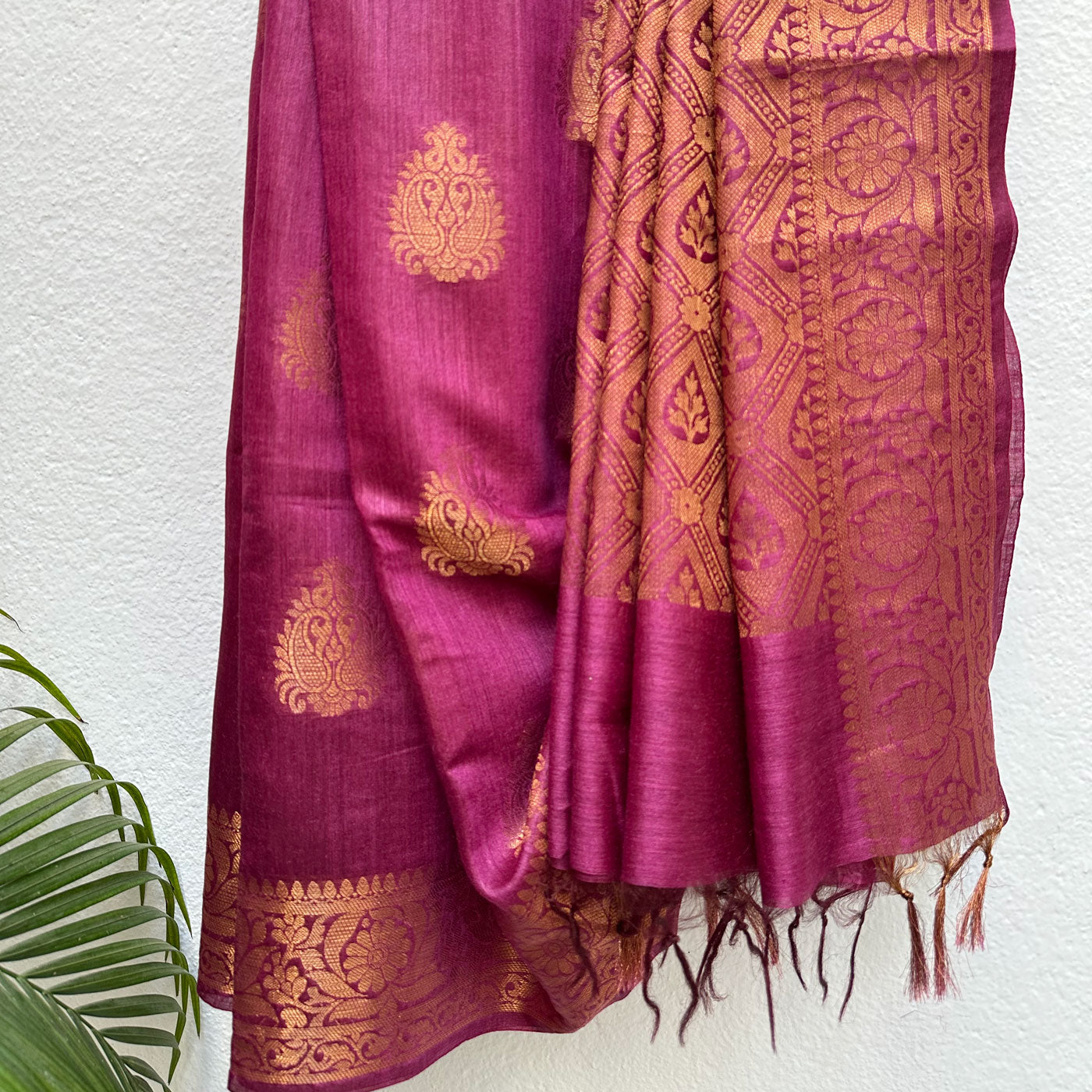 Make a statement with the gorgeous Majestic Magenta Pure Tussar Jacquard Silk Saree. Its lavish border and pallu are adorned with intricate designs, radiating elegance and grace. The subtle butis on the fabric add a touch of charm, ideal for spontaneous dinners with family or for dressing up for weddings, celebrations, and noteworthy gatherings.