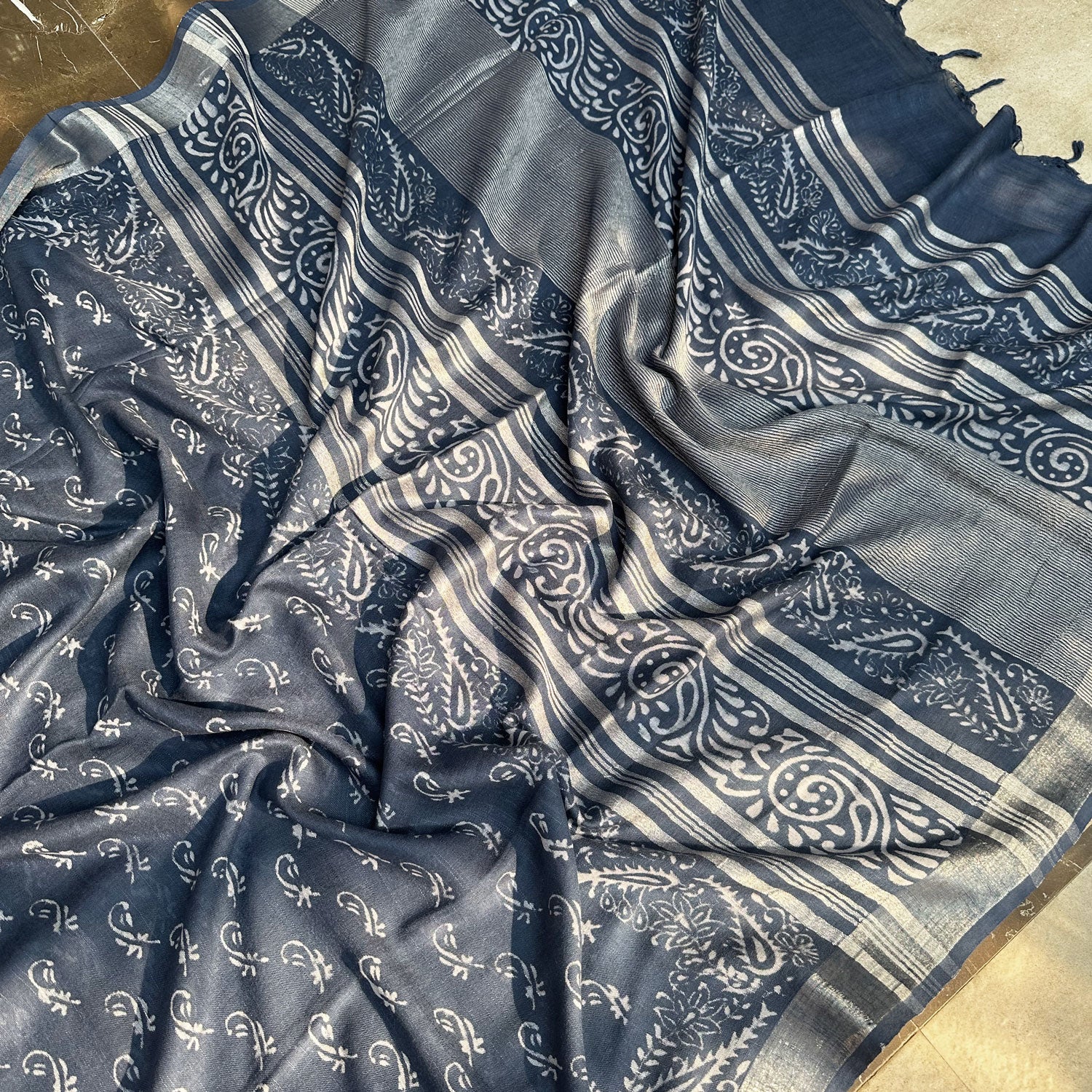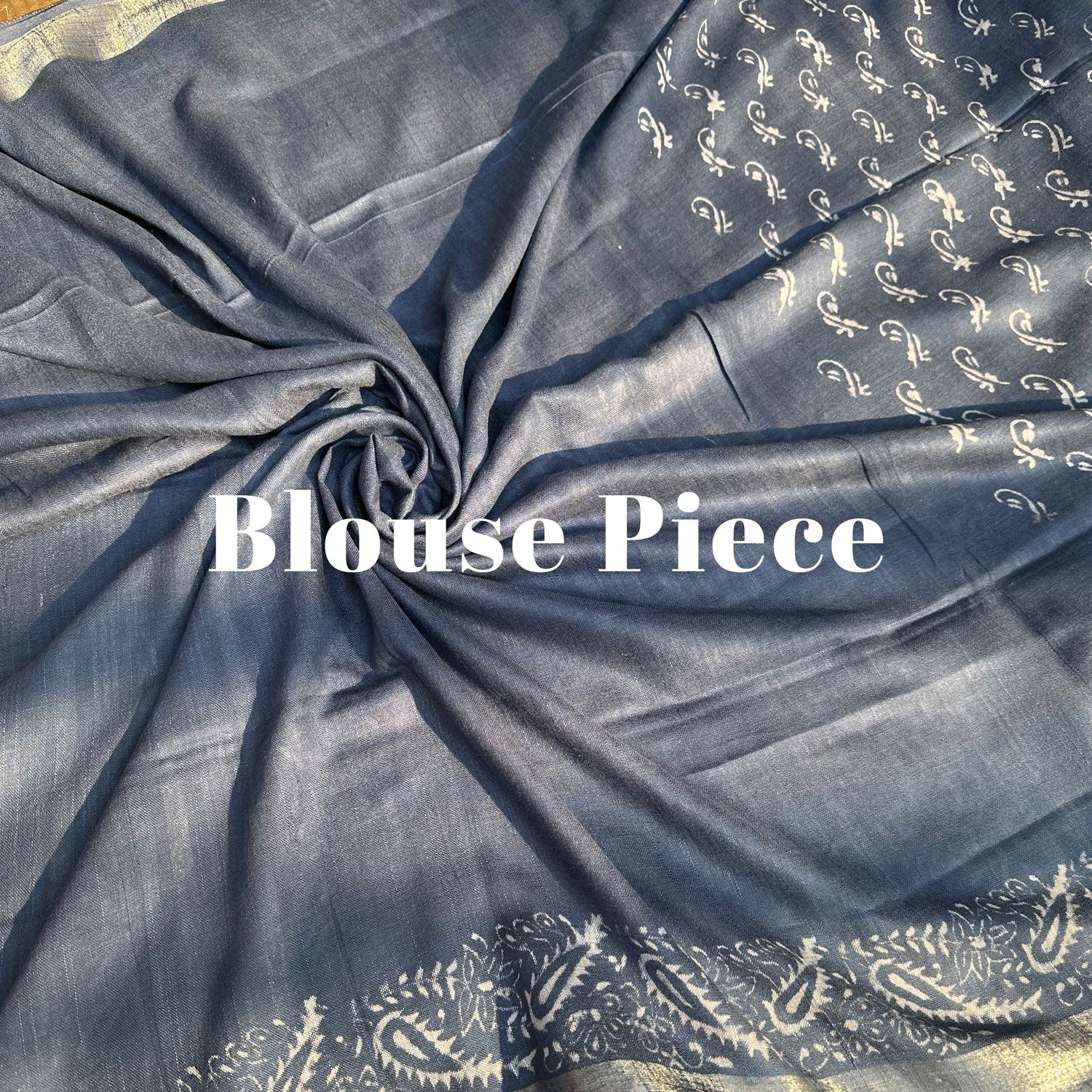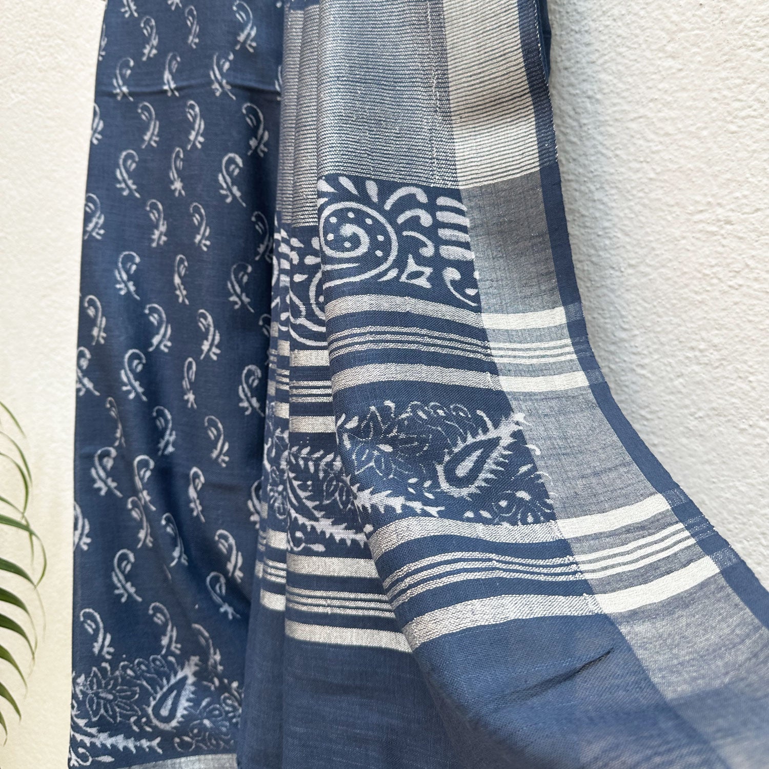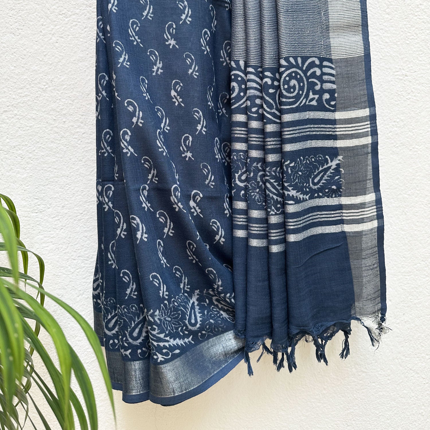 Step into the world of traditional elegance with the Manah Indigo Hand Block Cotton Linen Saree. The stunning floral looking pattern on the indigo base will brighten any dull day. The intricate paisley design on the zari border adds an artistic touch, while the complementary ornamental pattern on the pallu completes the look of luxury. Ready to make a statement? Need we say more?