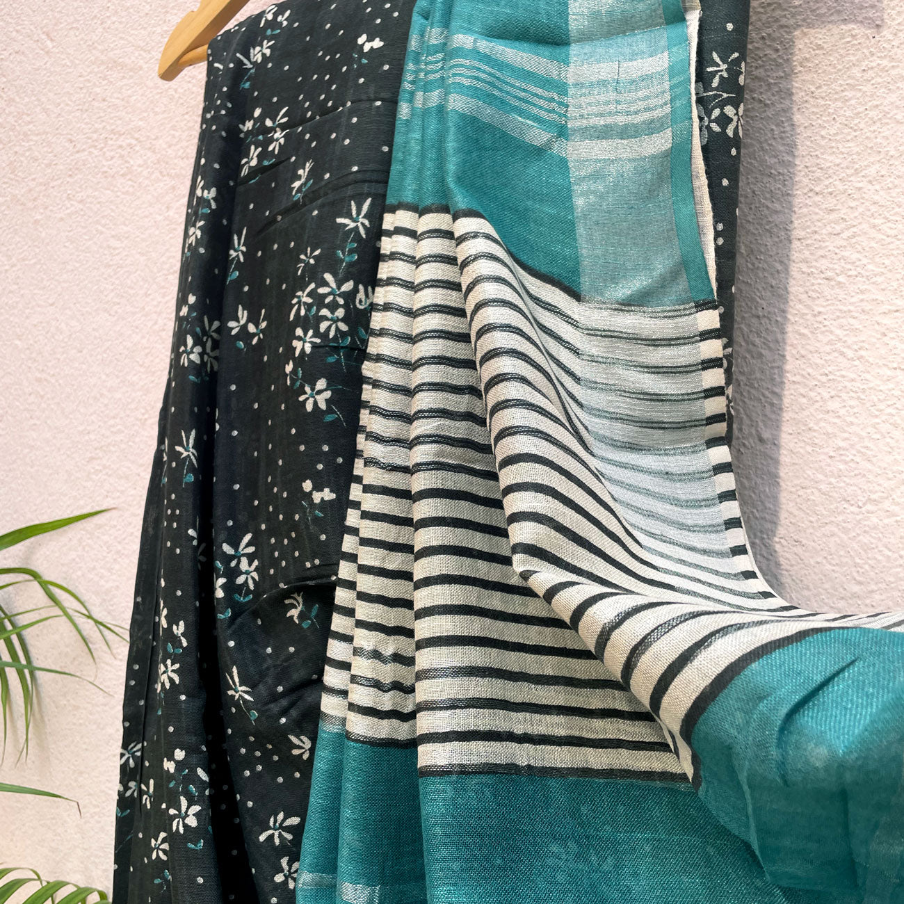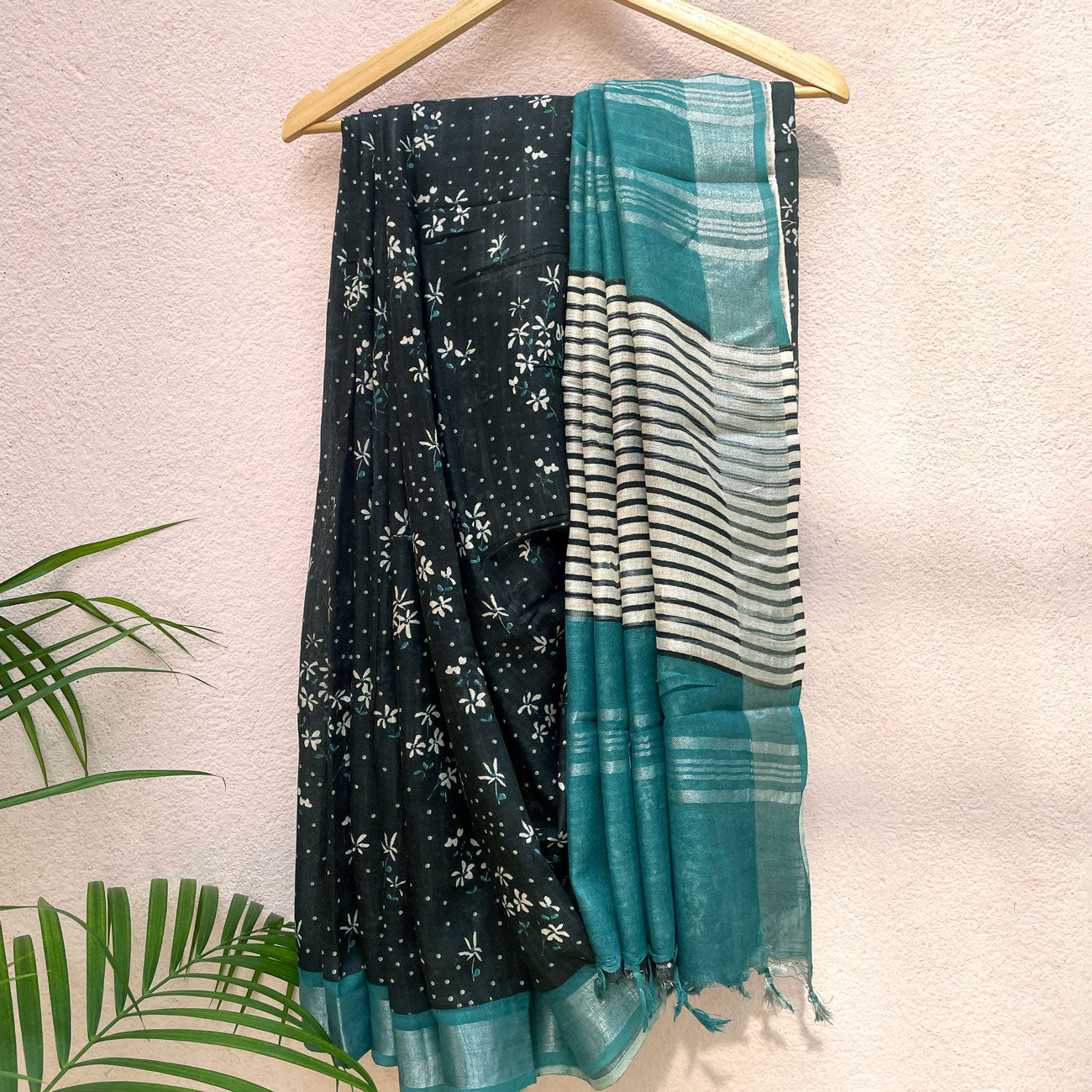 Beautiful dainty floral prints on a midnight Black base with contrasting zari border will surely be a hit with everyone. The striped pallu with zari work completes the entire look for this drape.